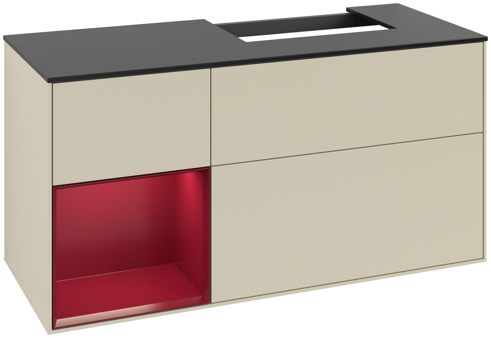 Finion Modulo bajo, con iluminación, 3 compartimentos extraíbles, 1200x603x501mm, Cuerpo: Silk Grey Matt Lacquer, Frontal: Silk Grey Matt Lacquer, Estante: Peony Matt Lacquer, Placa de cubierta: Glass Black Matt