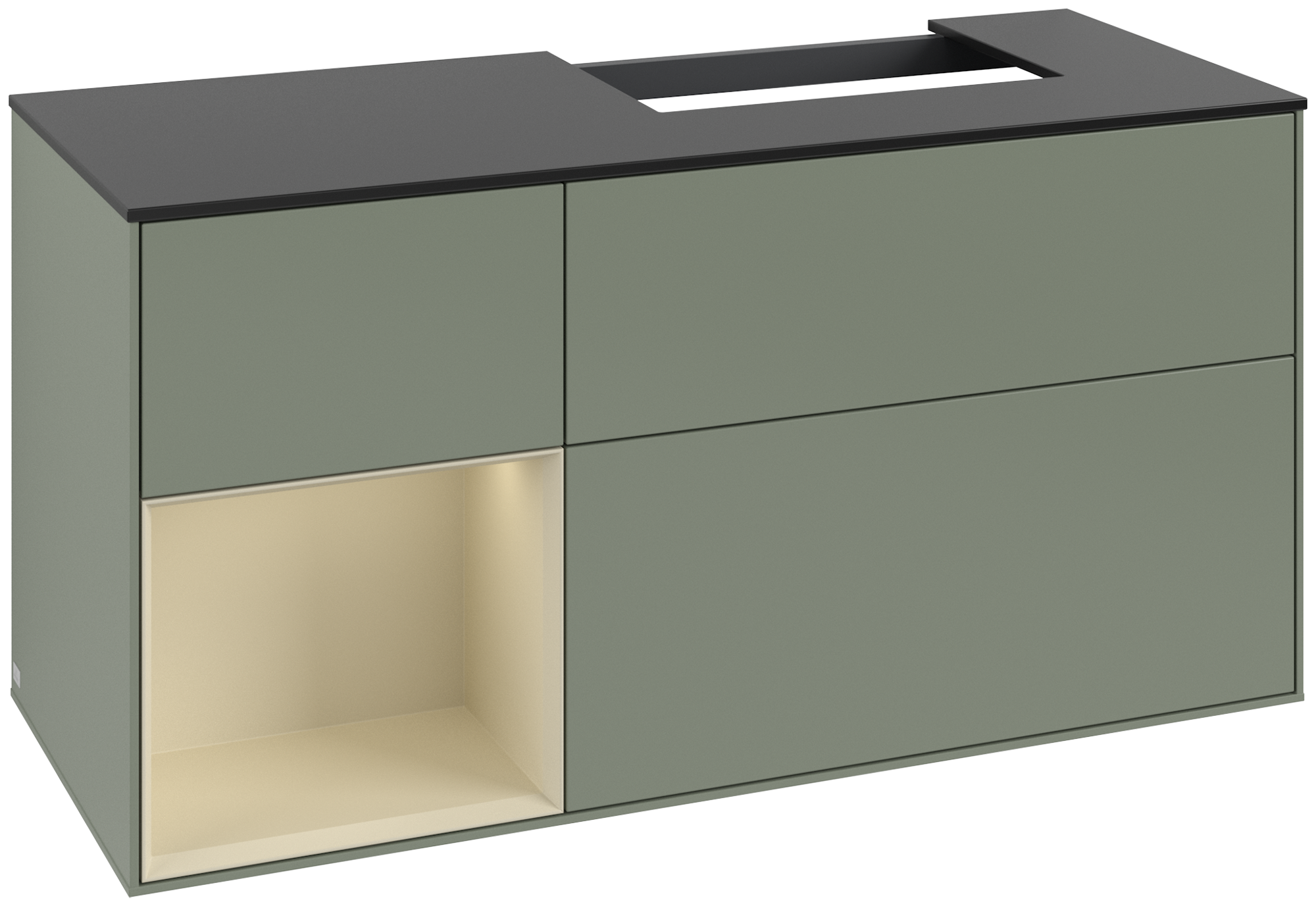 Finion Modulo bajo, con iluminación, 3 compartimentos extraíbles, 1200x603x501mm, Cuerpo: Olive Matt Lacquer, Frontal: Olive Matt Lacquer, Estante: Silk Grey Matt Lacquer, Placa de cubierta: Glass Black Matt