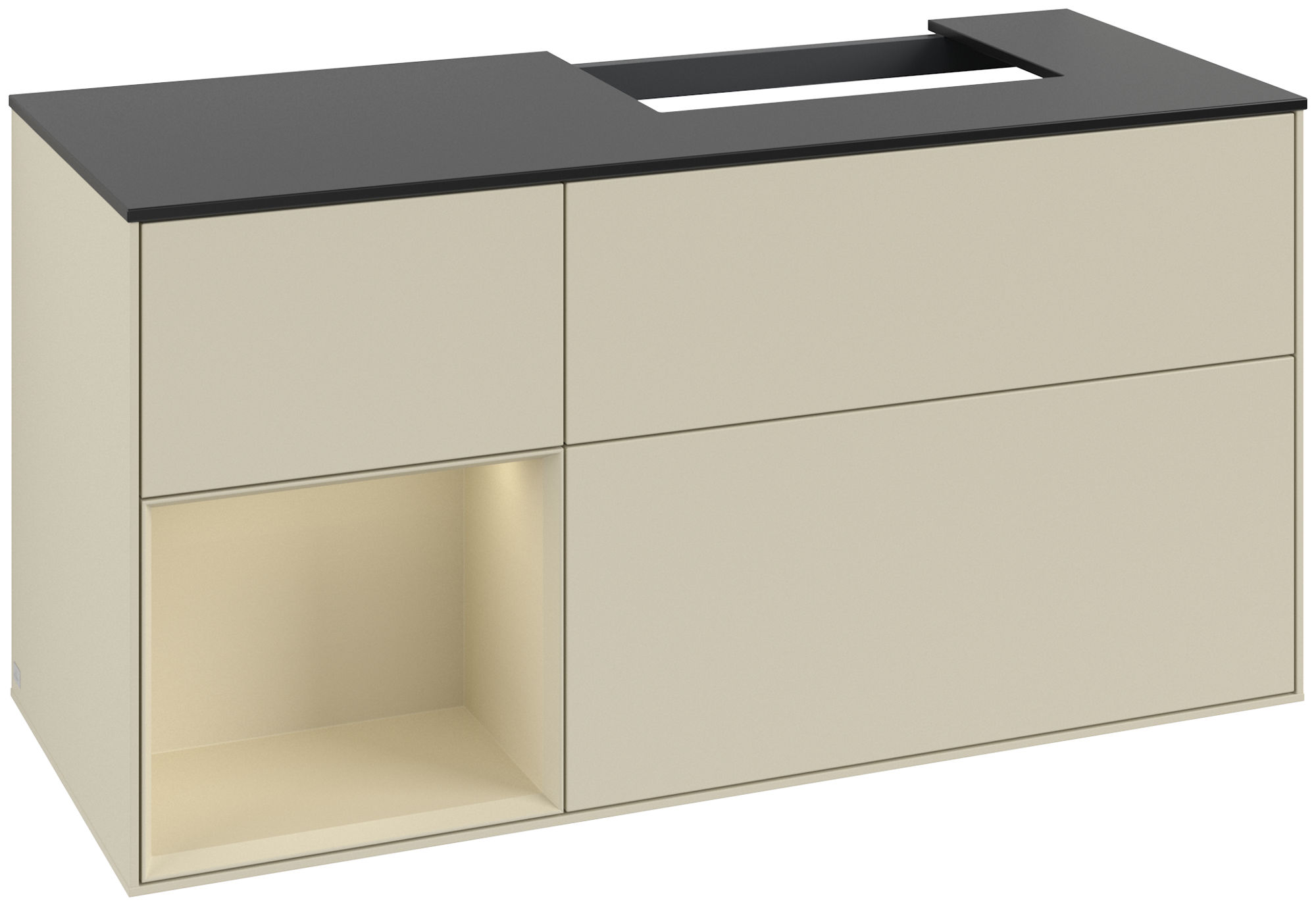 Finion Modulo bajo, con iluminación, 3 compartimentos extraíbles, 1200x603x501mm, Cuerpo: Silk Grey Matt Lacquer, Frontal: Silk Grey Matt Lacquer, Estante: Silk Grey Matt Lacquer, Placa de cubierta: Glass Black Matt
