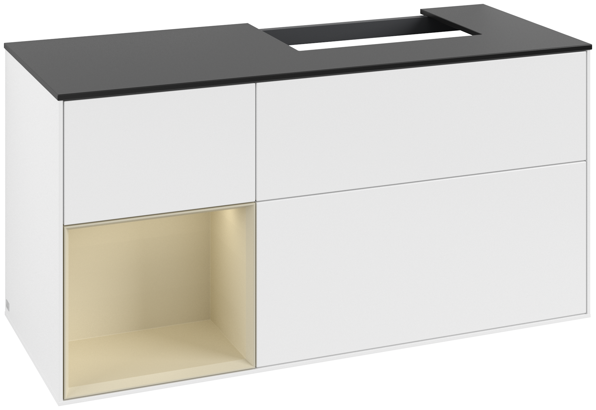 Finion Modulo bajo, con iluminación, 3 compartimentos extraíbles, 1200x603x501mm, Cuerpo: White Matt Lacquer, Frontal: White Matt Lacquer, Estante: Silk Grey Matt Lacquer, Placa de cubierta: Glass Black Matt