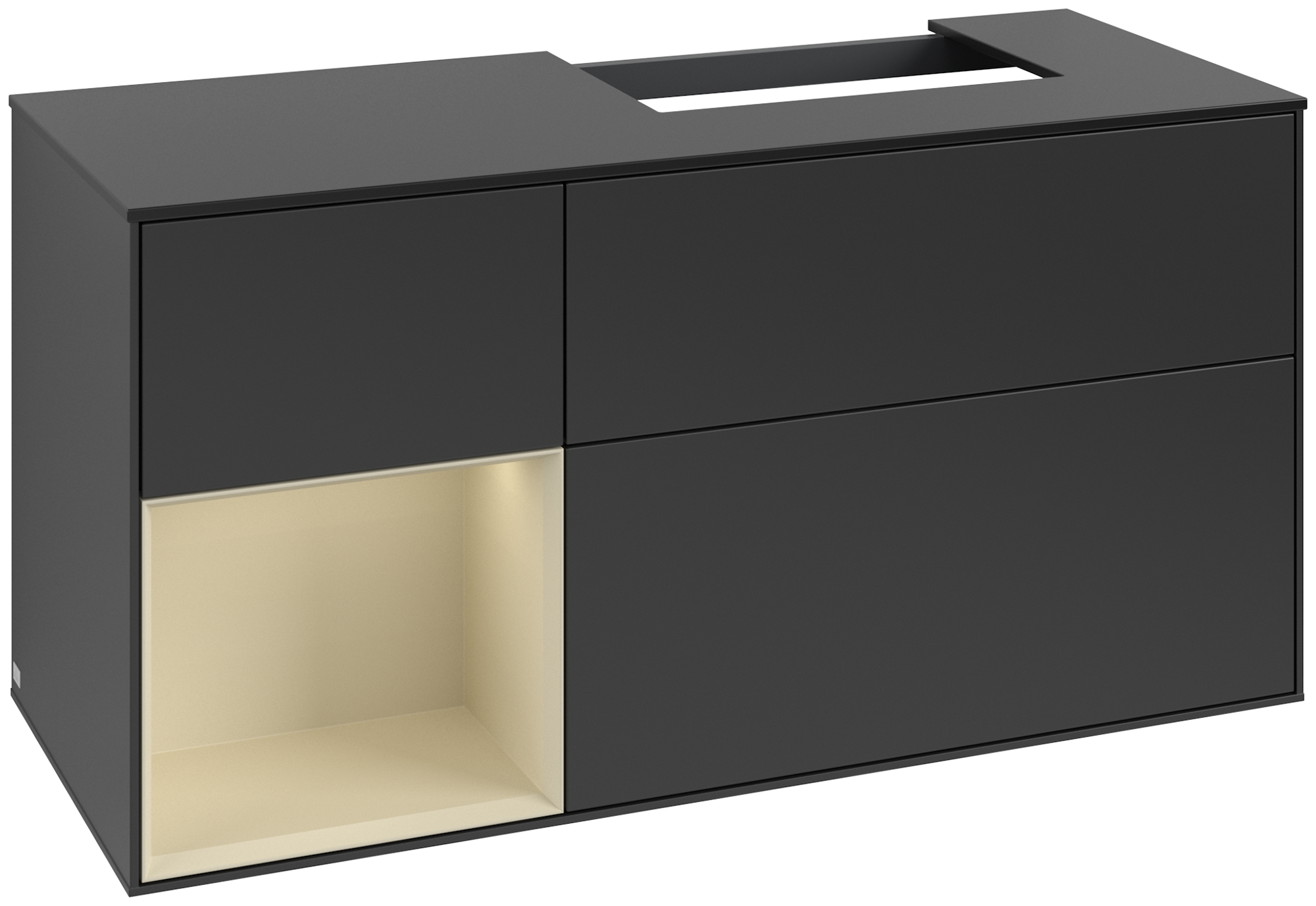 Finion Modulo bajo, con iluminación, 3 compartimentos extraíbles, 1200x603x501mm, Cuerpo: Black Matt Lacquer, Frontal: Black Matt Lacquer, Estante: Silk Grey Matt Lacquer, Placa de cubierta: Glass Black Matt