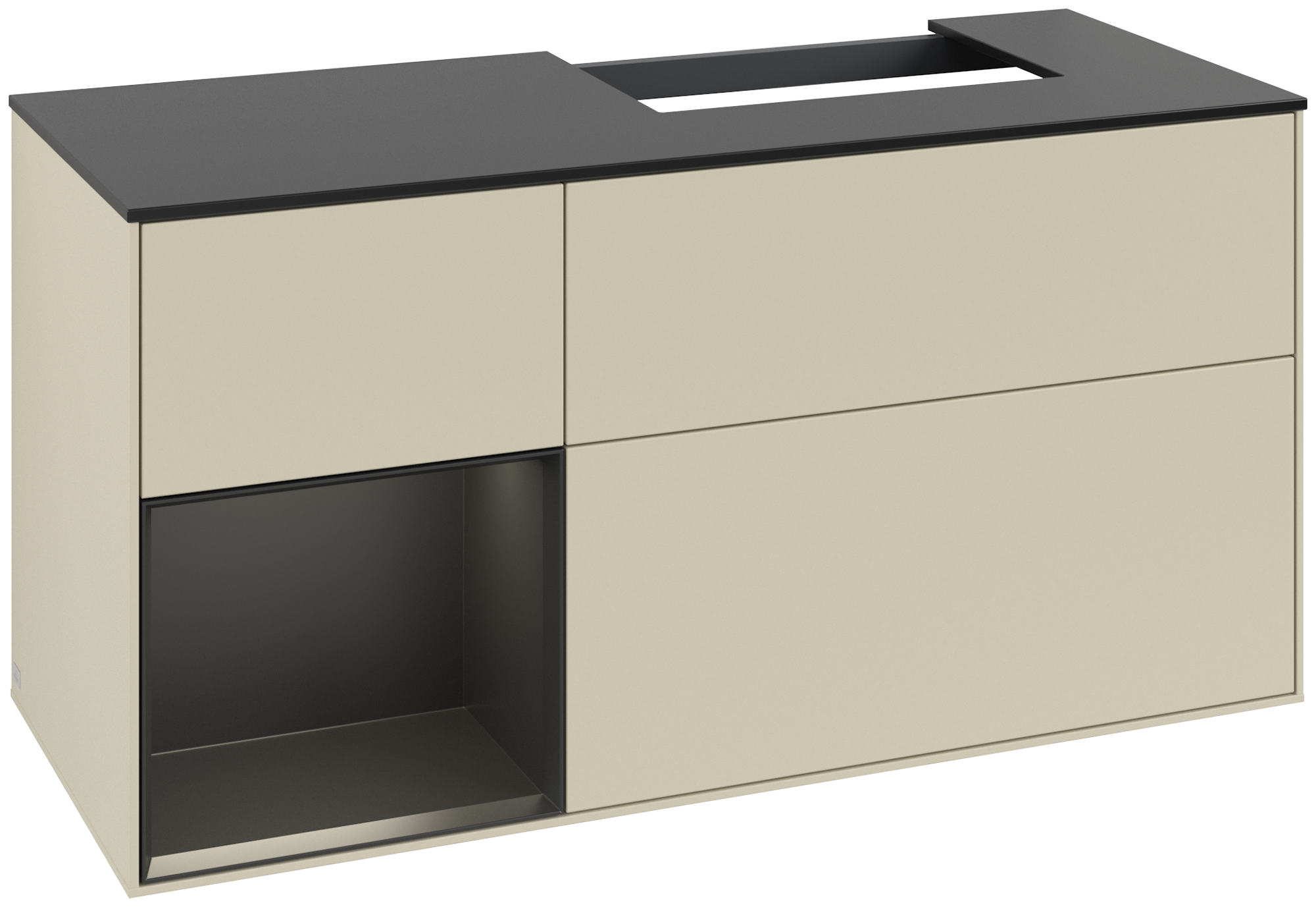 Finion Modulo bajo, con iluminación, 3 compartimentos extraíbles, 1200x603x501mm, Cuerpo: Silk Grey Matt Lacquer, Frontal: Silk Grey Matt Lacquer, Estante: Black Matt Lacquer, Placa de cubierta: Glass Black Matt