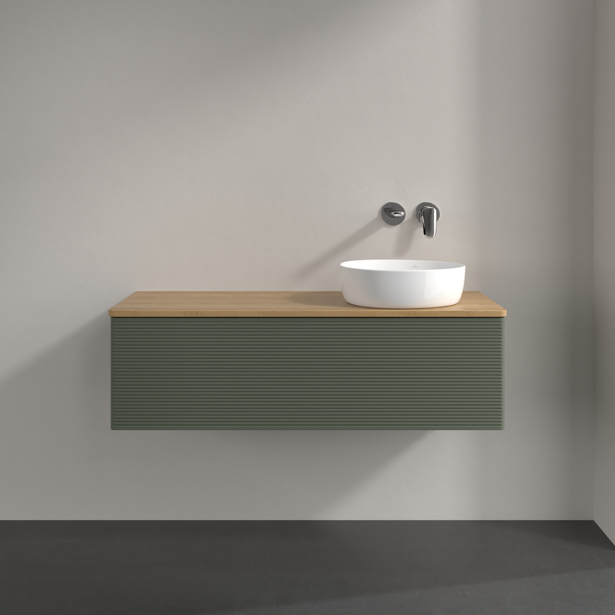 Antao Meuble sous plan, 1 tiroir sur rails, 1200x360x500mm, Façade avec structure, Caisson: Leaf Green Matt Lacquer, Façade: Leaf Green Matt Lacquer, Plaque de recouvrement: Honey Oak