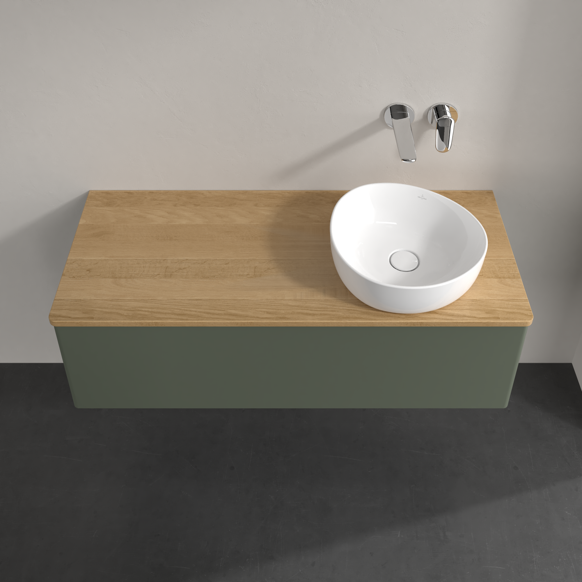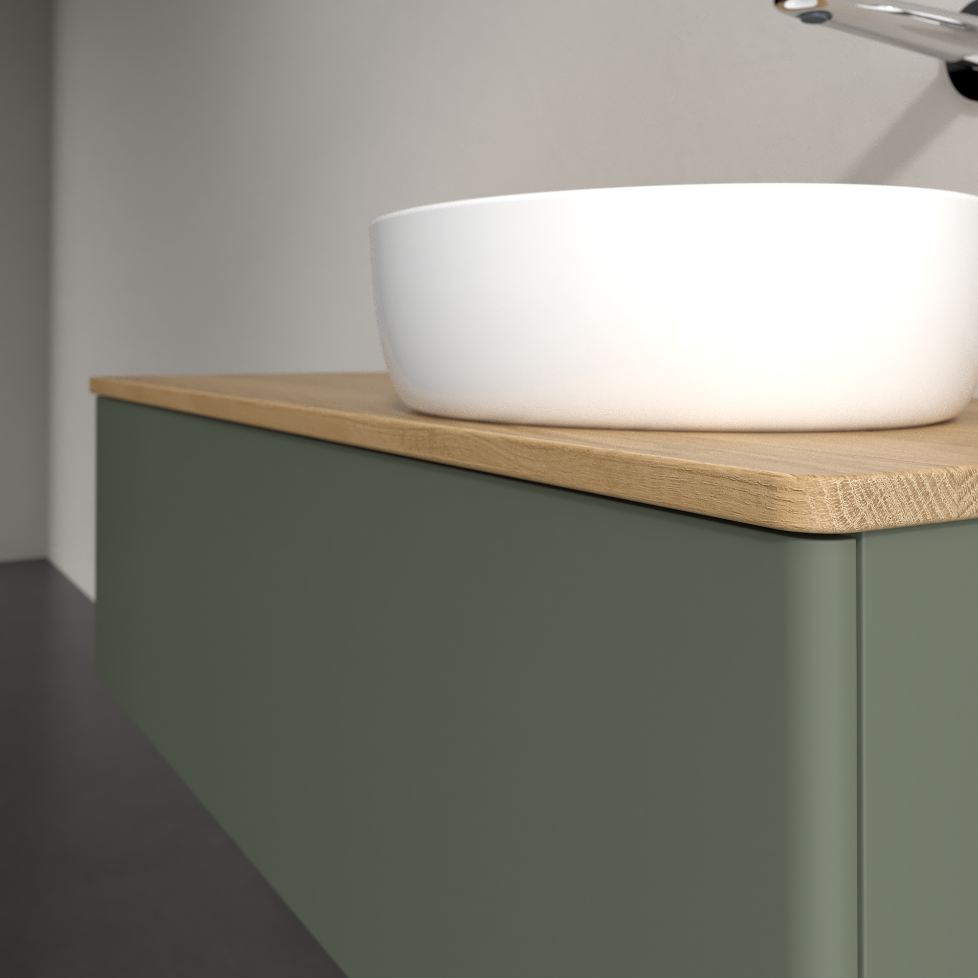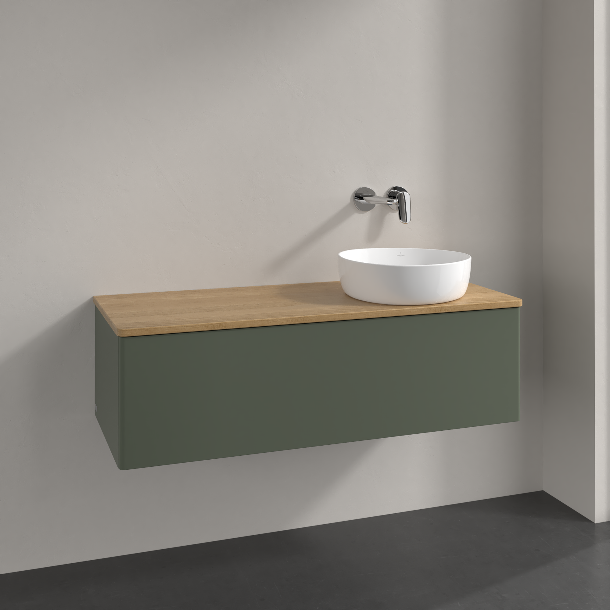 Antao Meuble sous plan, avec éclairage, 1 tiroir sur rails, 1200x360x500mm, Façade sans structure, Caisson: Leaf Green Matt Lacquer, Façade: Leaf Green Matt Lacquer, Plaque de recouvrement: Honey Oak
