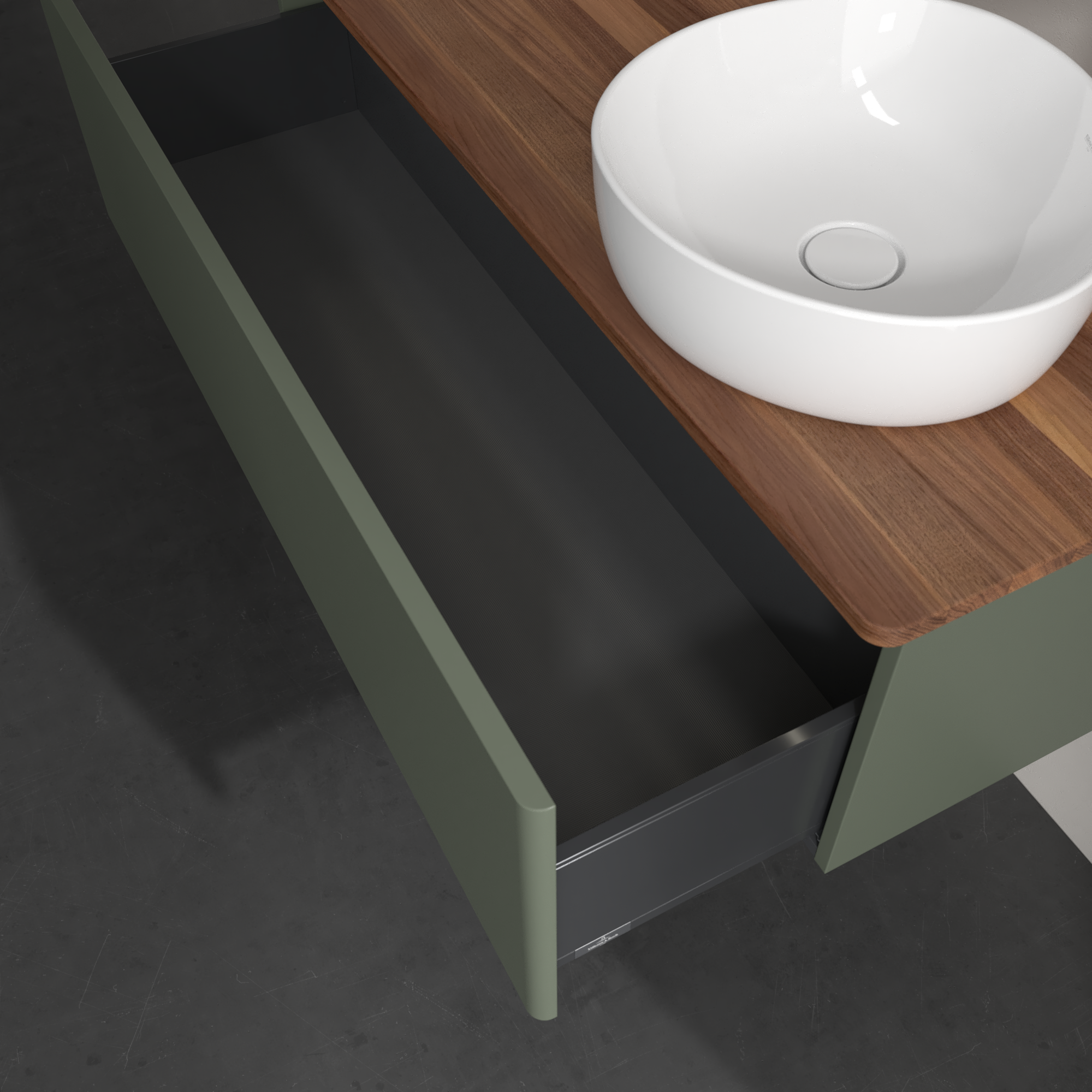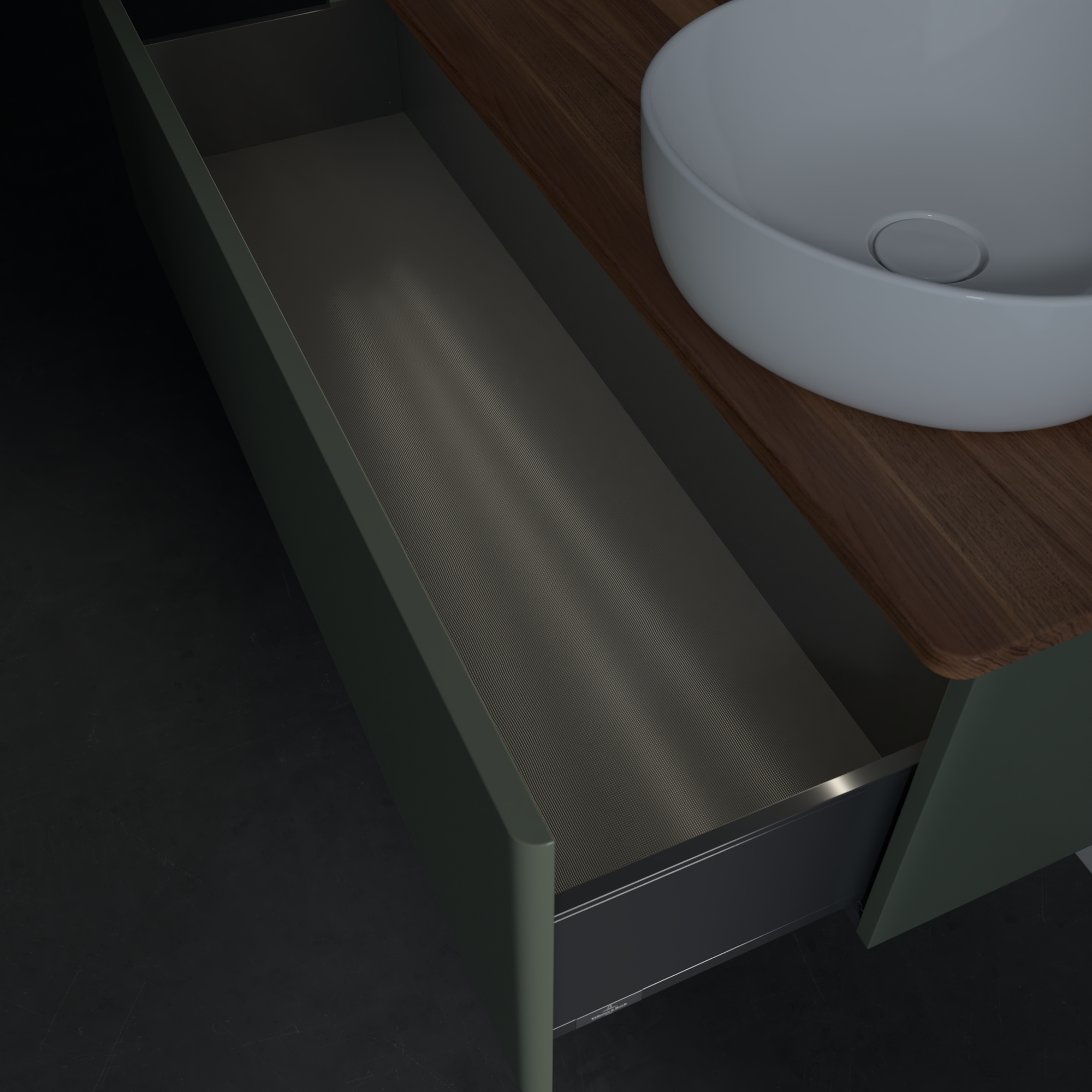 Antao Meuble sous plan, avec éclairage, 1 tiroir sur rails, 1200x360x500mm, Façade sans structure, Caisson: Leaf Green Matt Lacquer, Façade: Leaf Green Matt Lacquer, Plaque de recouvrement: Warm Walnut