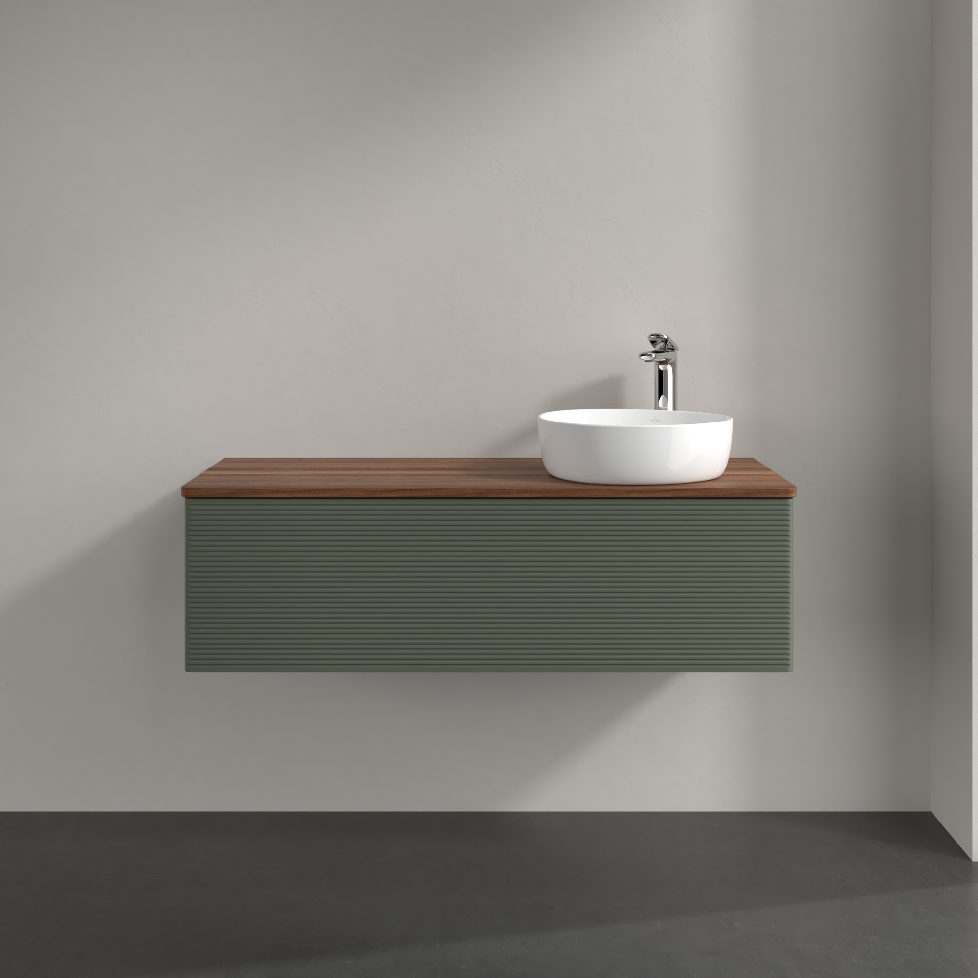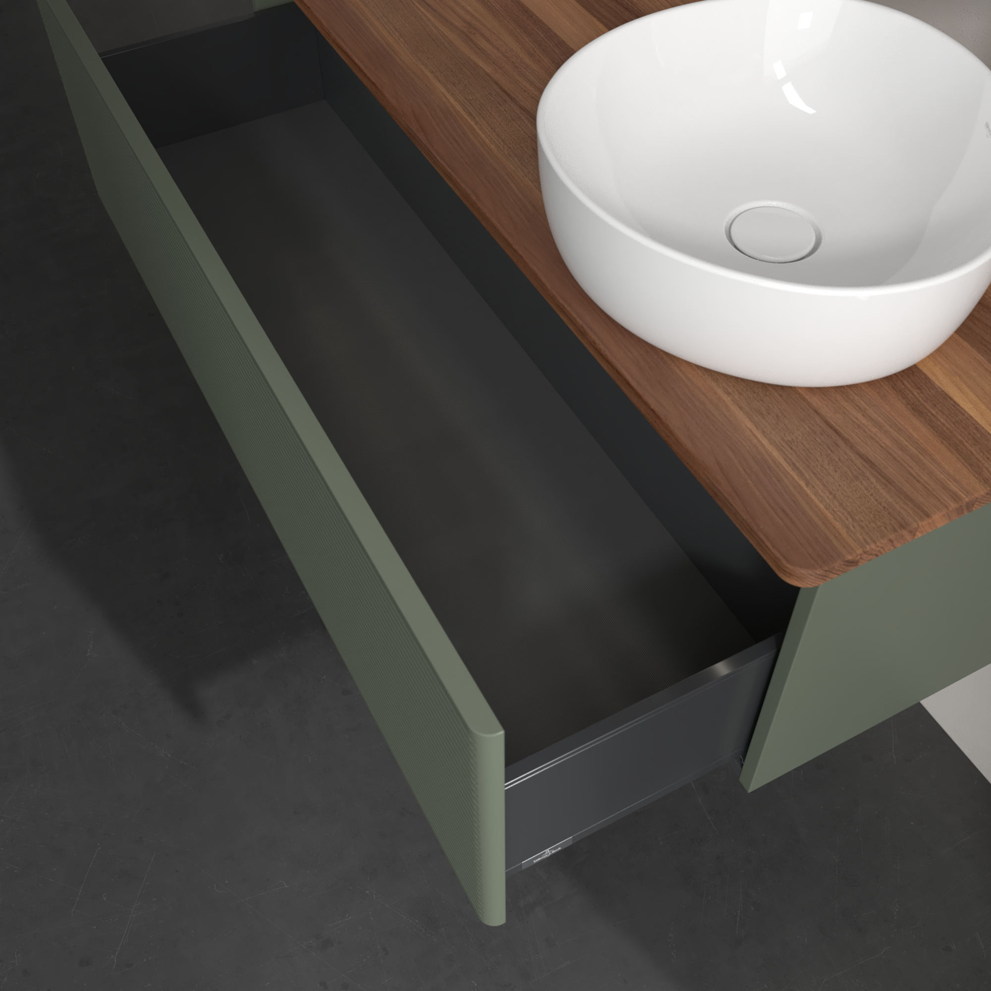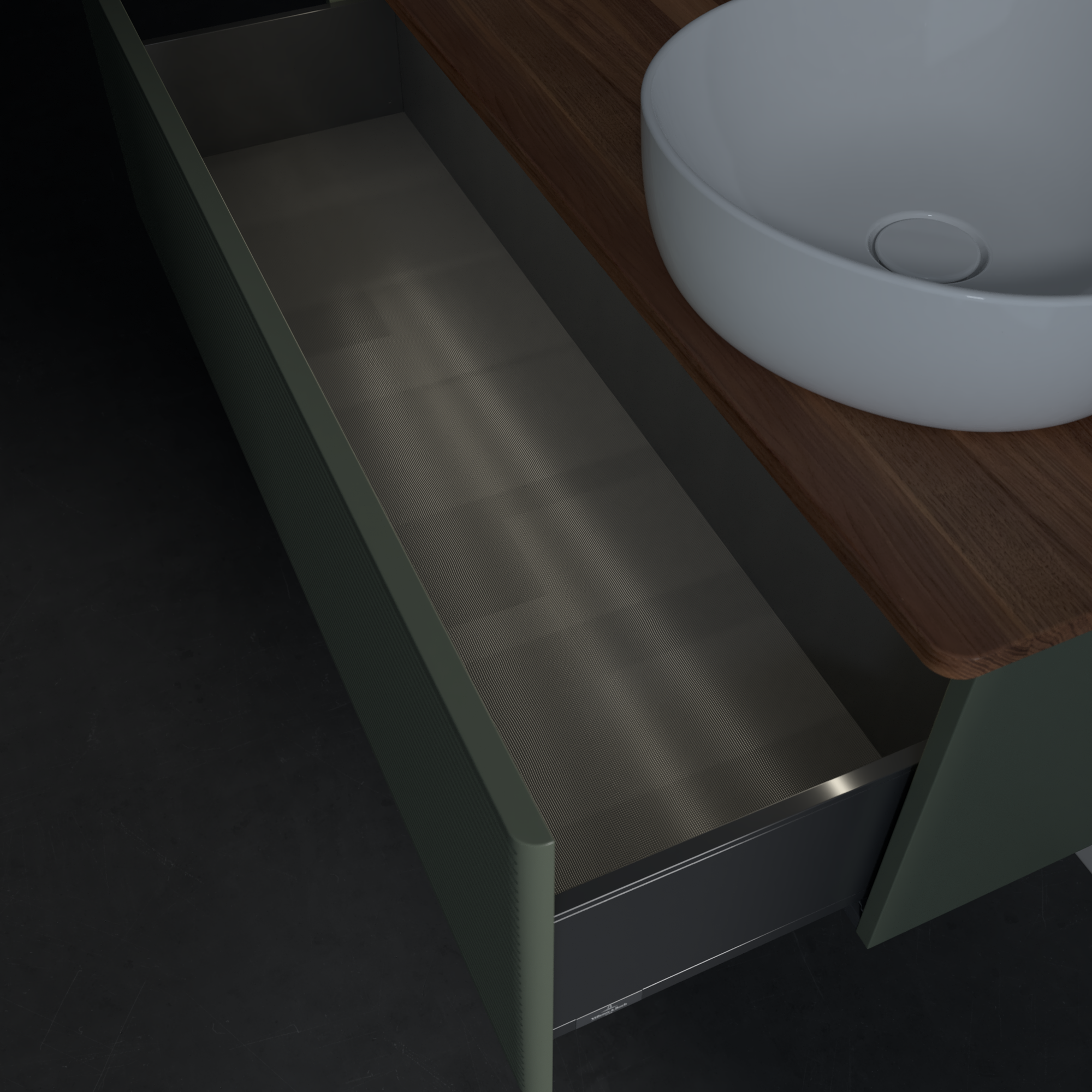 Antao Meuble sous plan, avec éclairage, 1 tiroir sur rails, 1200x360x500mm, Façade avec structure, Caisson: Leaf Green Matt Lacquer, Façade: Leaf Green Matt Lacquer, Plaque de recouvrement: Warm Walnut