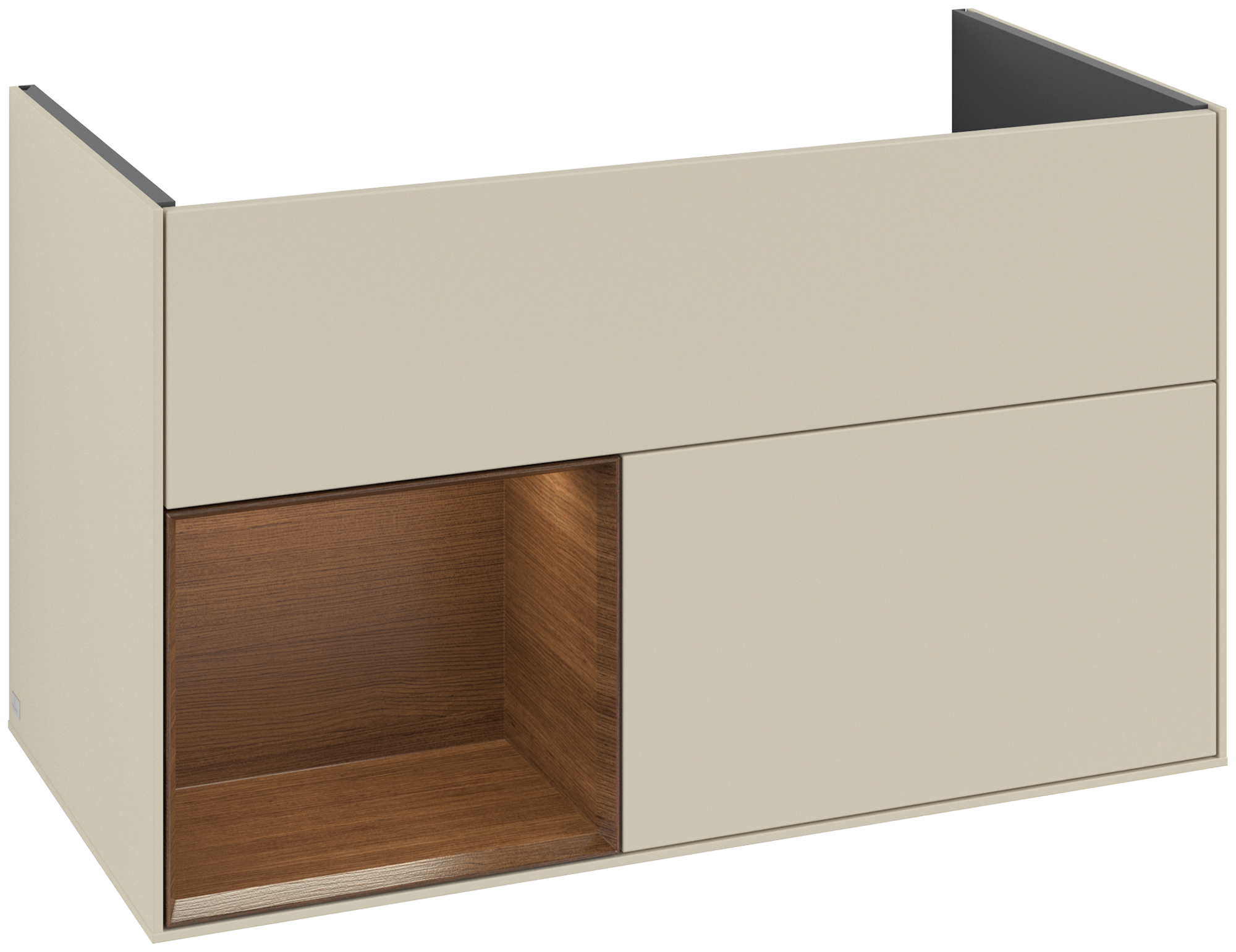 Finion Meuble sous plan, avec éclairage, 2 tiroirs sur rails, 996x591x498mm, Caisson: Silk Grey Matt Lacquer, Façade: Silk Grey Matt Lacquer, Élément d’étagère: Walnut Veneer