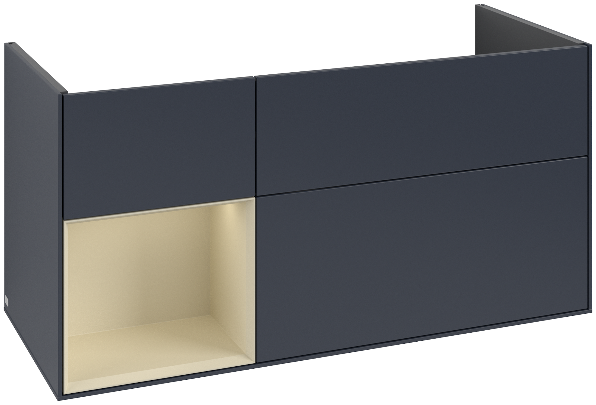Finion Meuble sous plan, avec éclairage, 3 tiroirs sur rails, 1196x591x498mm, Caisson: Midnight Blue Matt Lacquer, Façade: Midnight Blue Matt Lacquer, Élément d’étagère: Silk Grey Matt Lacquer