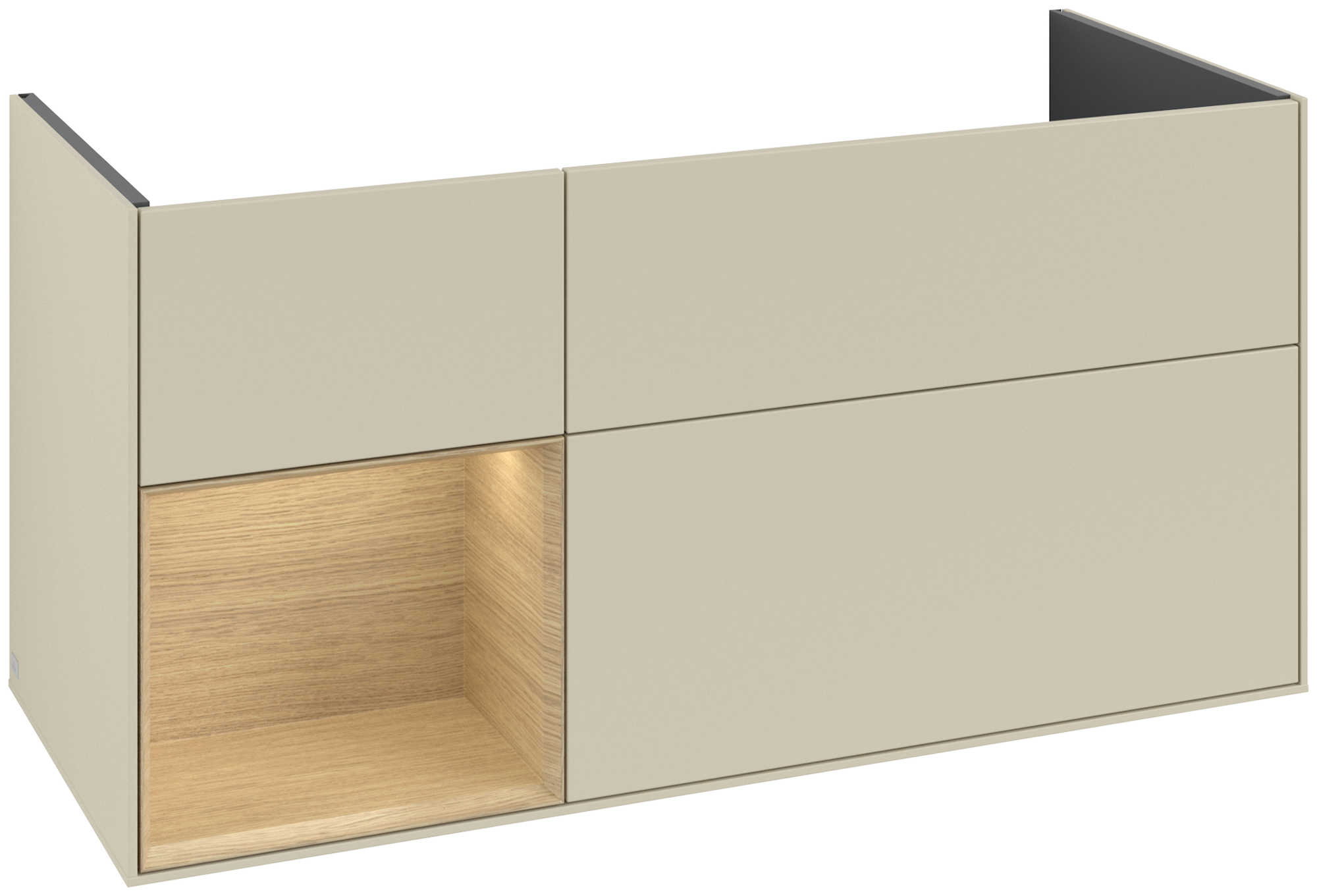 Finion Meuble sous plan, avec éclairage, 3 tiroirs sur rails, 1196x591x498mm, Caisson: Silk Grey Matt Lacquer, Façade: Silk Grey Matt Lacquer, Élément d’étagère: Oak Veneer