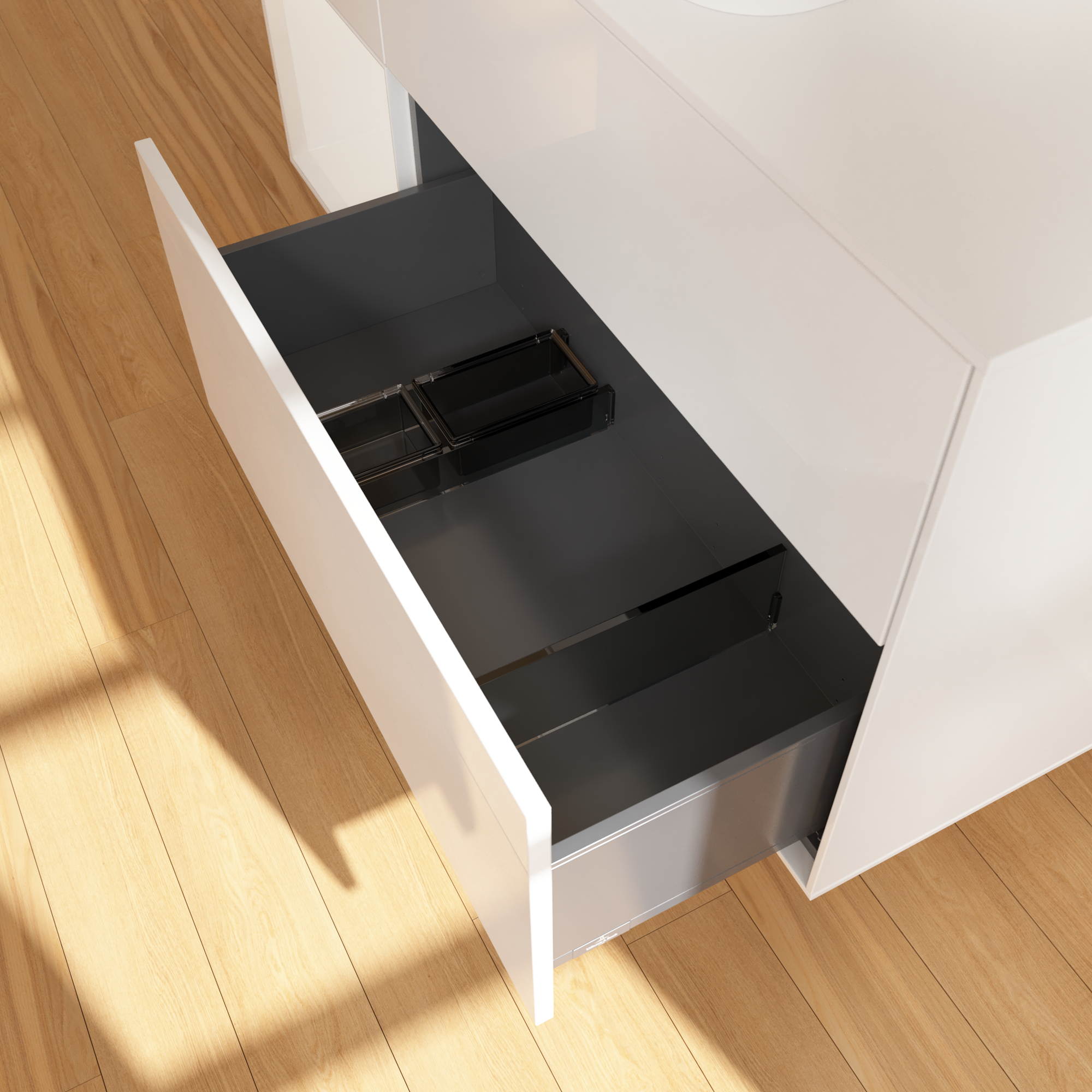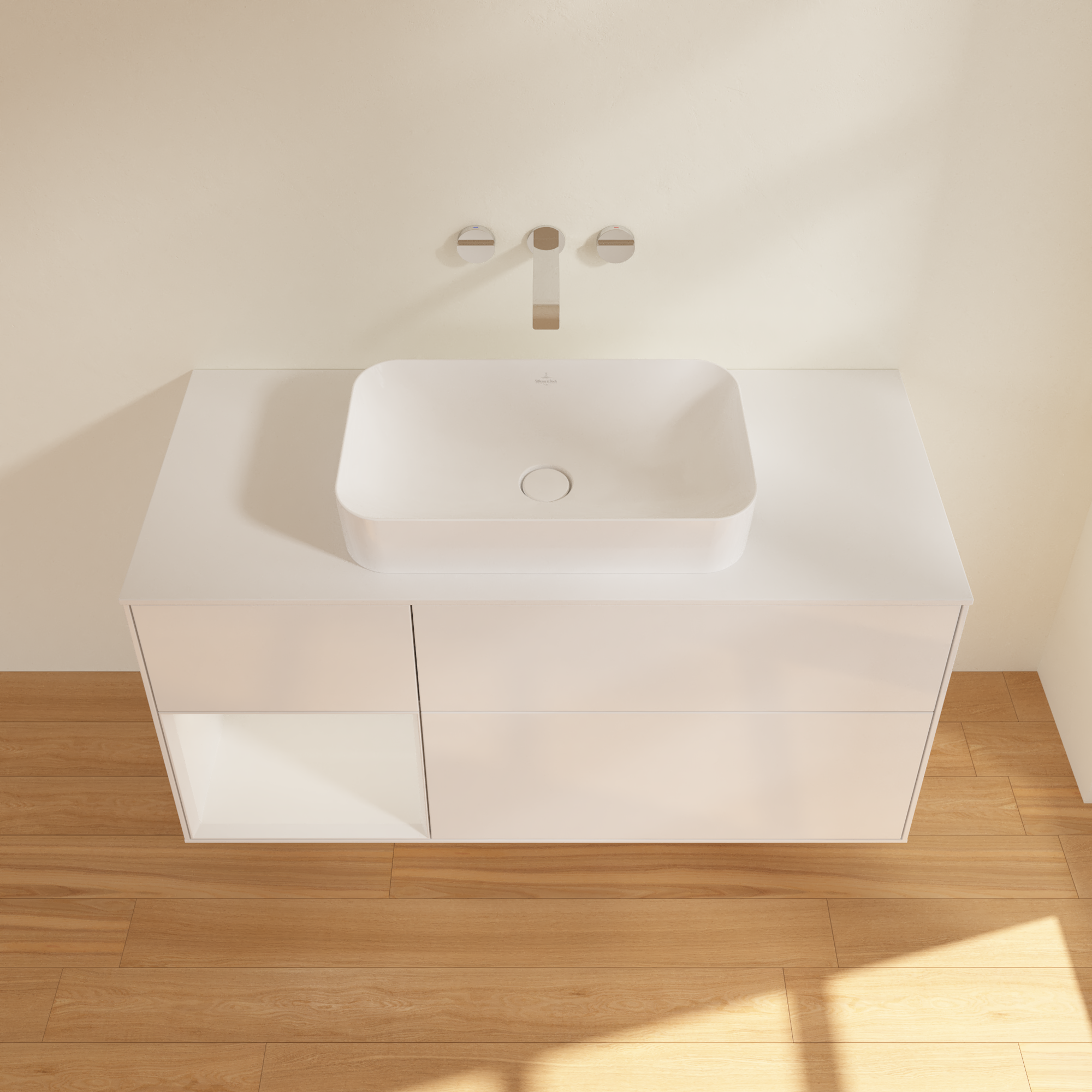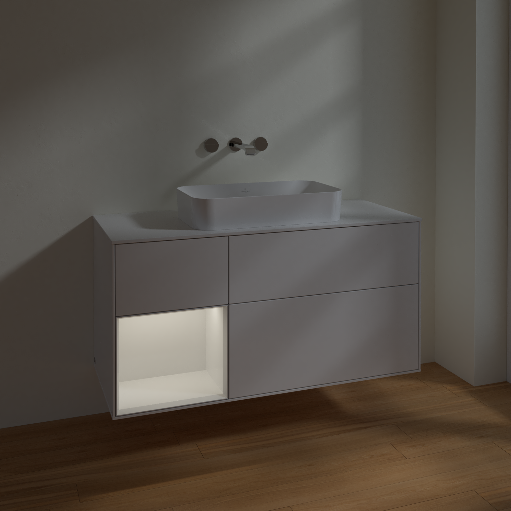 Finion Meuble sous plan, avec éclairage, 3 tiroirs sur rails, 1200x603x501mm, Caisson: Glossy White Lacquer, Façade: Glossy White Lacquer, Élément d’étagère: Glossy White Lacquer, Plaque de recouvrement: Glass White Matt