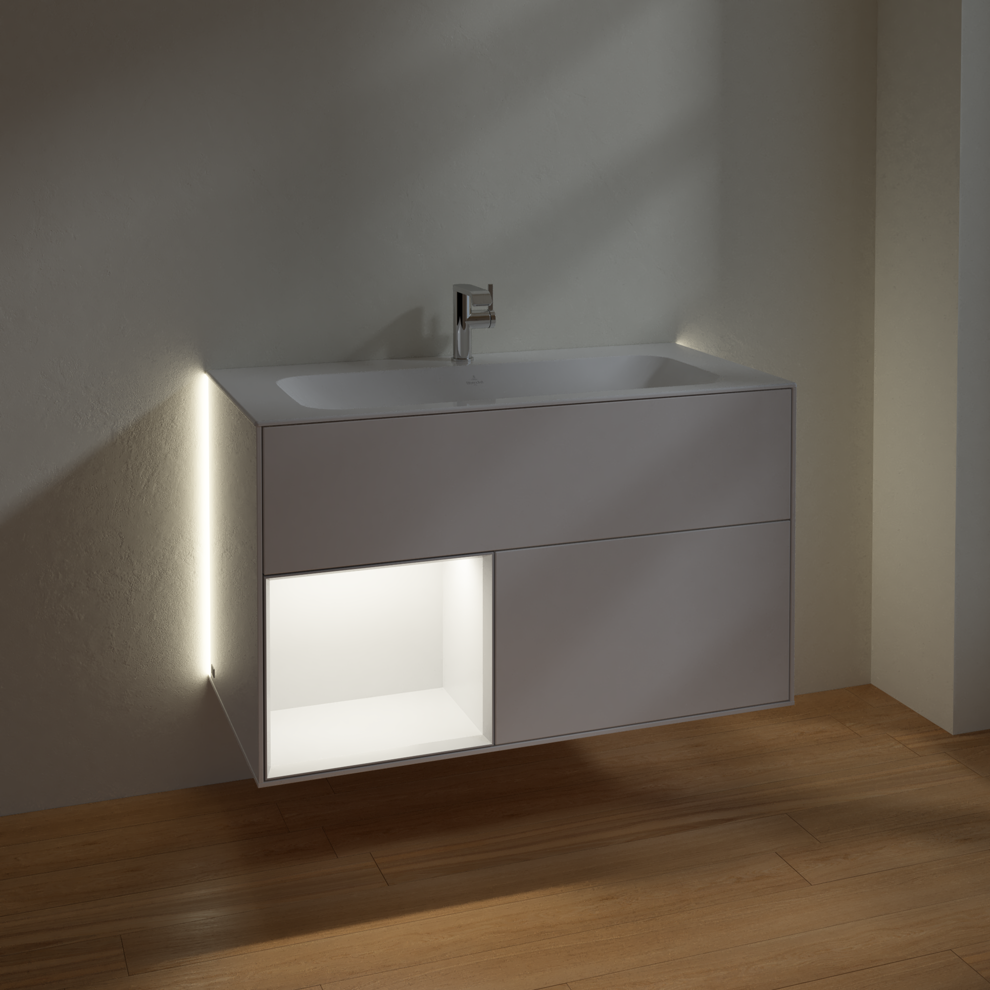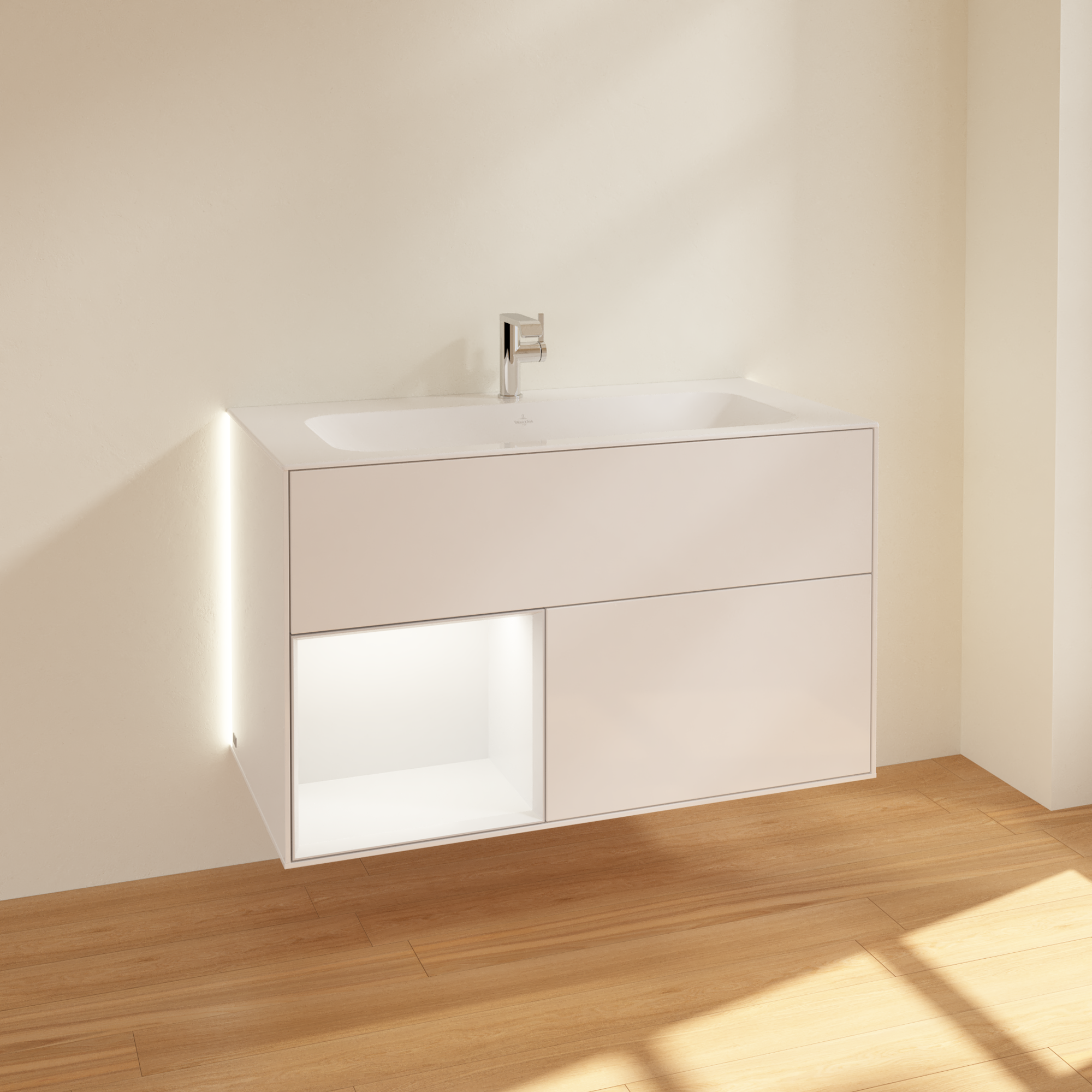 Finion Meuble sous plan, avec éclairage, 2 tiroirs sur rails, 996x591x498mm, Caisson: Glossy White Lacquer, Façade: Glossy White Lacquer, Élément d’étagère: Black Matt Lacquer