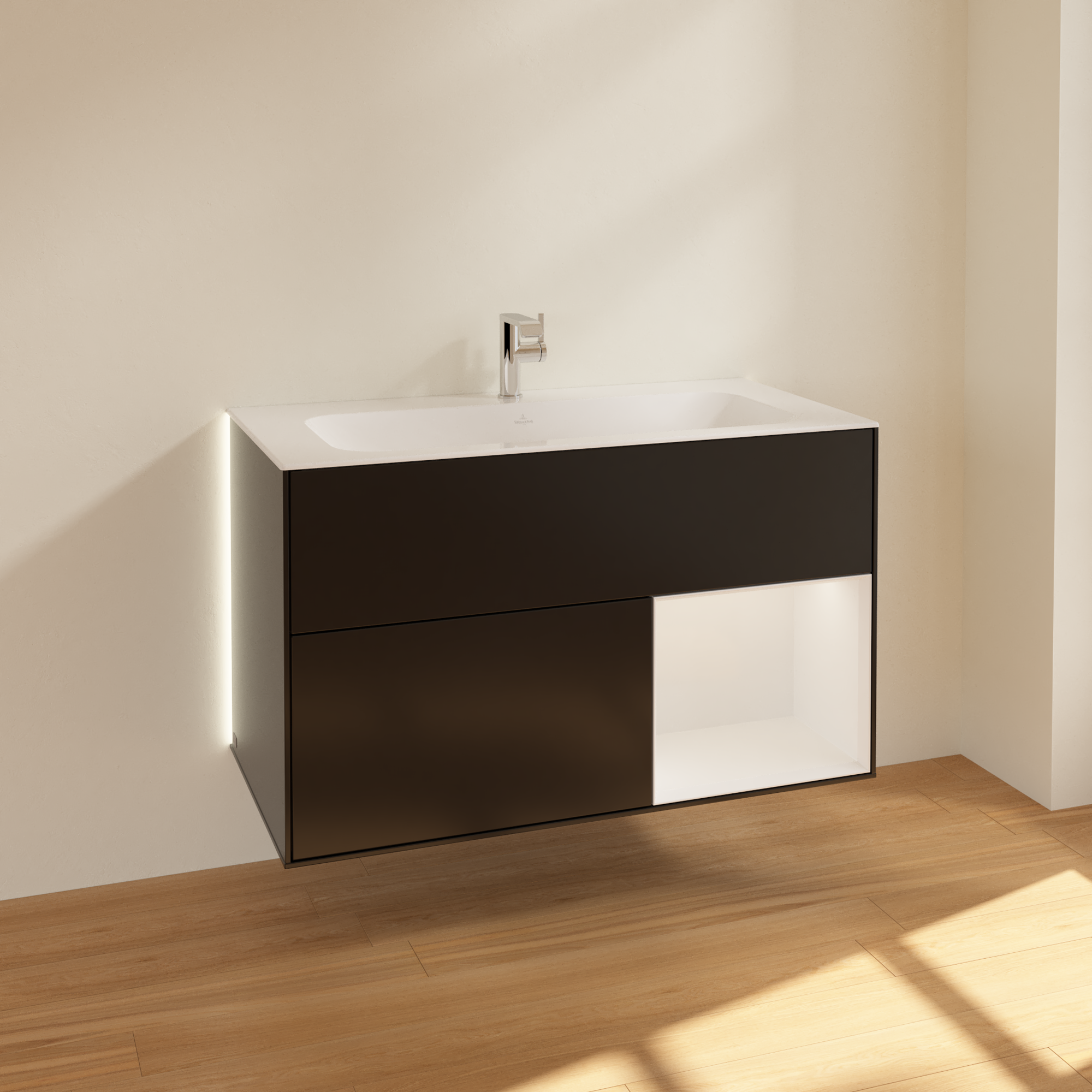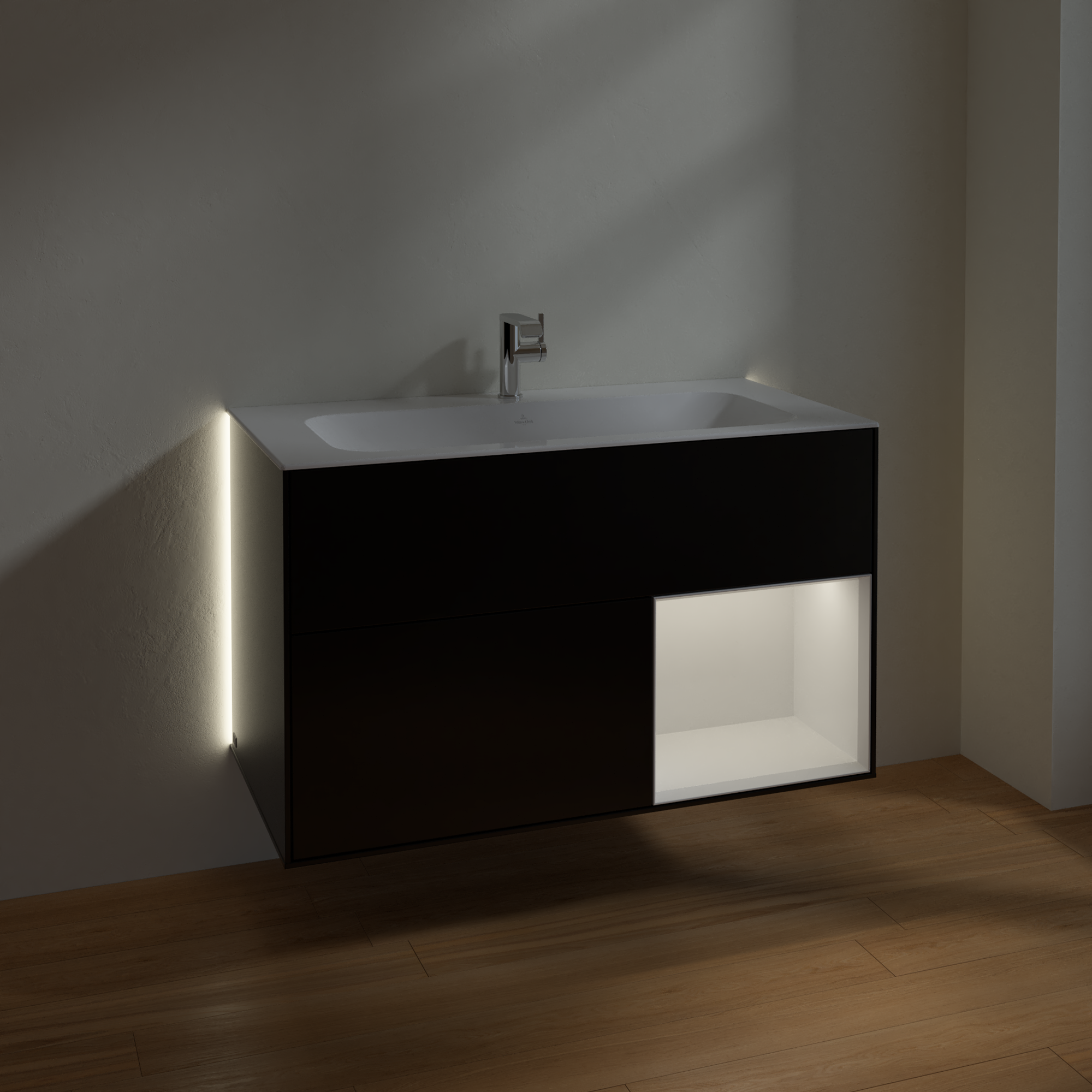 Finion Meuble sous plan, avec éclairage, 2 tiroirs sur rails, 996x591x498mm, Caisson: Black Matt Lacquer, Façade: Black Matt Lacquer, Élément d’étagère: Glossy White Lacquer