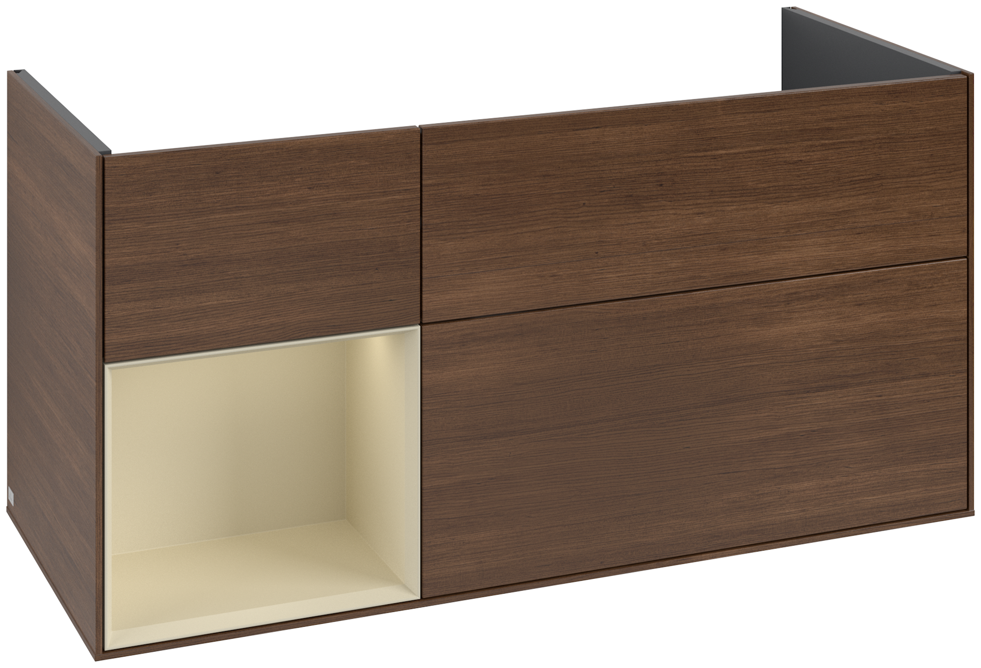 Finion Meuble sous plan, avec éclairage, 3 tiroirs sur rails, 1196x591x498mm, Caisson: Walnut Veneer, Façade: Walnut Veneer, Élément d’étagère: Silk Grey Matt Lacquer