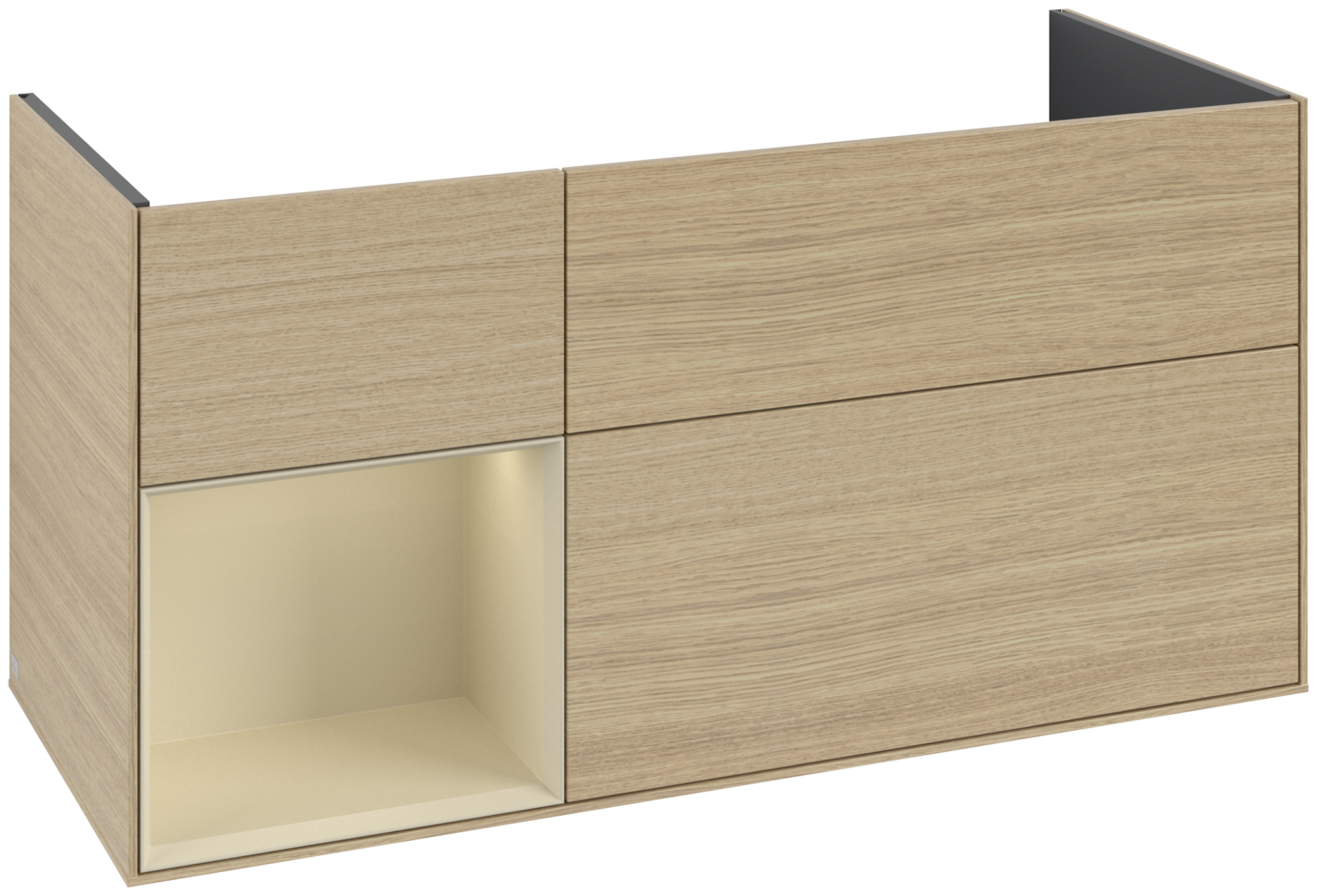 Finion Meuble sous plan, avec éclairage, 3 tiroirs sur rails, 1196x591x498mm, Caisson: Oak Veneer, Façade: Oak Veneer, Élément d’étagère: Silk Grey Matt Lacquer