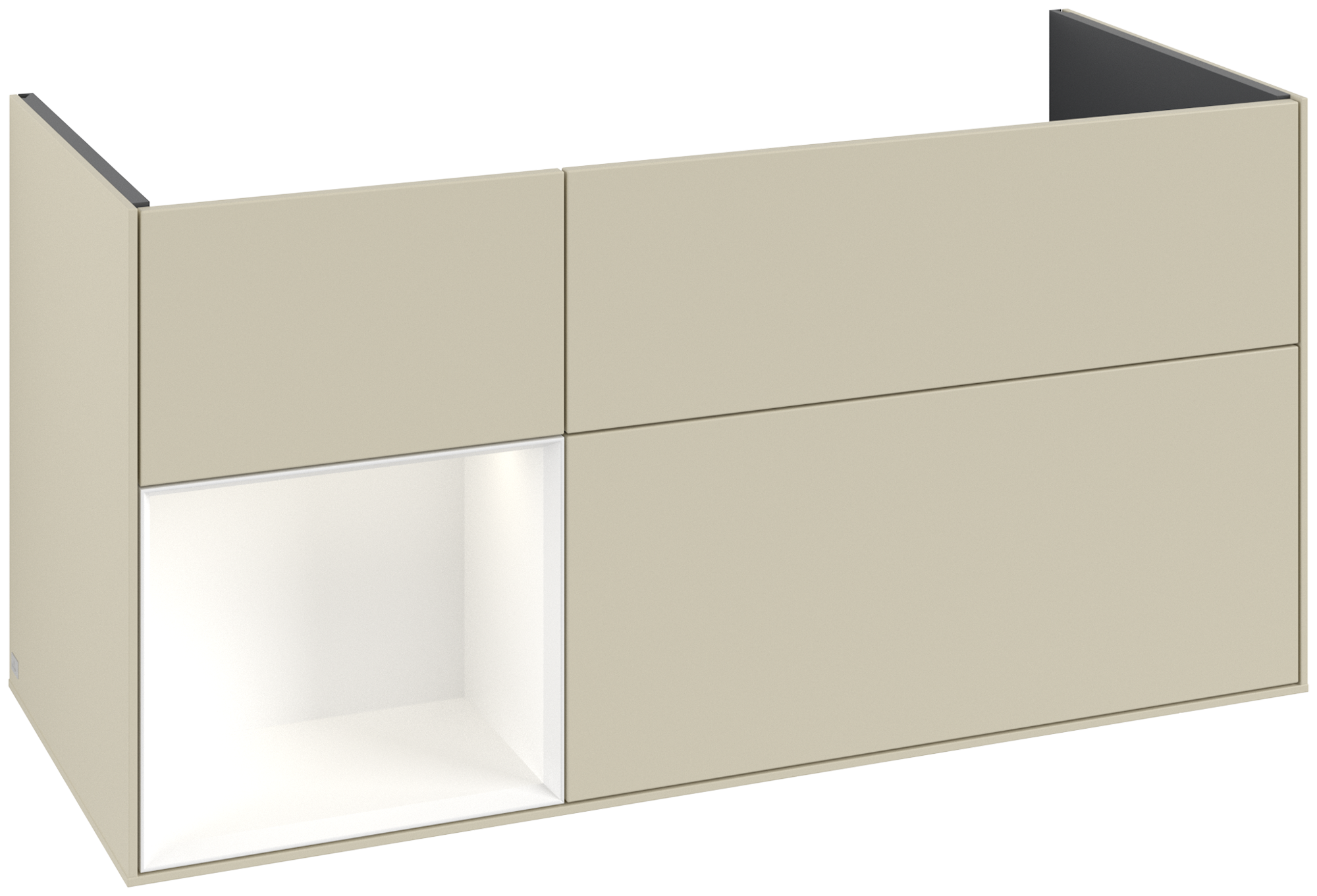 Finion Meuble sous plan, avec éclairage, 3 tiroirs sur rails, 1196x591x498mm, Caisson: Silk Grey Matt Lacquer, Façade: Silk Grey Matt Lacquer, Élément d’étagère: White Matt Lacquer