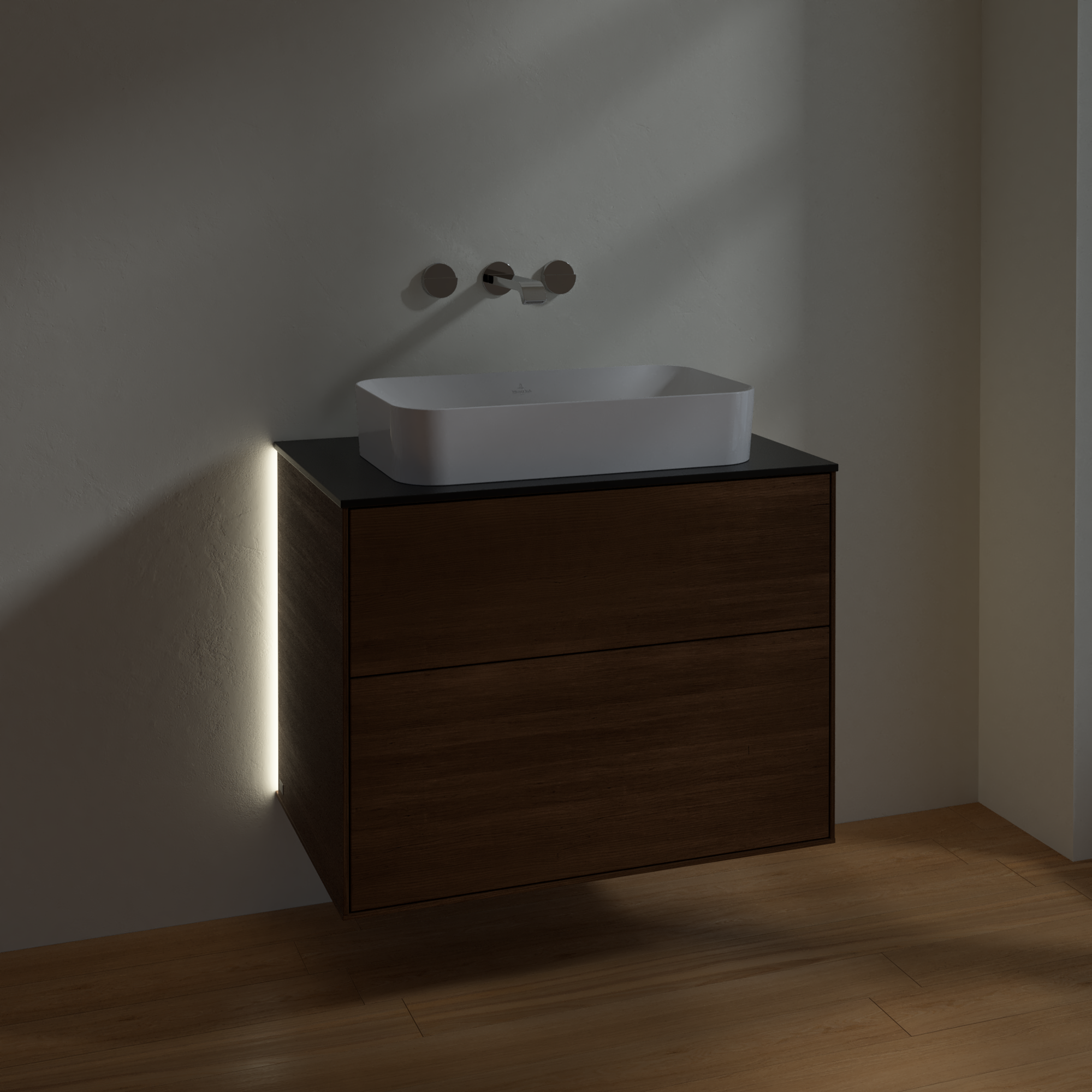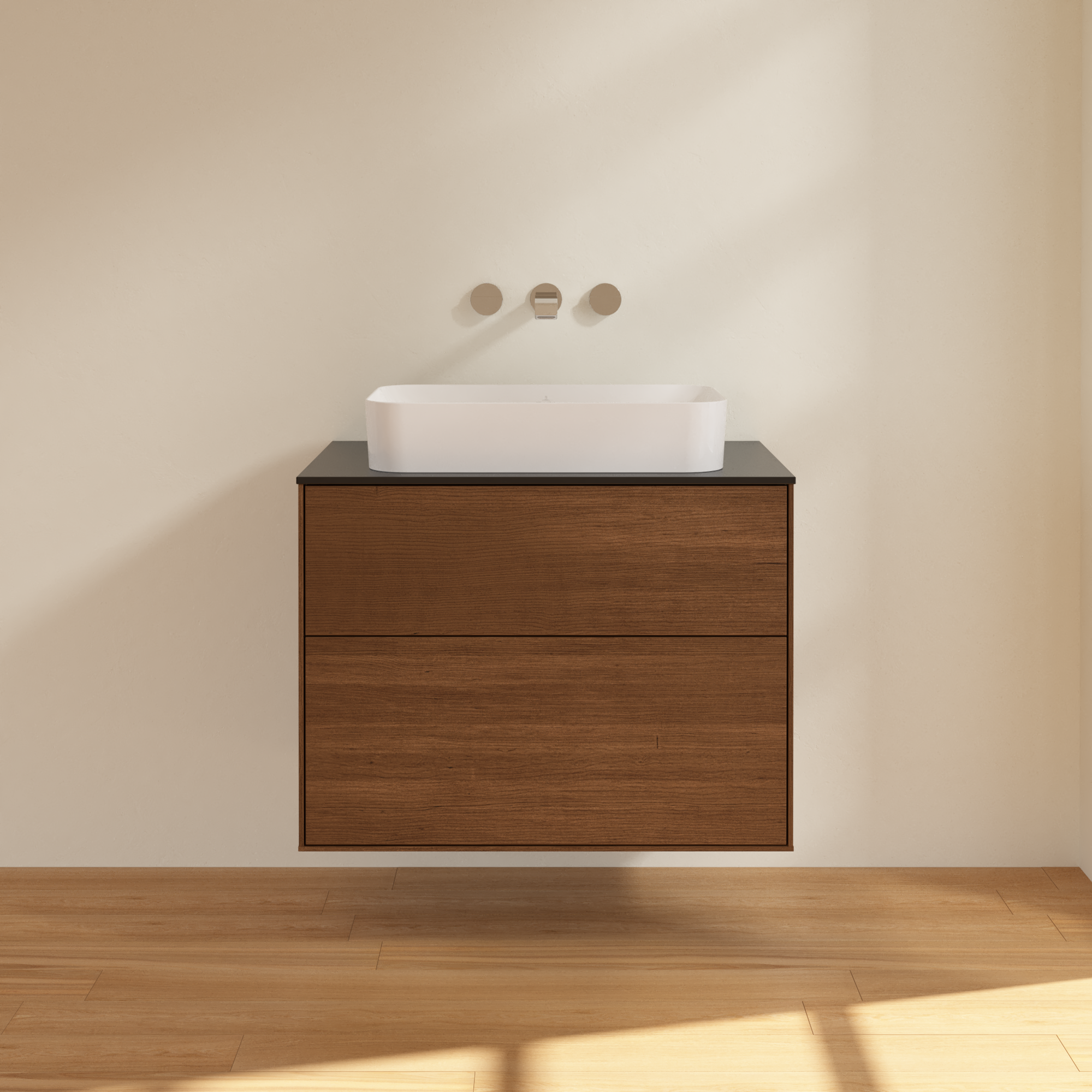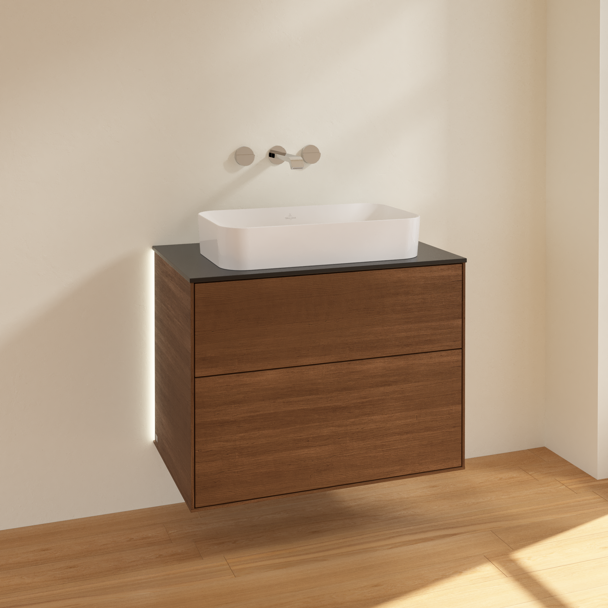 Finion Meuble sous plan, avec éclairage, 2 tiroirs sur rails, 800x603x501mm, Caisson: Walnut Veneer, Façade: Walnut Veneer, Plaque de recouvrement: Glass Black Matt