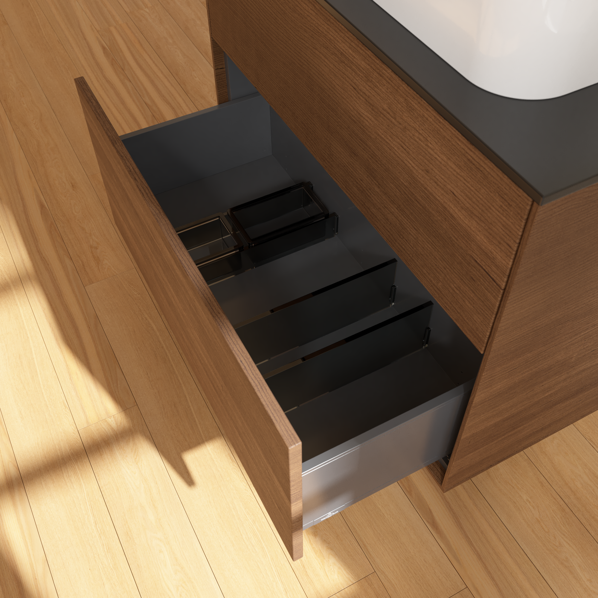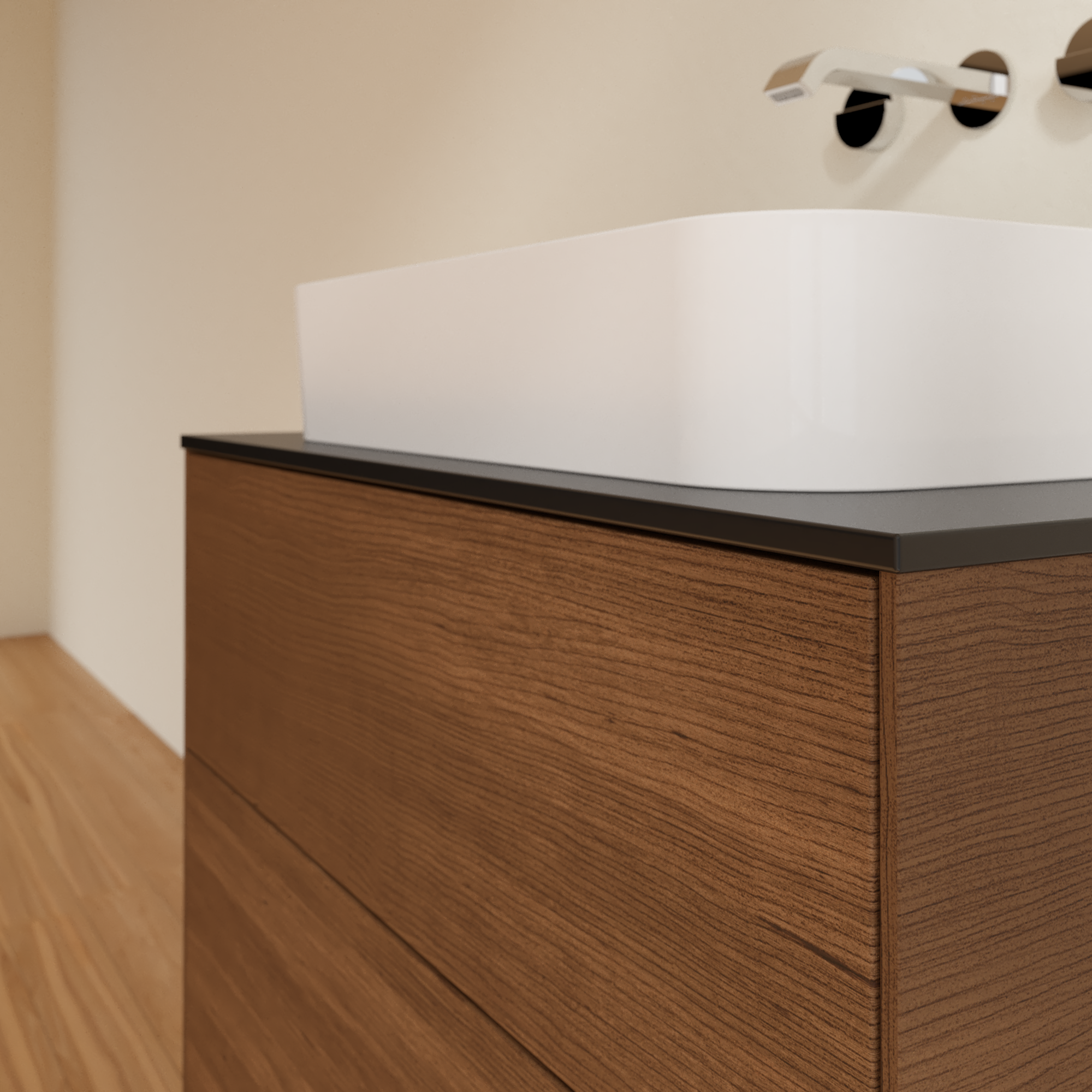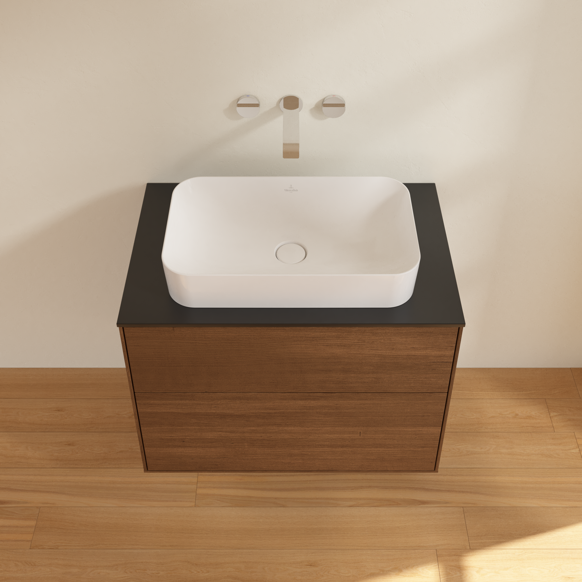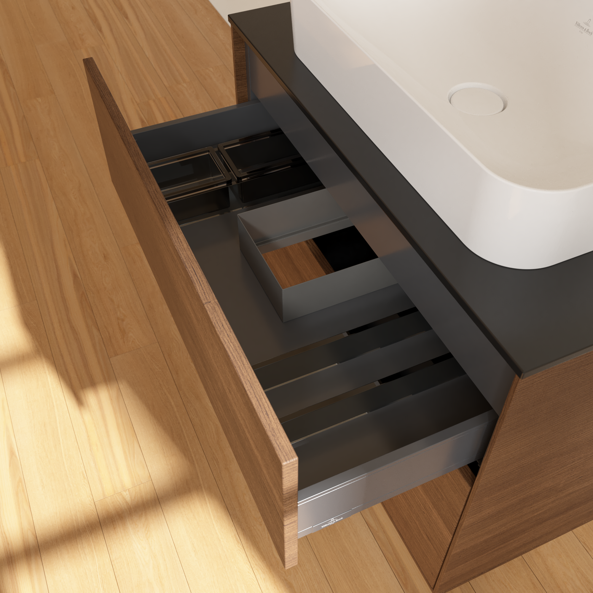 Finion Meuble sous plan, avec éclairage, 2 tiroirs sur rails, 800x603x501mm, Caisson: Walnut Veneer, Façade: Walnut Veneer, Plaque de recouvrement: Glass Black Matt