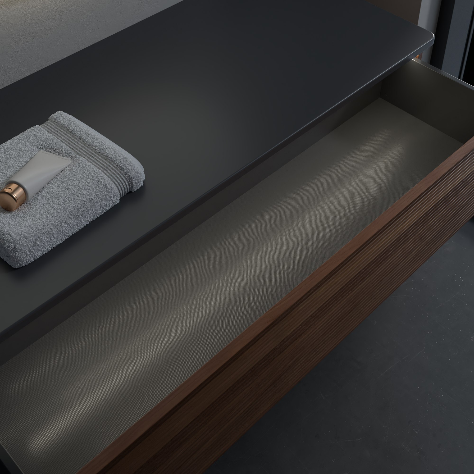 Antao Meuble d'appoint, avec éclairage, 1 tiroir sur rails, 1200x268x500mm, Façade avec structure, Caisson: Warm Walnut, Façade: Warm Walnut, Plaque de recouvrement: Warm Walnut