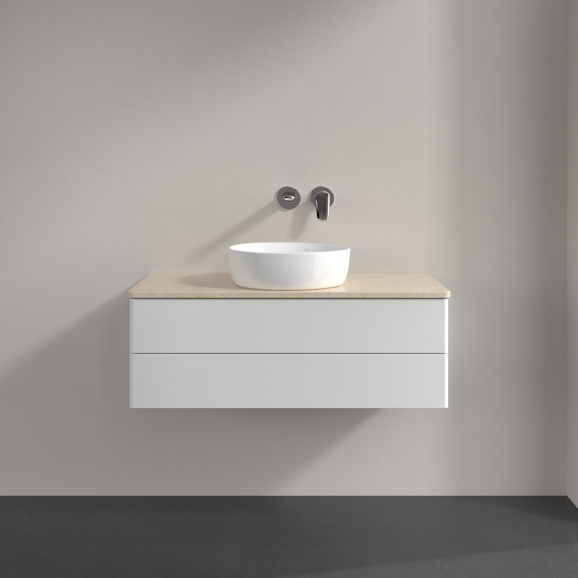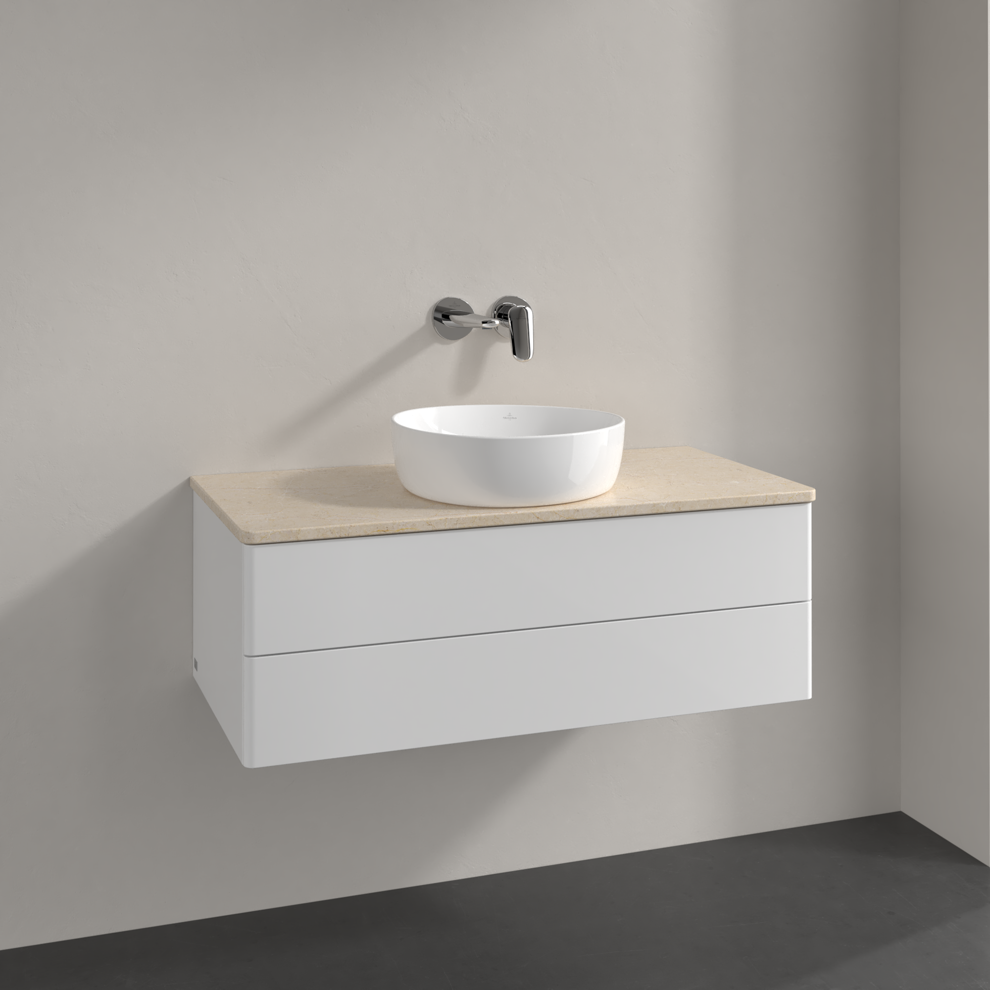 Antao Meuble sous plan, avec éclairage, 2 tiroirs sur rails, 1000x360x500mm, Façade sans structure, Caisson: Glossy White Lacquer, Façade: Glossy White Lacquer, Plaque de recouvrement: Botticino