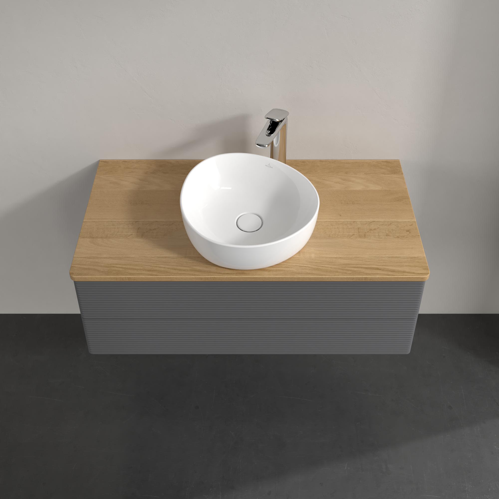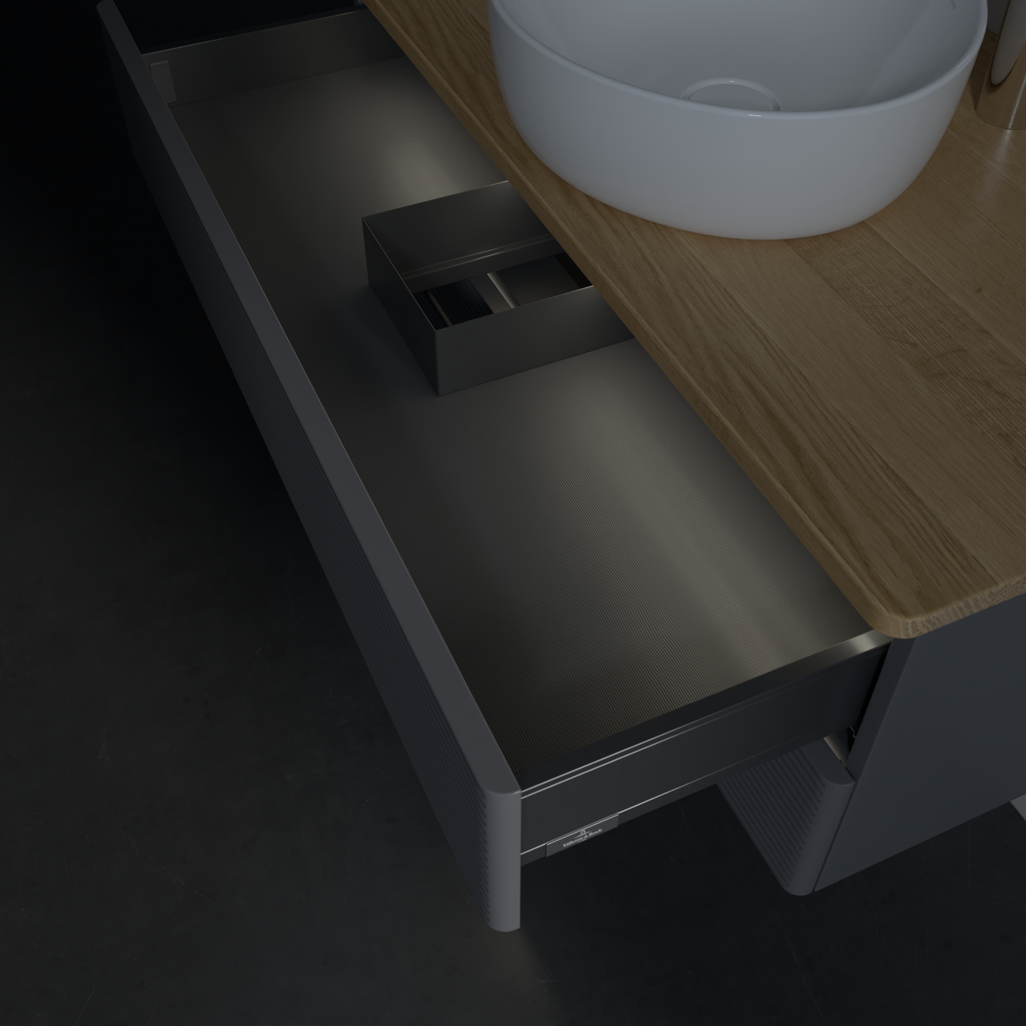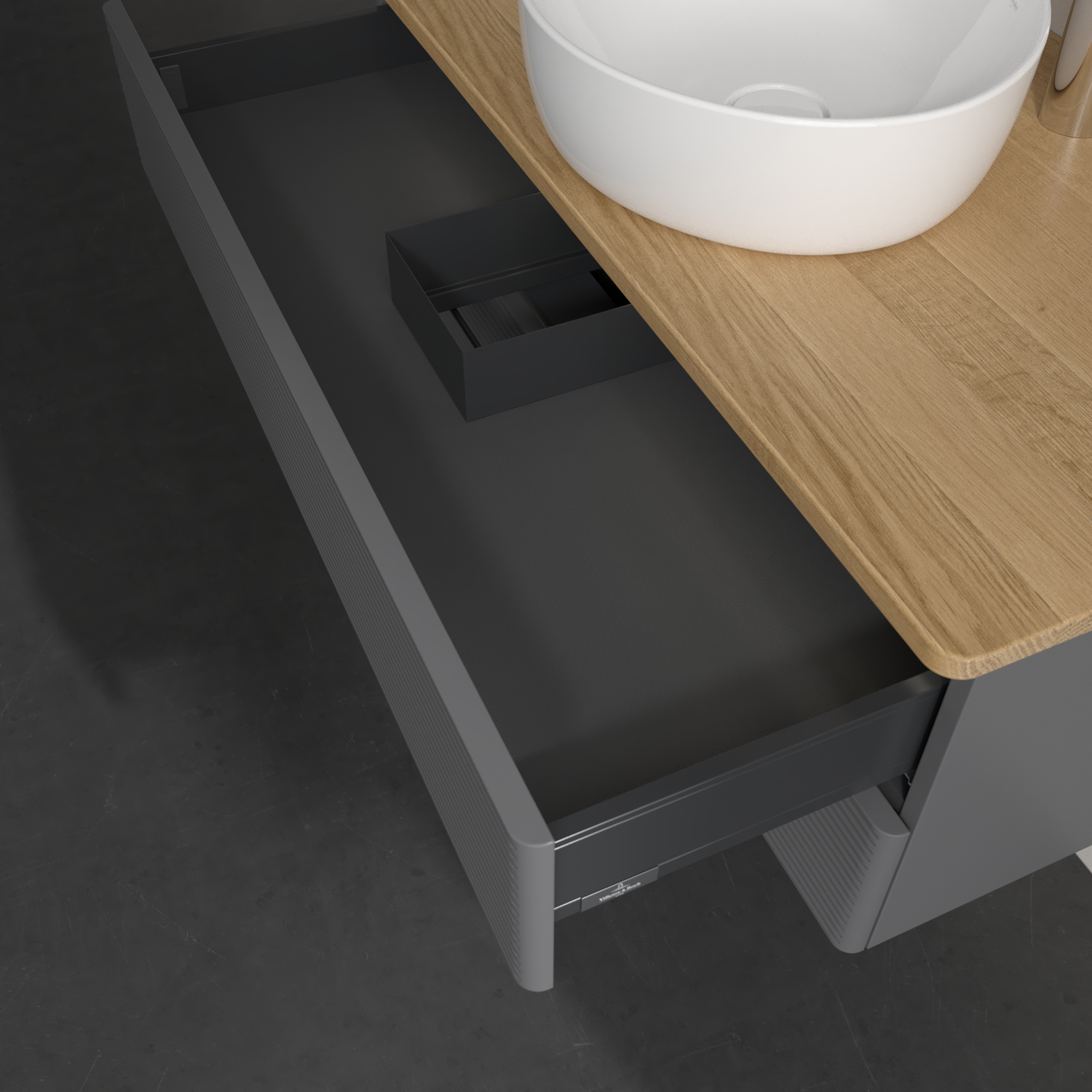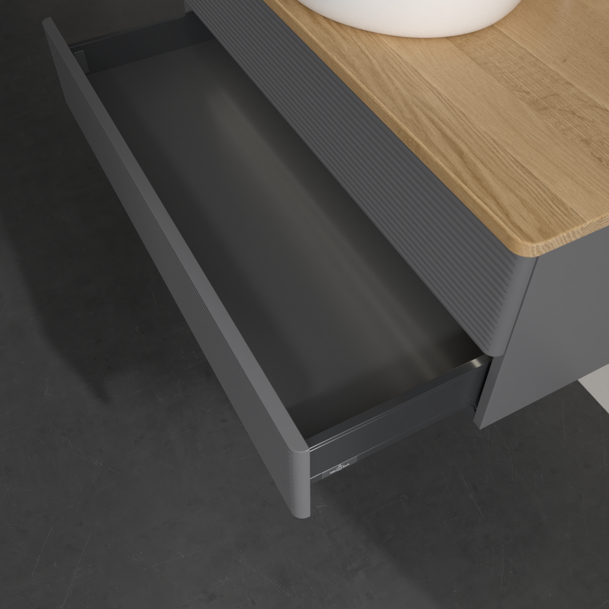 Antao Meuble sous plan, avec éclairage, 2 tiroirs sur rails, 1000x360x500mm, Façade avec structure, Caisson: Anthracite Matt Lacquer, Façade: Anthracite Matt Lacquer, Plaque de recouvrement: Honey Oak