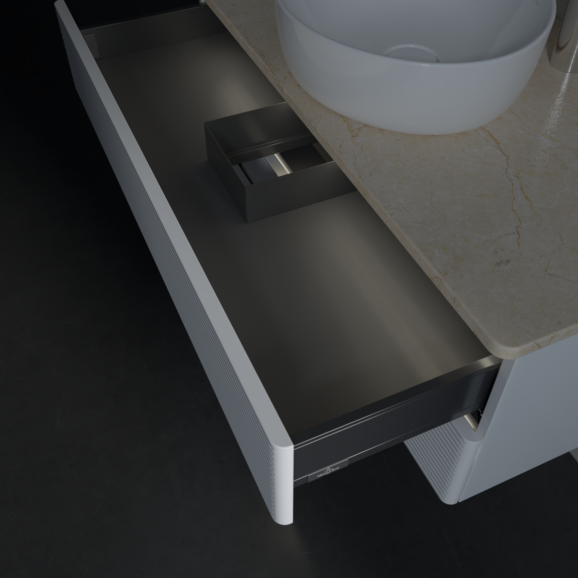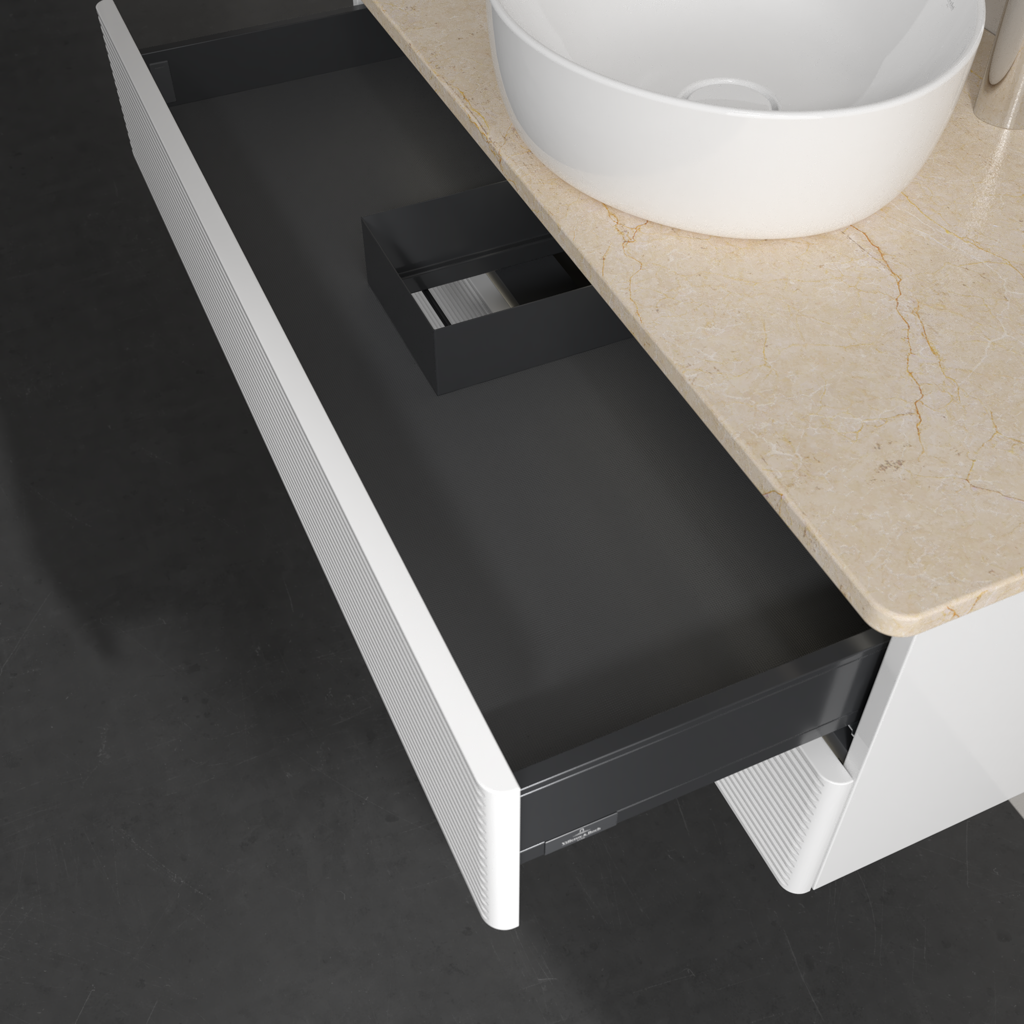 Antao Meuble sous plan, avec éclairage, 2 tiroirs sur rails, 1000x360x500mm, Façade avec structure, Caisson: Glossy White Lacquer, Façade: Glossy White Lacquer, Plaque de recouvrement: Botticino