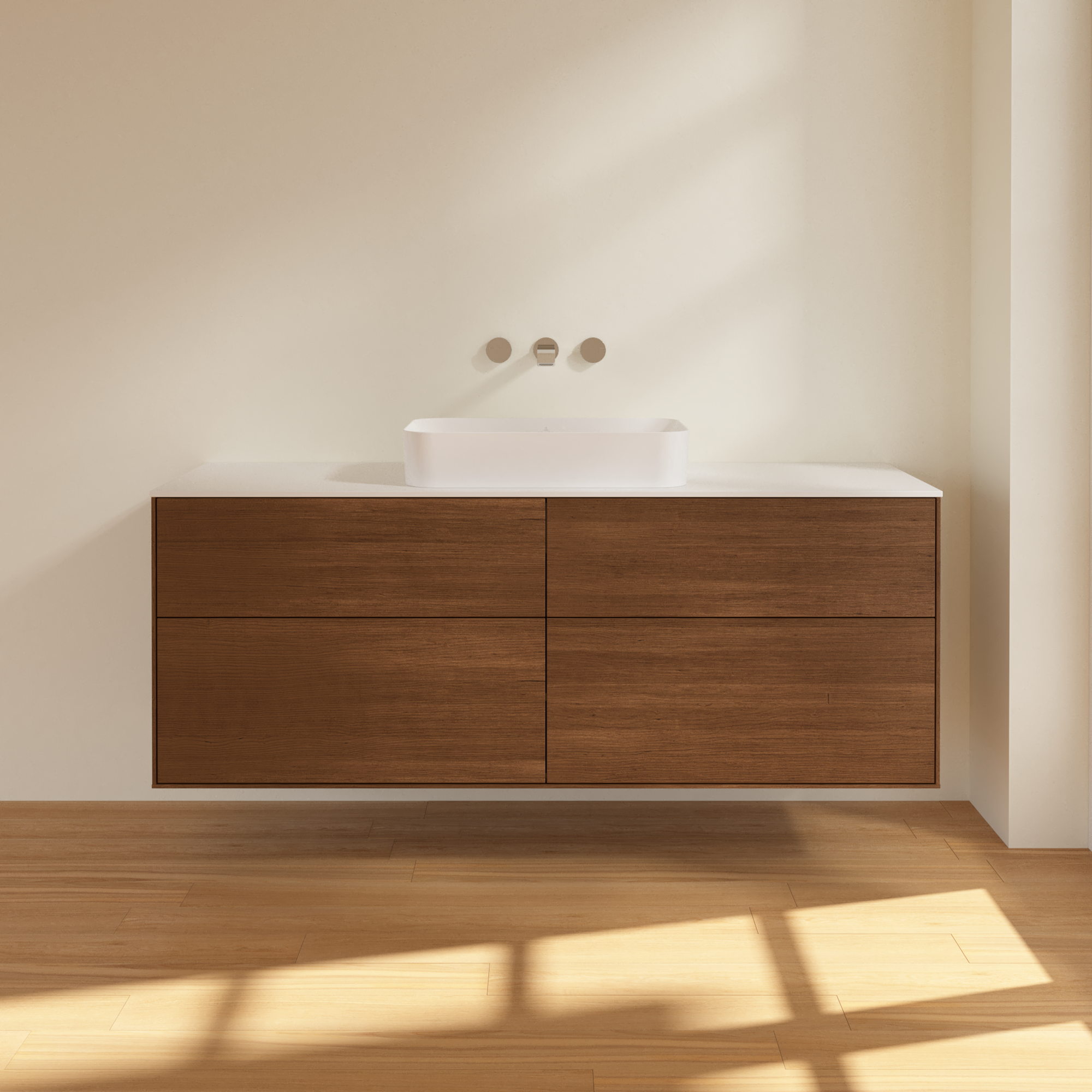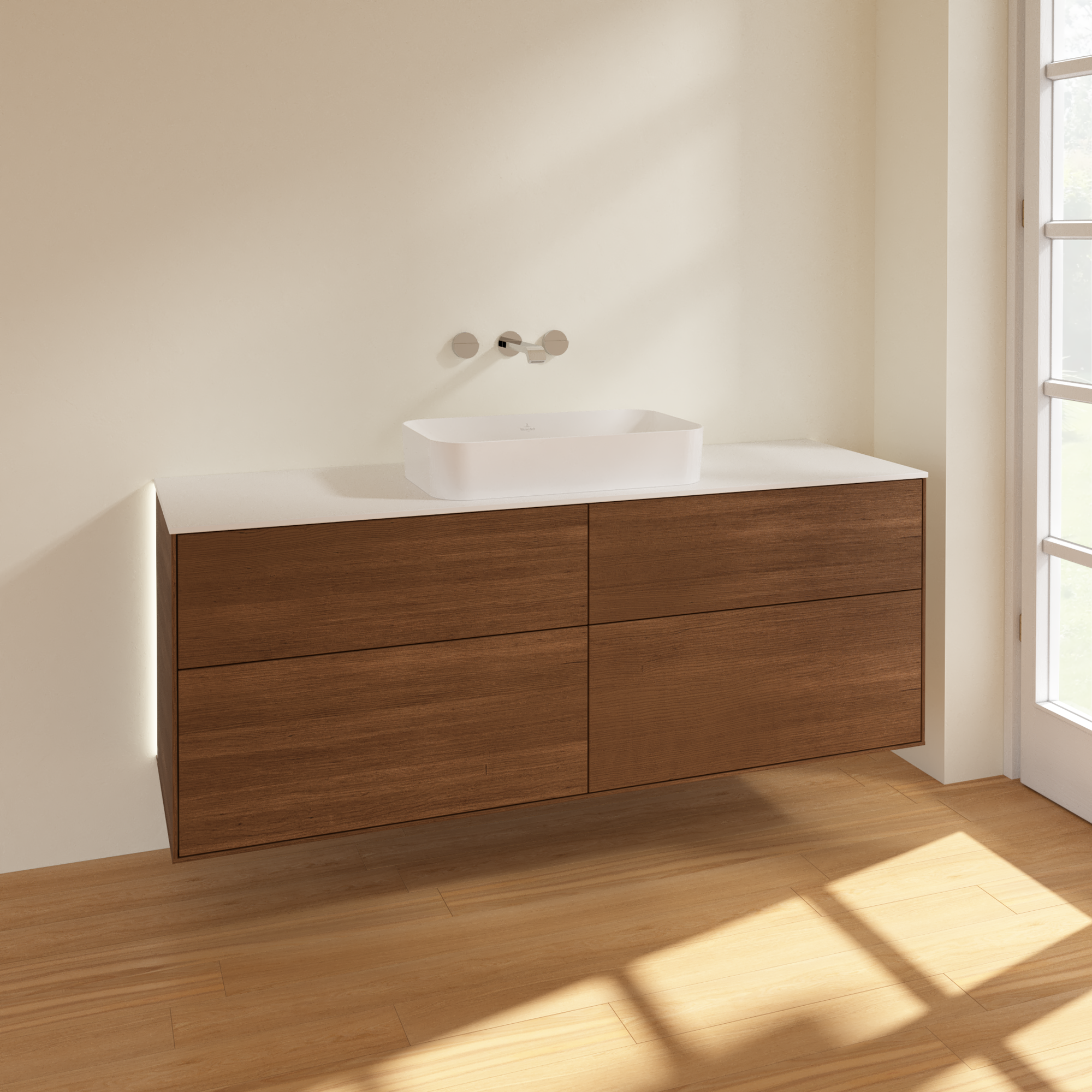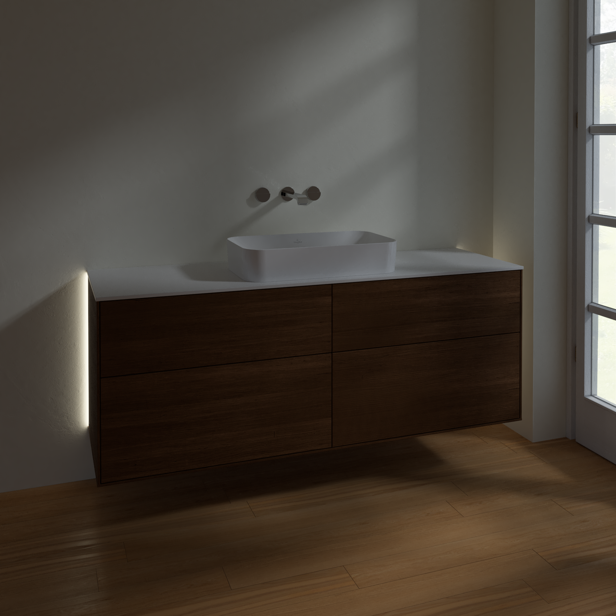 Finion Meuble sous plan, avec éclairage, 4 tiroirs sur rails, 1600x603x501mm, Caisson: Walnut Veneer, Façade: Walnut Veneer, Plaque de recouvrement: Glass White Matt