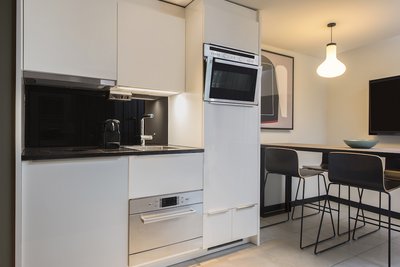 Des carreaux Villeroy & Boch ont également été choisis pour les studios. Dans les kitchenettes ouvertes sur les coins repas, le look béton gris de la série SECTION crée une ambiance vivante et moderne, tandis que dans les salles de bains, l’imitation de marbre de la série TRIANON séduit par son élégance chaleureuse. Cette série TRIANON séduit également par son look authentique tout en offrant les avantages d’un revêtement céramique facile à entretenir.