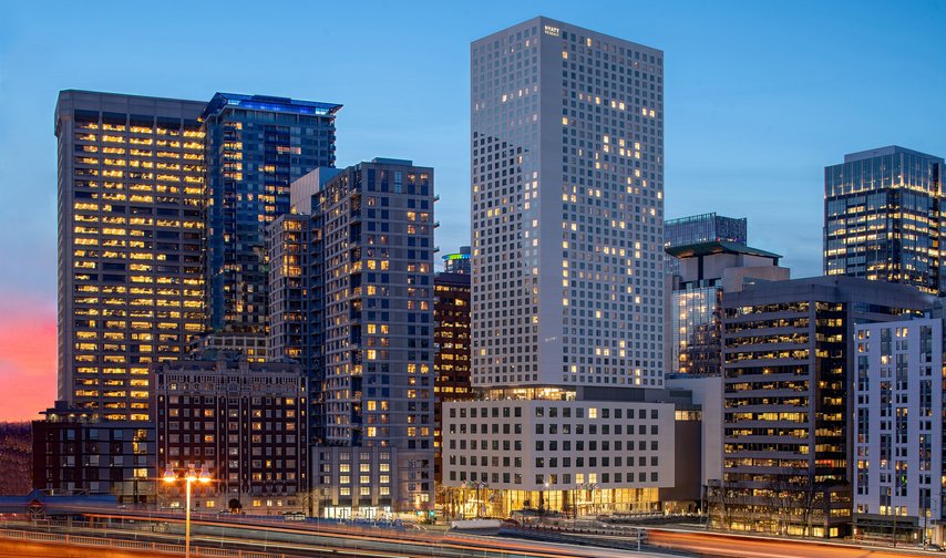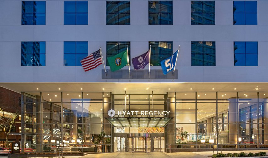 400 employés, 45 étages, 1 264 chambres et 46 salles de conférence, deux salles de bal, deux restaurants, un bar, une salle de remise en forme ainsi que divers salons, le tout s’étendant sur une surface de plus de 9 600 m². Le Hyatt Regency de Seattle qui emploie quelque 400 personnes est non seulement le plus grand hôtel de la ville mais aussi de toute la grande région nord-ouest Pacifique en Amérique du Nord. Sur le plan architectural, le bâtiment conçu par LMN Architects et Zena Design, se compose de plusieurs éléments : le socle de 8 étages qui est relié à un bloc de connexion avec des entrées de service et un parking, abrite les espaces publics avec son hall d’entrée tandis que les chambres sont situées dans la tour placée au-dessus.
