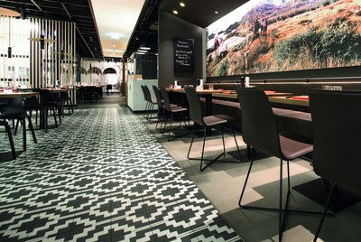 Le regard est particulièrement accroché par les carreaux de sol spécialement conçus pour Maredo par Villeroy & Boch Fliesen. Ces carreaux de grès porcelainé reproduisent de manière saisissante les motifs des ponchos. Spécialisés dans les designs en céramique haut de gamme pour la personnalisation de l’espace, les experts de l’atelier Artefactur ont pour cela élaboré un dessin exclusif en deux versions qu’ils ont reproduit grâce à une technique innovante d’impression numérique. Les carreaux bicolores associent de l’anthracite foncé avec un doux gris clair formant un motif graphique très expressif sur toute la surface du sol. Les carreaux 20 x 20 cm en grès porcelainé émaillé sont antidérapants classés en catégorie R9 et donc parfaitement adaptés pour les revêtements de sol dans les lieux publics. Le grès porcelainé présente en outre d’autres avantages : il est extrêmement robuste, dur, résistant à la rupture et aux rayures et offre une grande résistance à l’usure en profondeur. Les couleurs des carreaux sont de plus inaltérables et ne changent pas leur aspect même sous une exposition directe aux rayons du soleil. Le grès porcelainé est de surcroît insensible aux acides si bien que les vinaigrettes ou les sauces renversées ne lui font aucun mal. Enfin, le grès porcelainé séduit par sa facilité de nettoyage et d’entretien, ce qui est, dans la restauration, un argument important en termes de rentabilité.