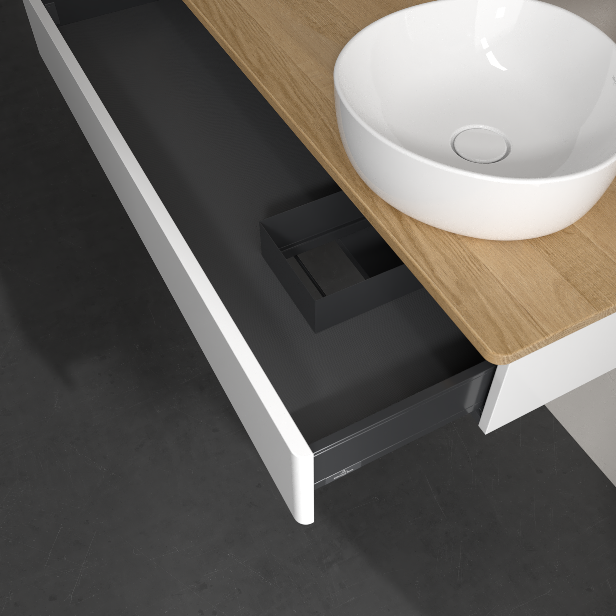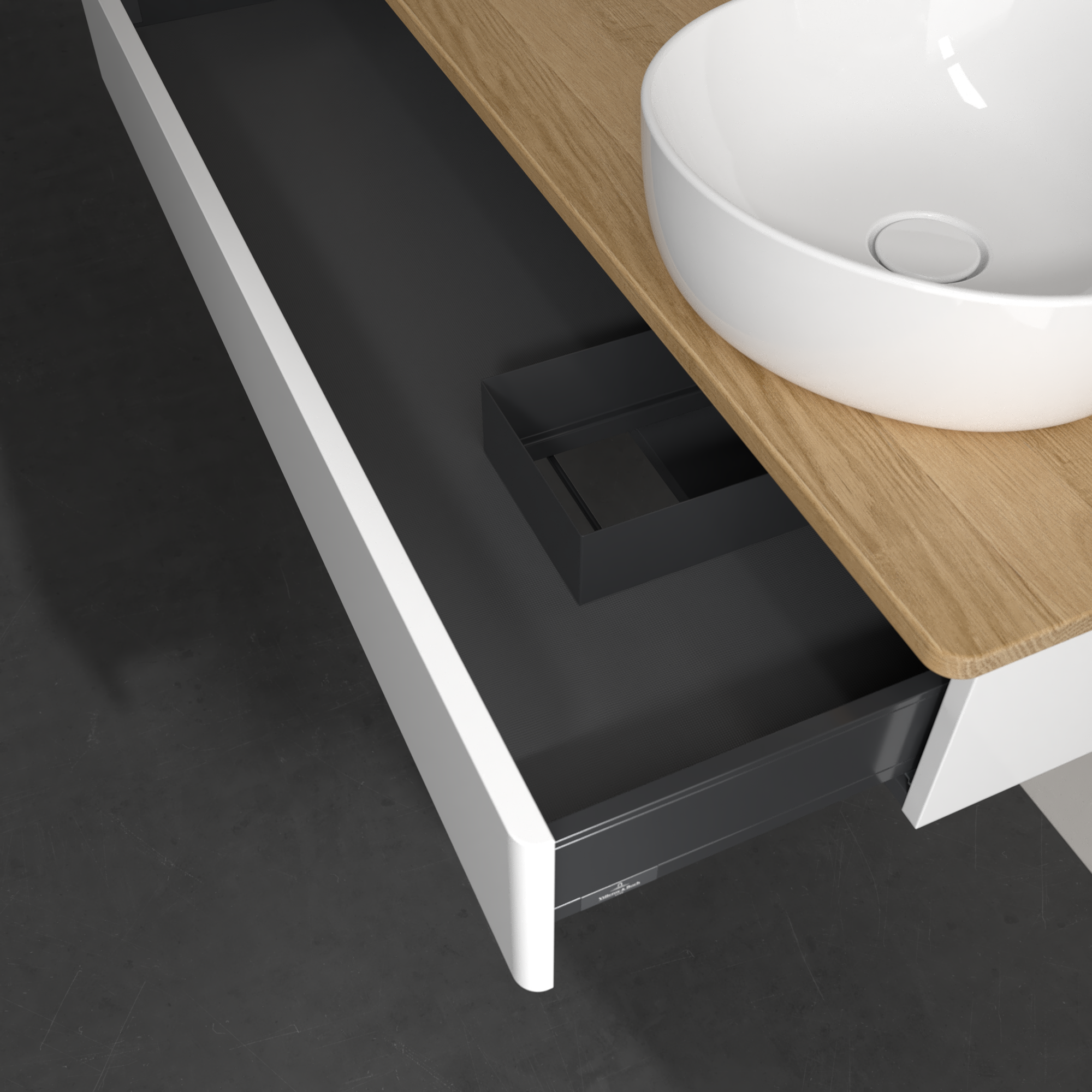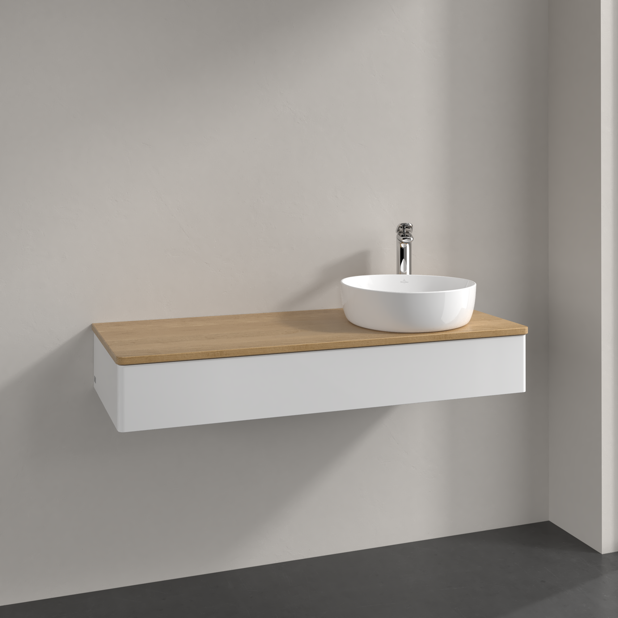 Antao Meuble sous plan, 1 tiroir sur rails, 1200x190x500mm, Façade sans structure, Caisson: Glossy White Lacquer, Façade: Glossy White Lacquer, Plaque de recouvrement: Honey Oak