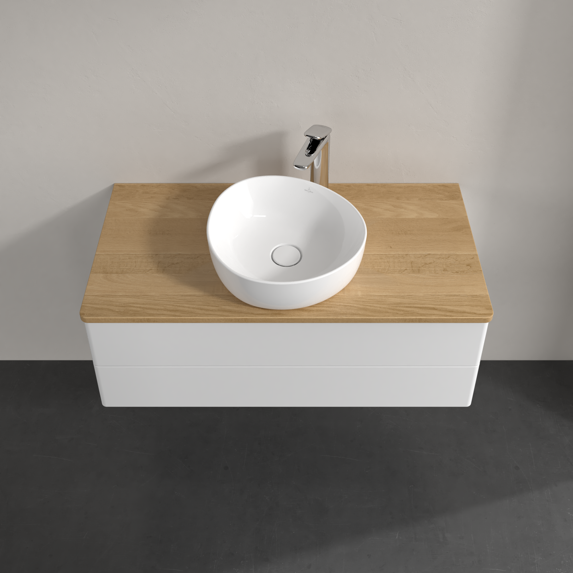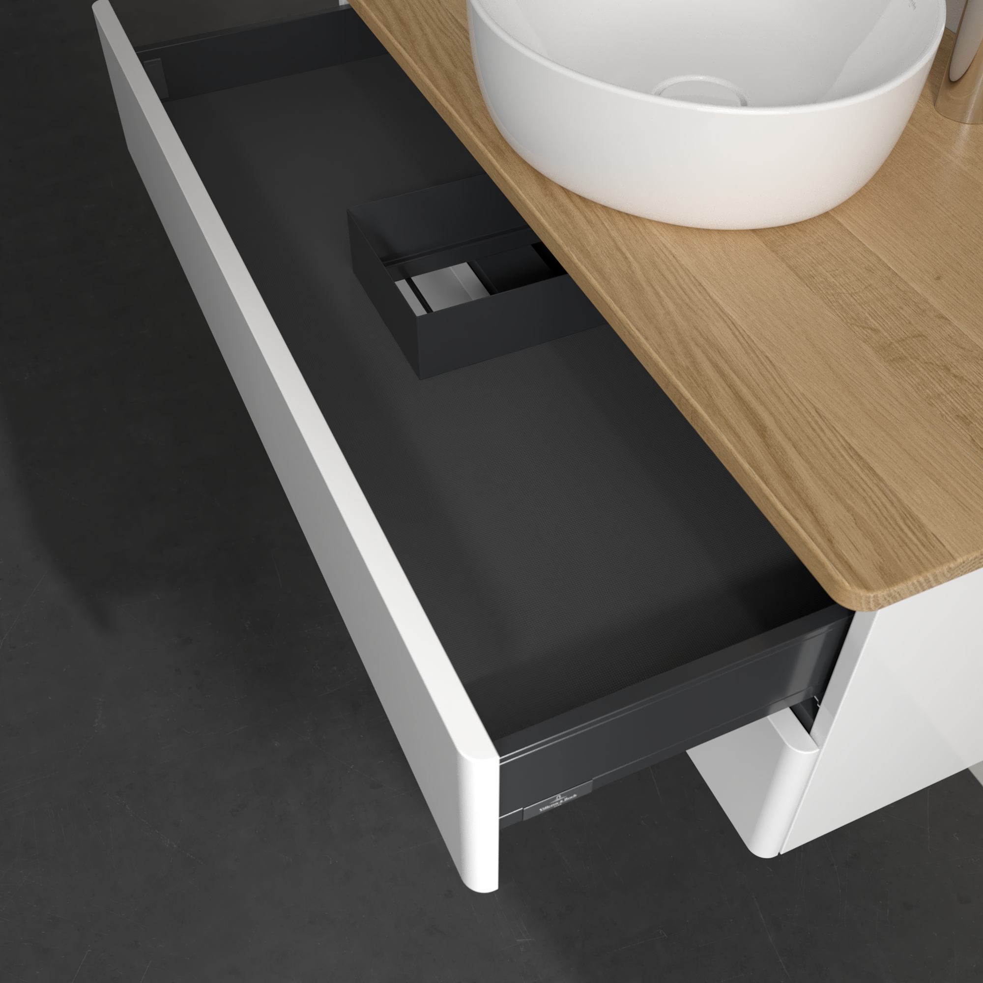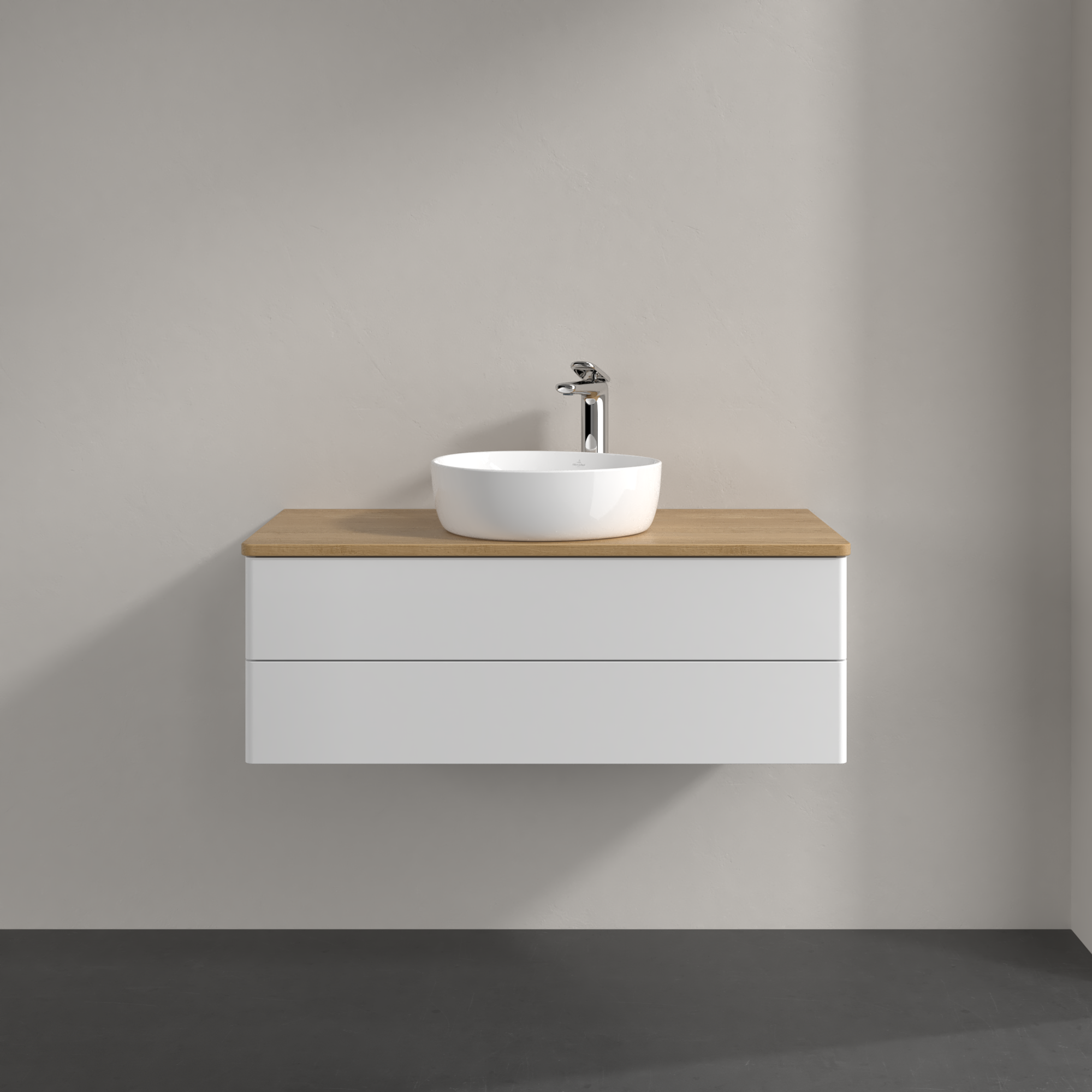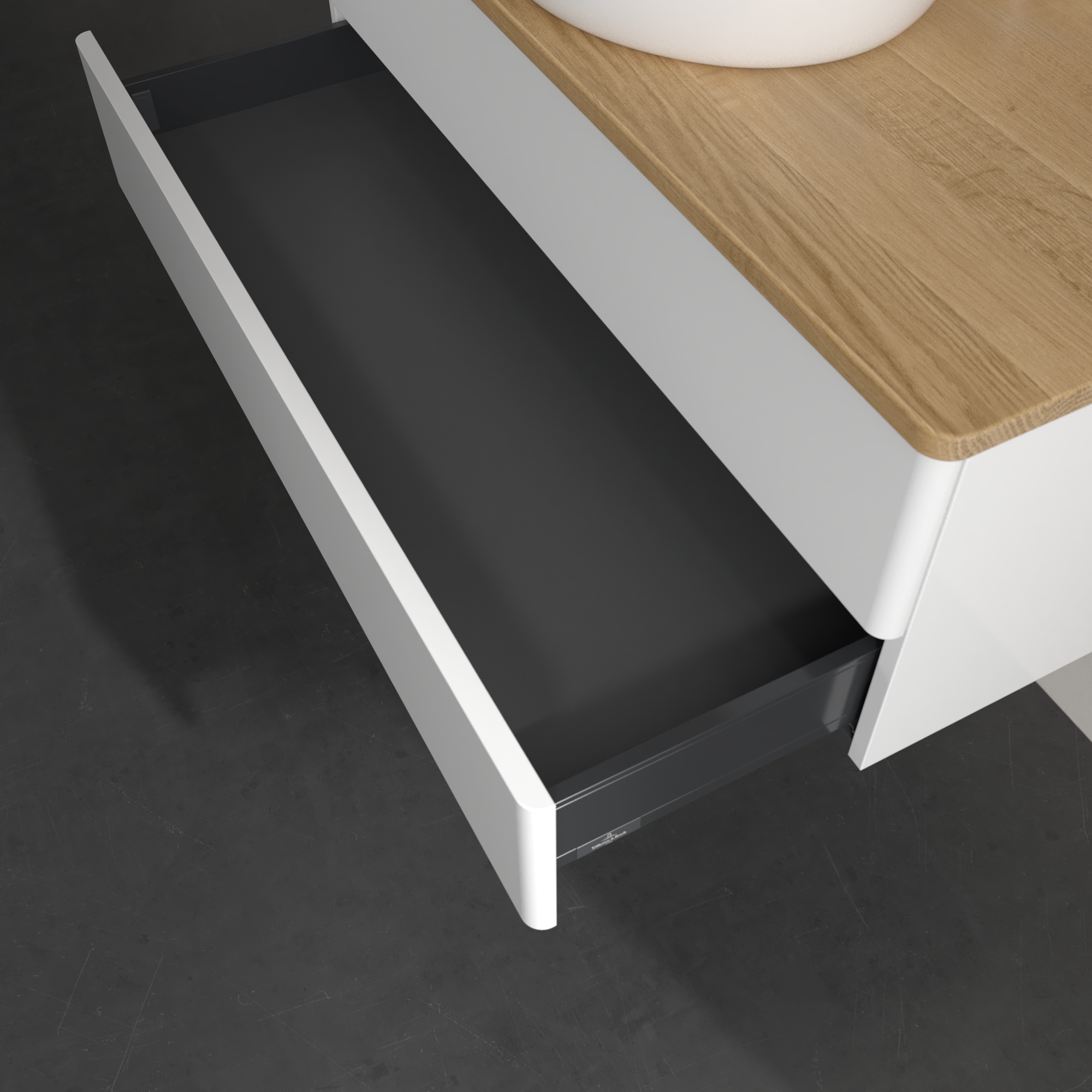 Antao Meuble sous plan, 2 tiroirs sur rails, 1000x360x500mm, Façade sans structure, Caisson: Glossy White Lacquer, Façade: Glossy White Lacquer, Plaque de recouvrement: Honey Oak