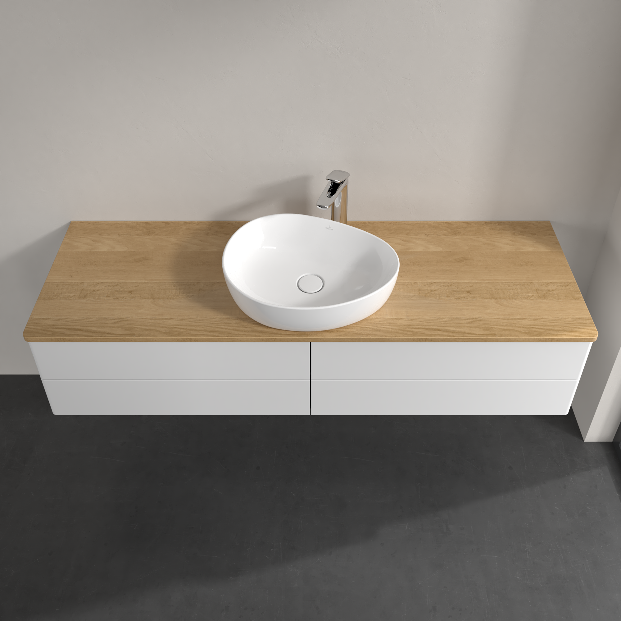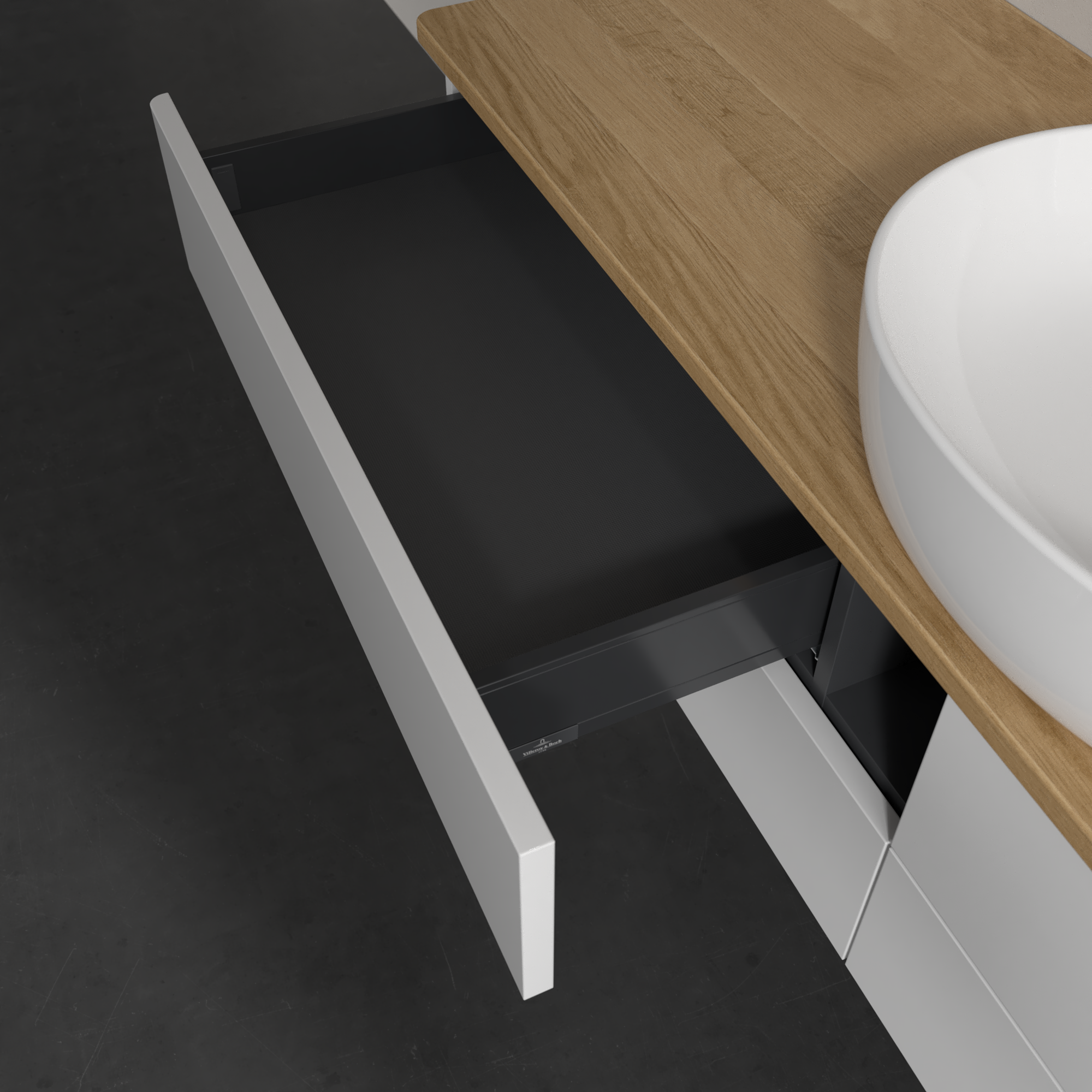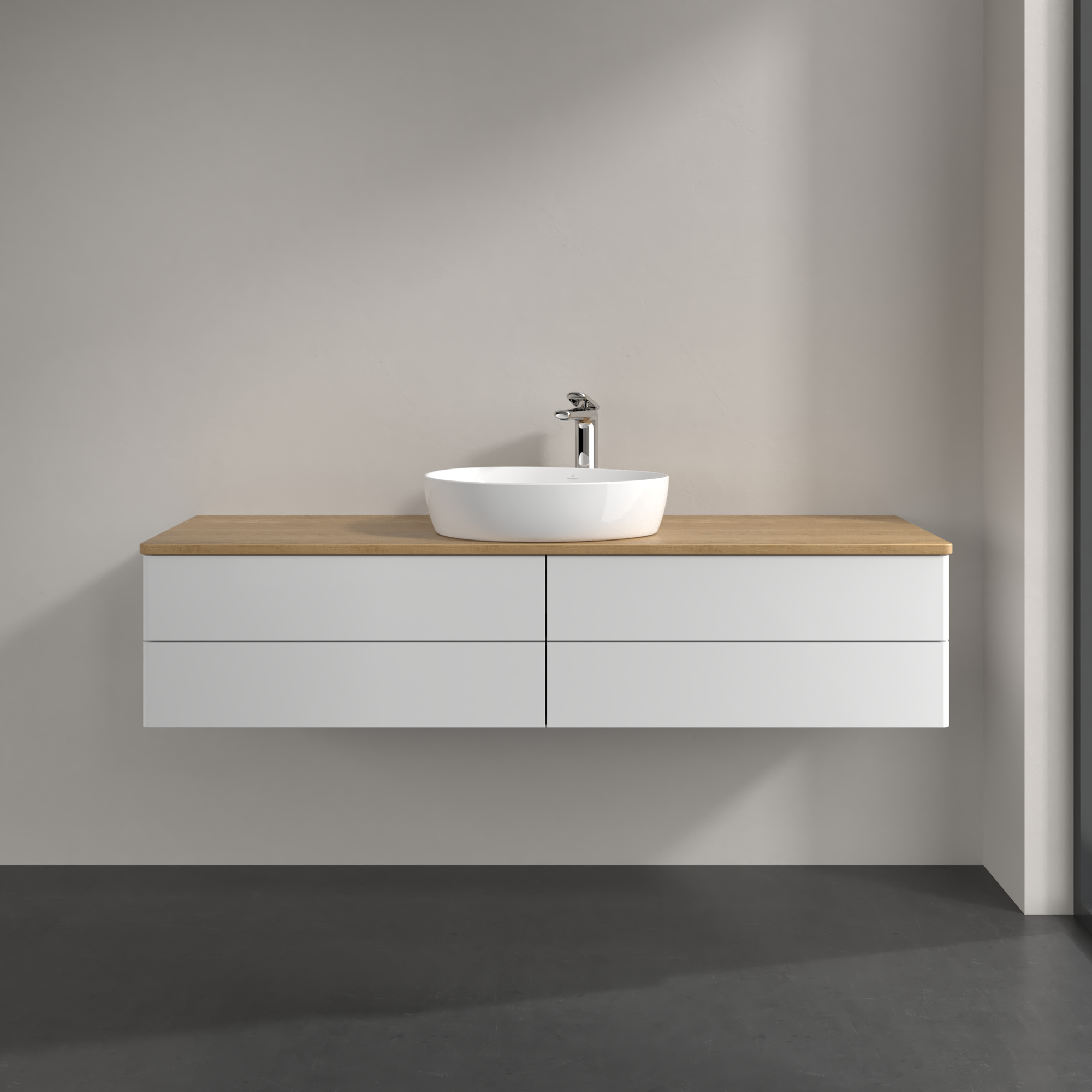 Antao Meuble sous plan, 4 tiroirs sur rails, 1600x360x500mm, Façade sans structure, Caisson: Glossy White Lacquer, Façade: Glossy White Lacquer, Plaque de recouvrement: Honey Oak