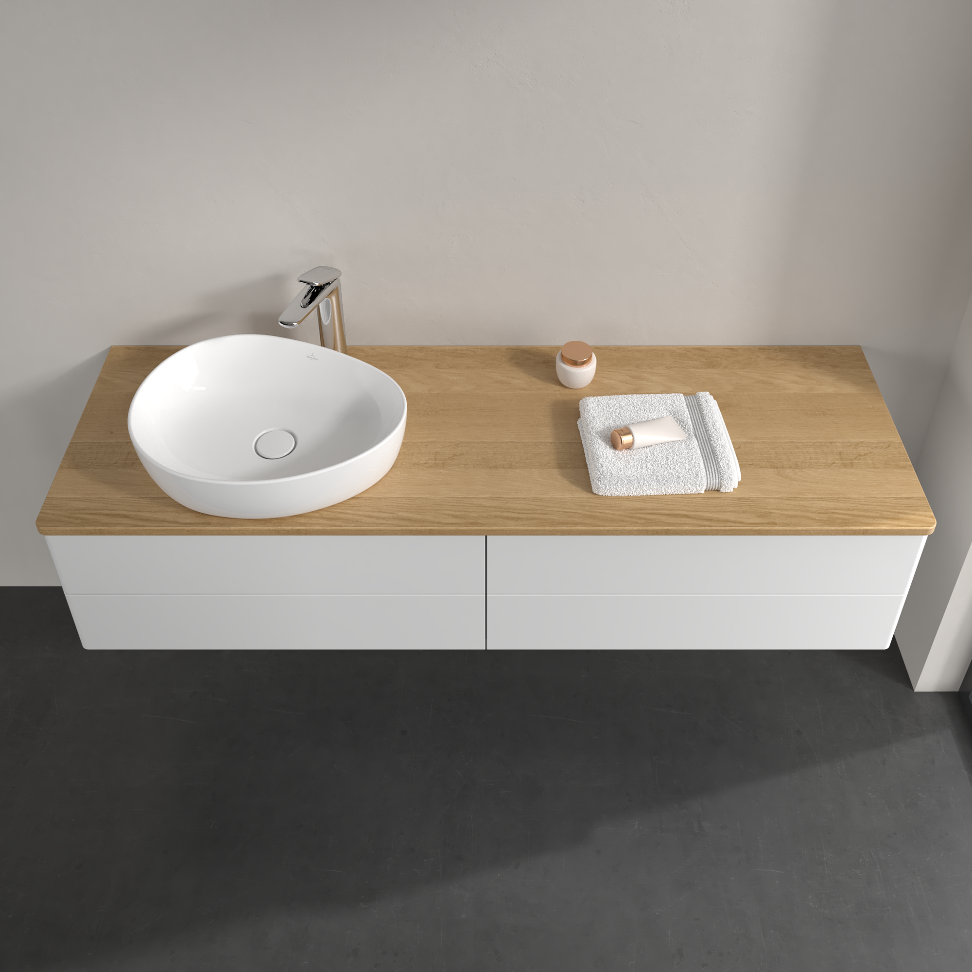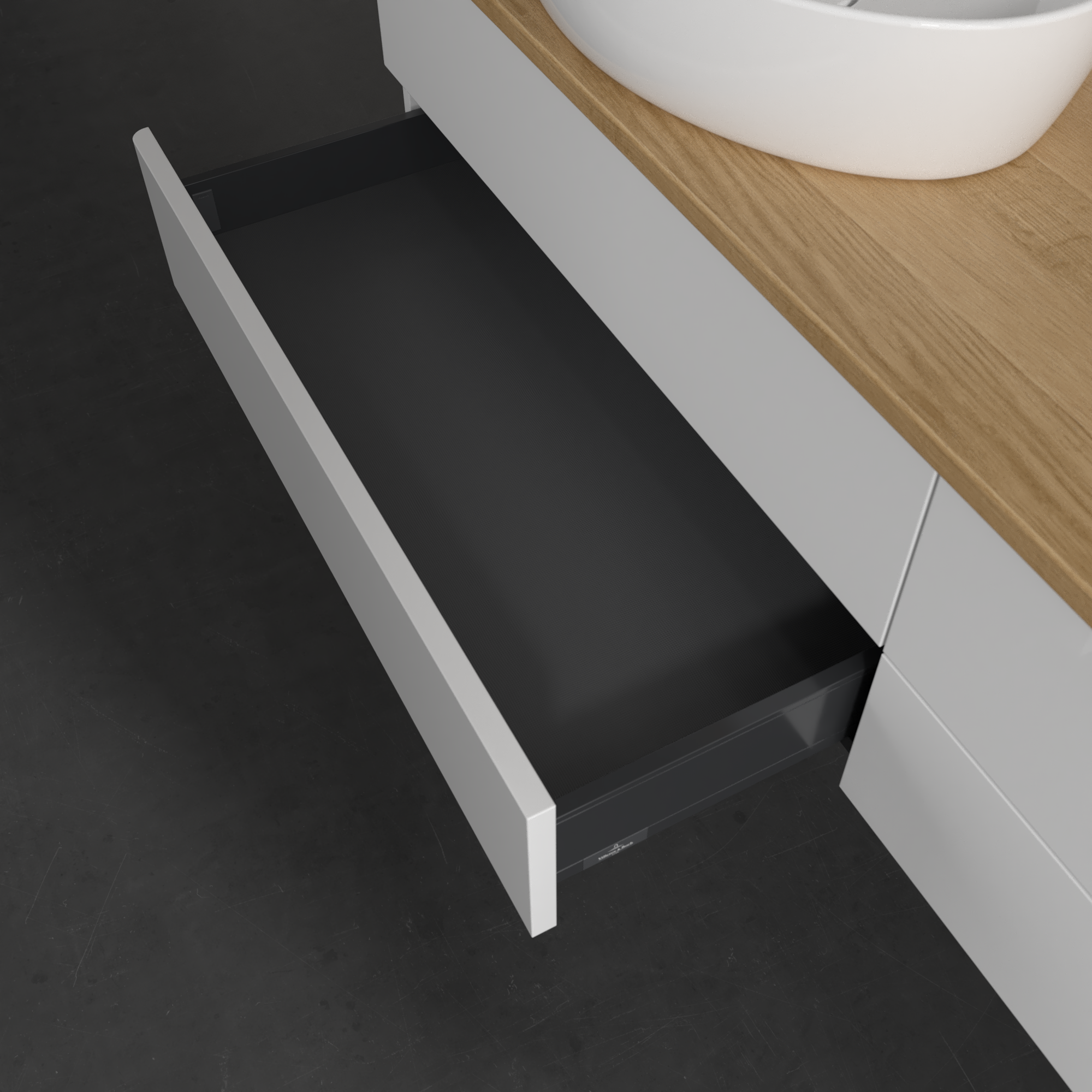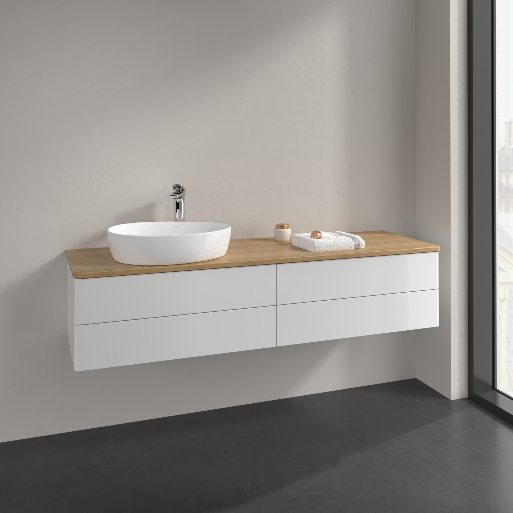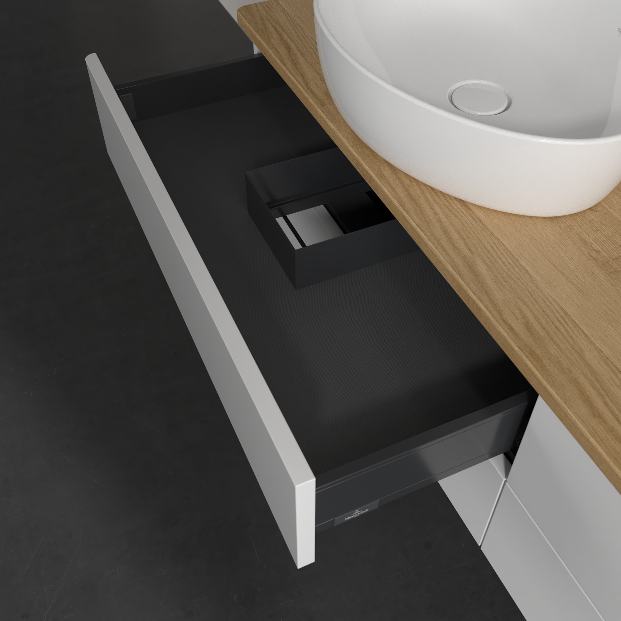 Antao Meuble sous plan, 4 tiroirs sur rails, 1600x360x500mm, Façade sans structure, Caisson: Glossy White Lacquer, Façade: Glossy White Lacquer, Plaque de recouvrement: Honey Oak