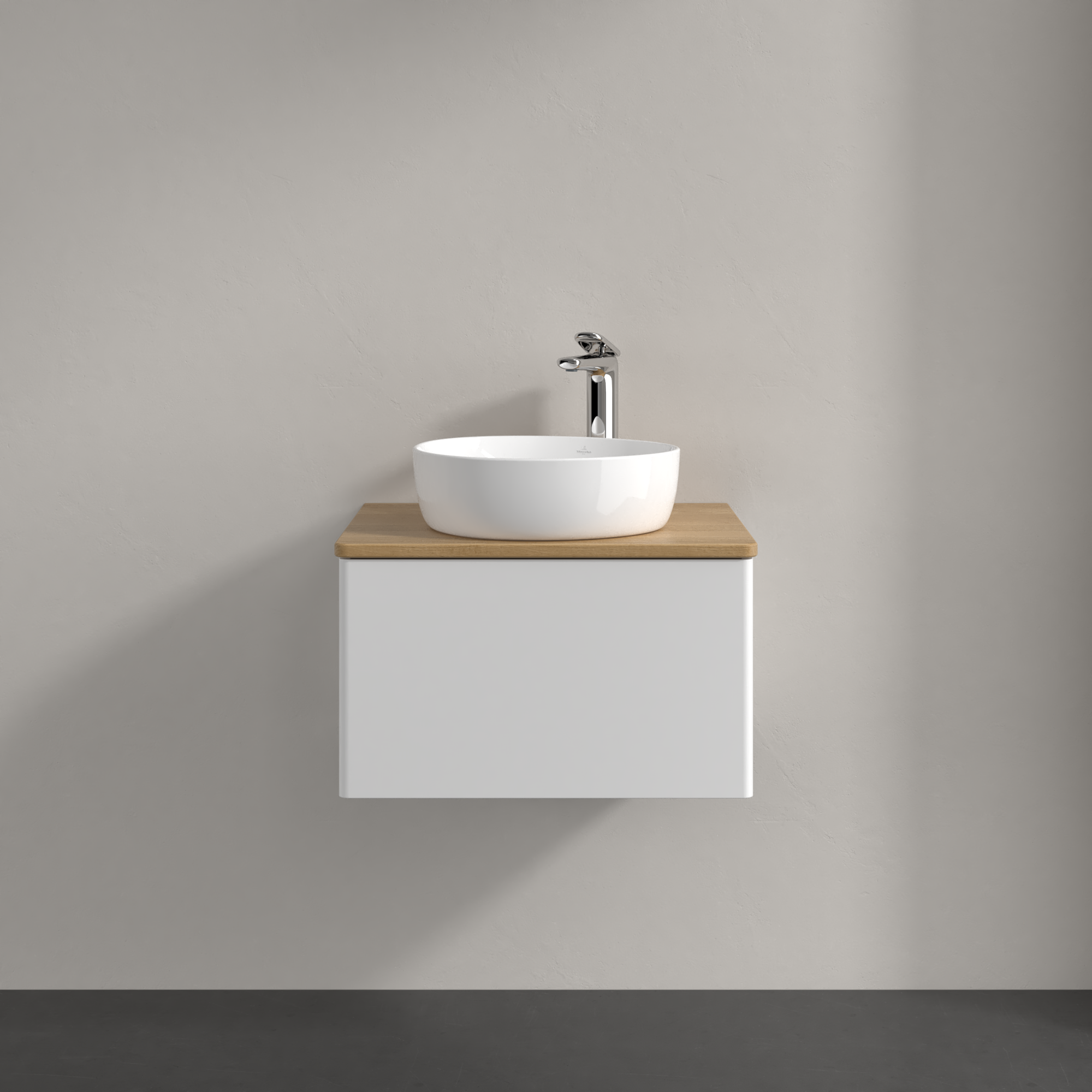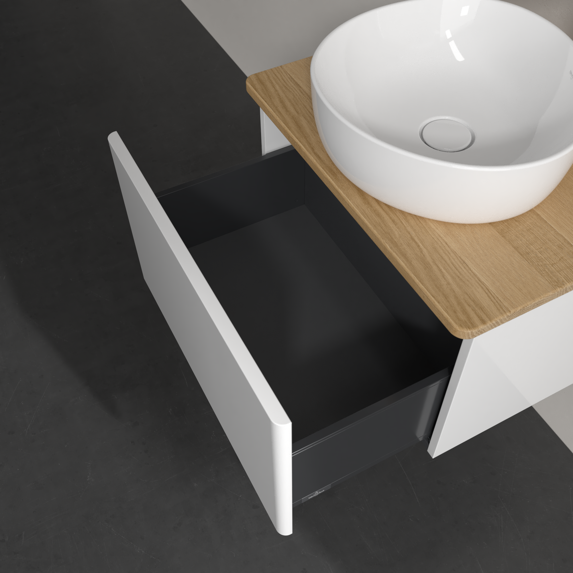Antao Meuble sous plan, 1 tiroir sur rails, 600x360x500mm, Façade sans structure, Caisson: Glossy White Lacquer, Façade: Glossy White Lacquer, Plaque de recouvrement: Honey Oak