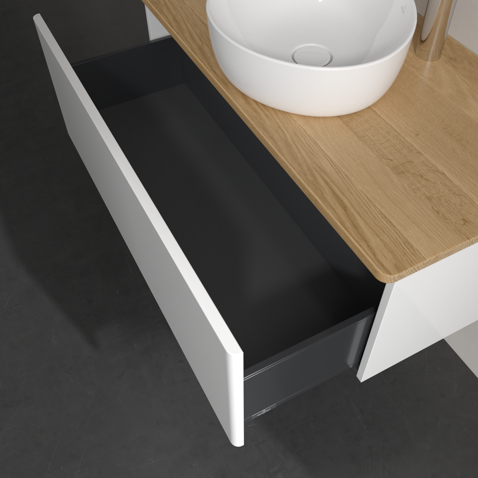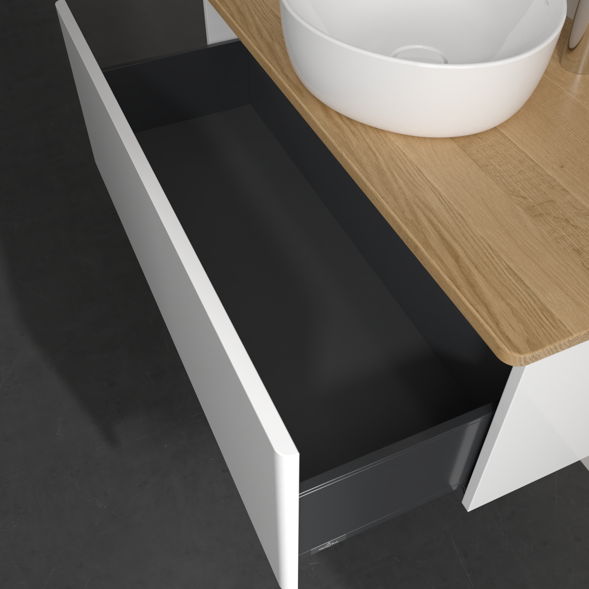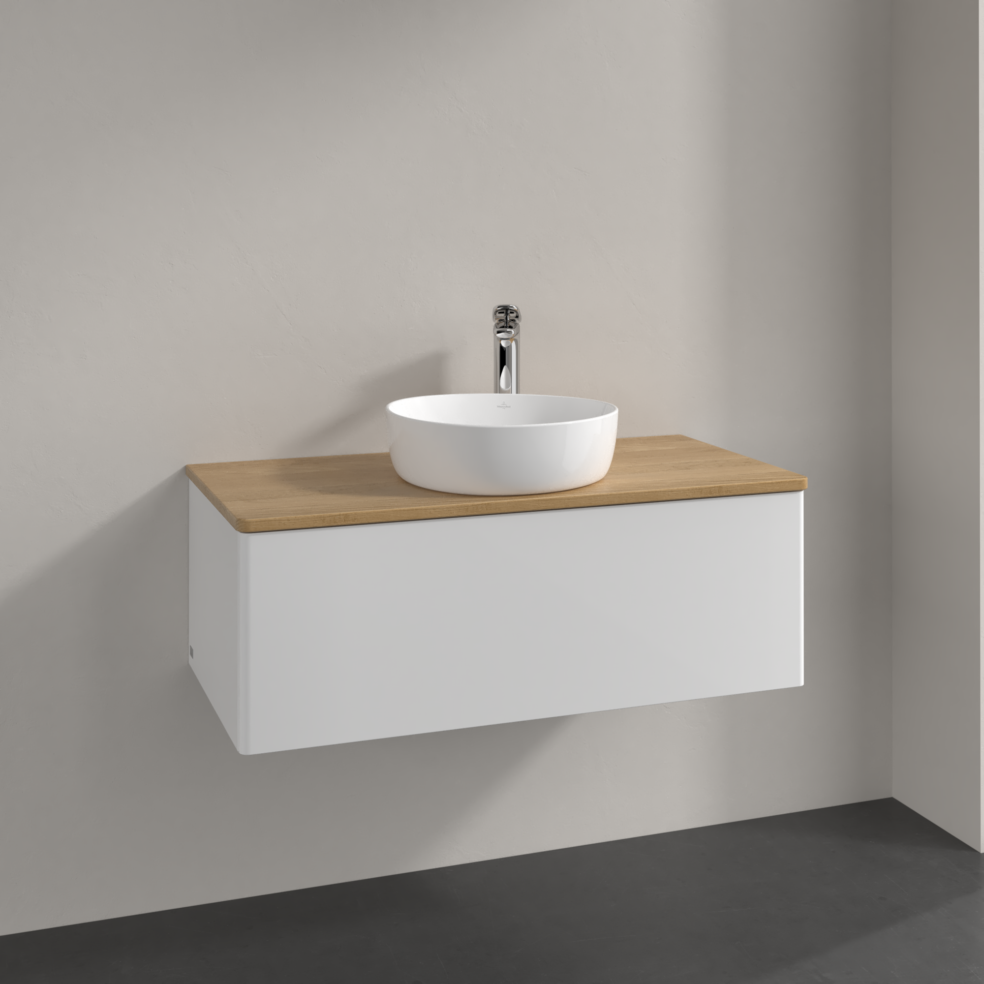 Antao Meuble sous plan, 1 tiroir sur rails, 1000x360x500mm, Façade sans structure, Caisson: Glossy White Lacquer, Façade: Glossy White Lacquer, Plaque de recouvrement: Honey Oak