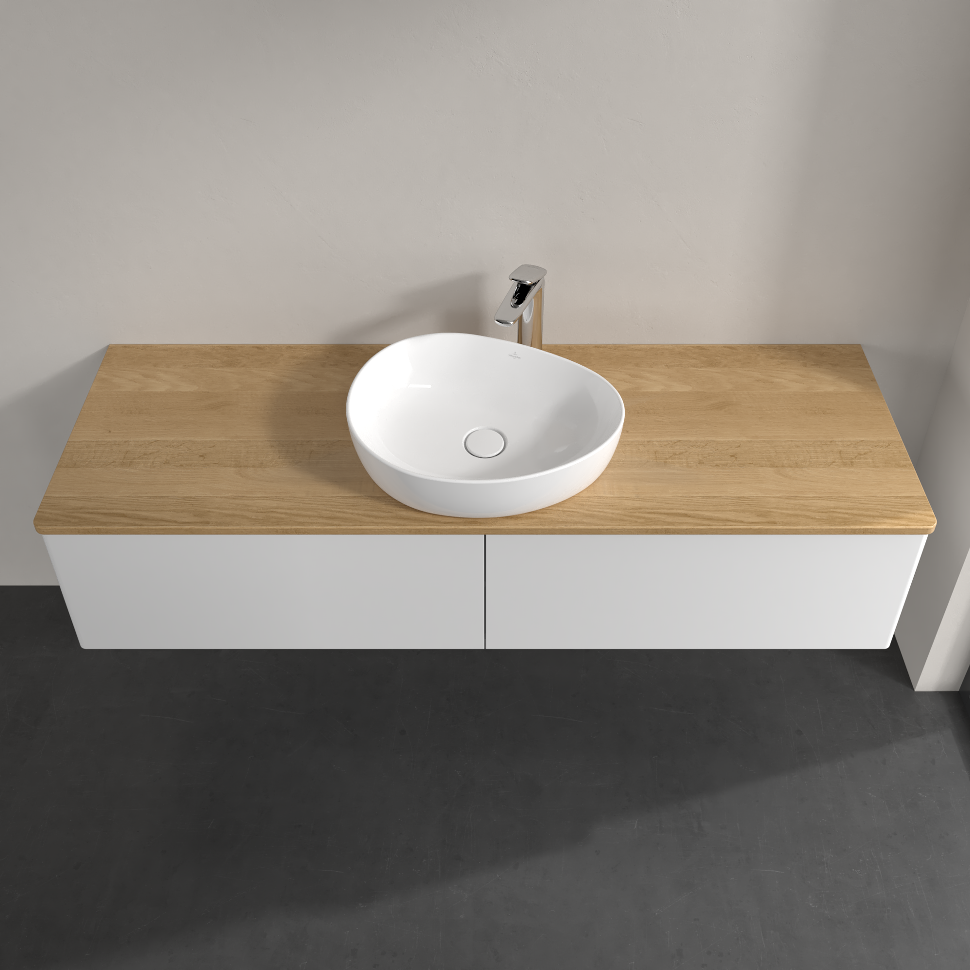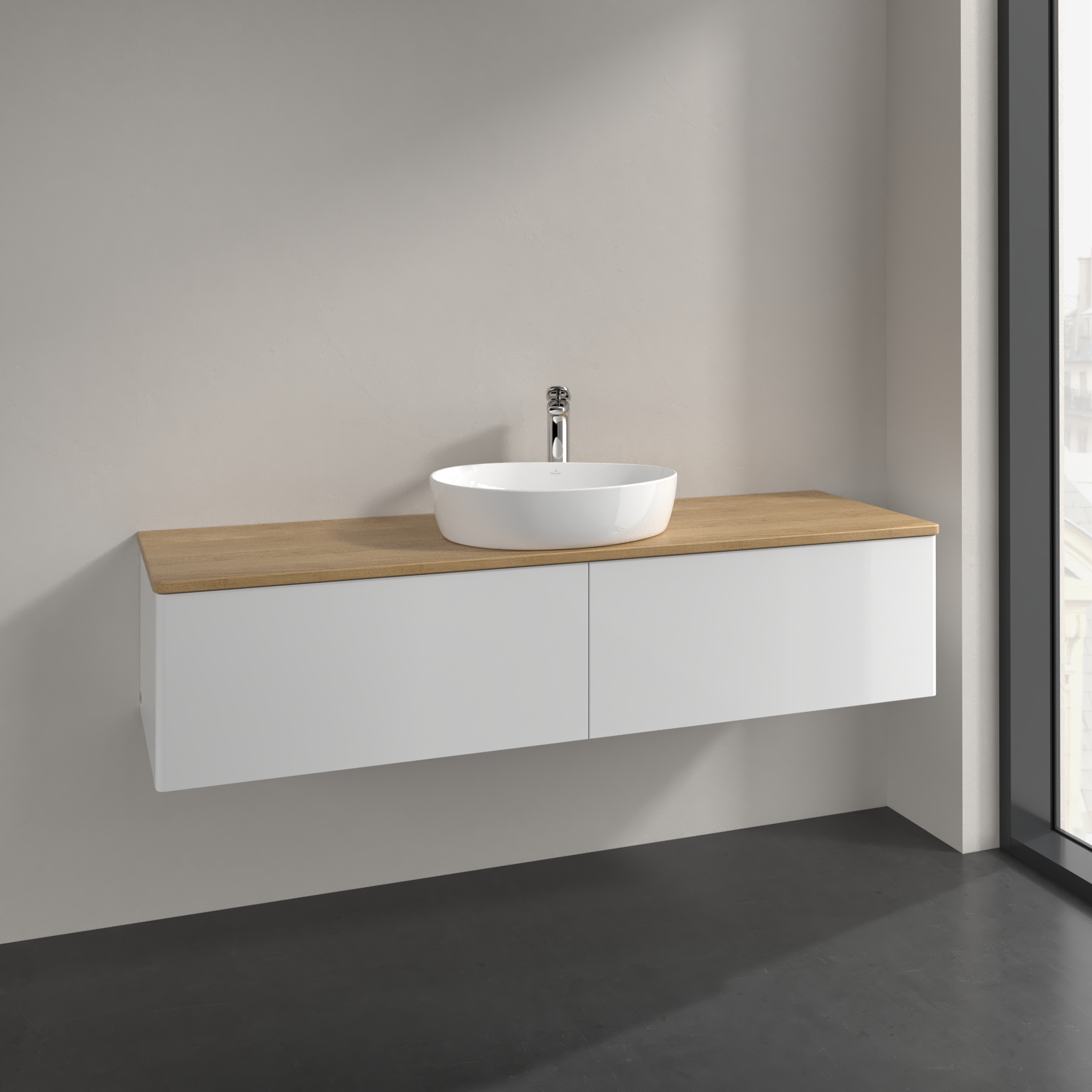 Antao Meuble sous plan, 2 tiroirs sur rails, 1600x360x500mm, Façade sans structure, Caisson: Glossy White Lacquer, Façade: Glossy White Lacquer, Plaque de recouvrement: Honey Oak