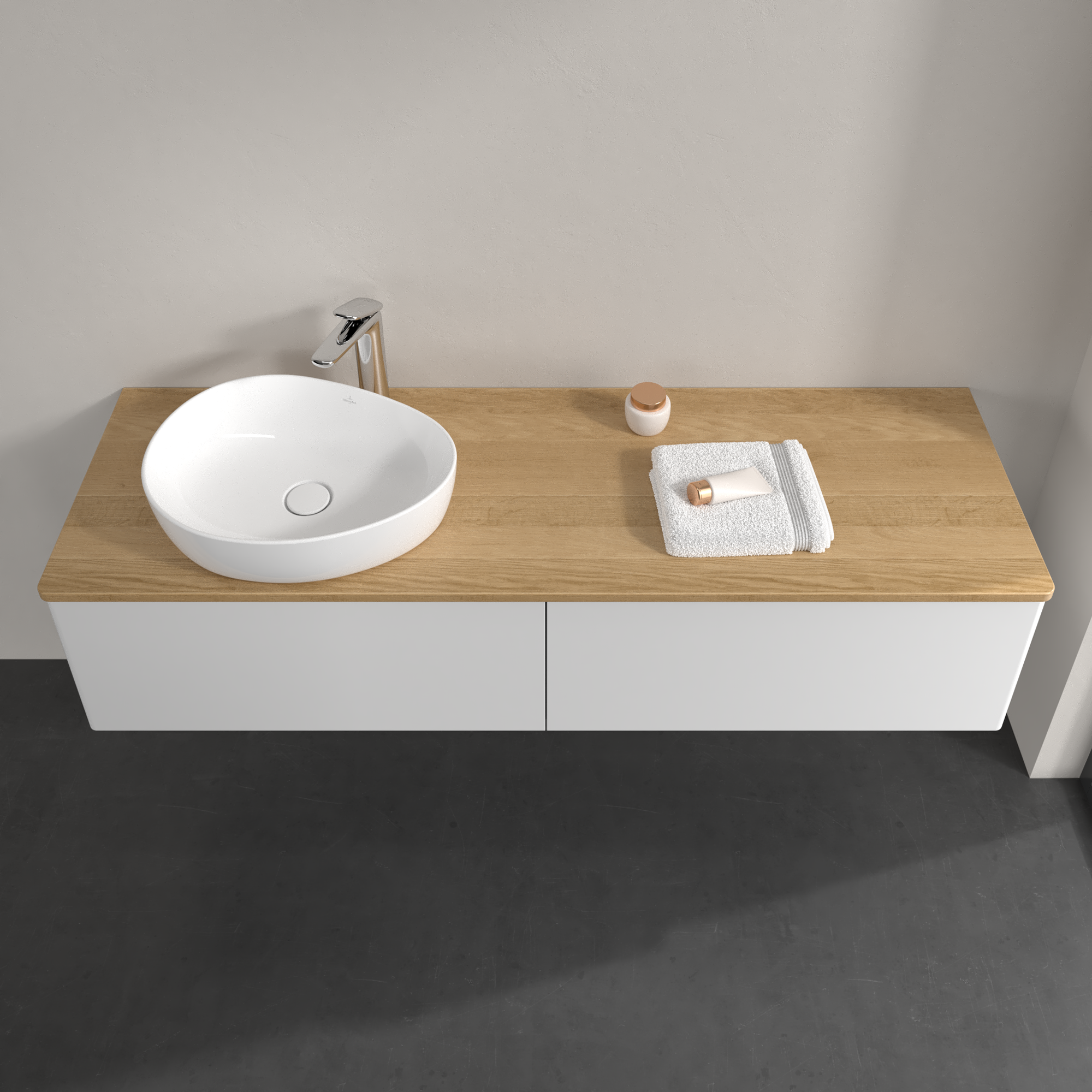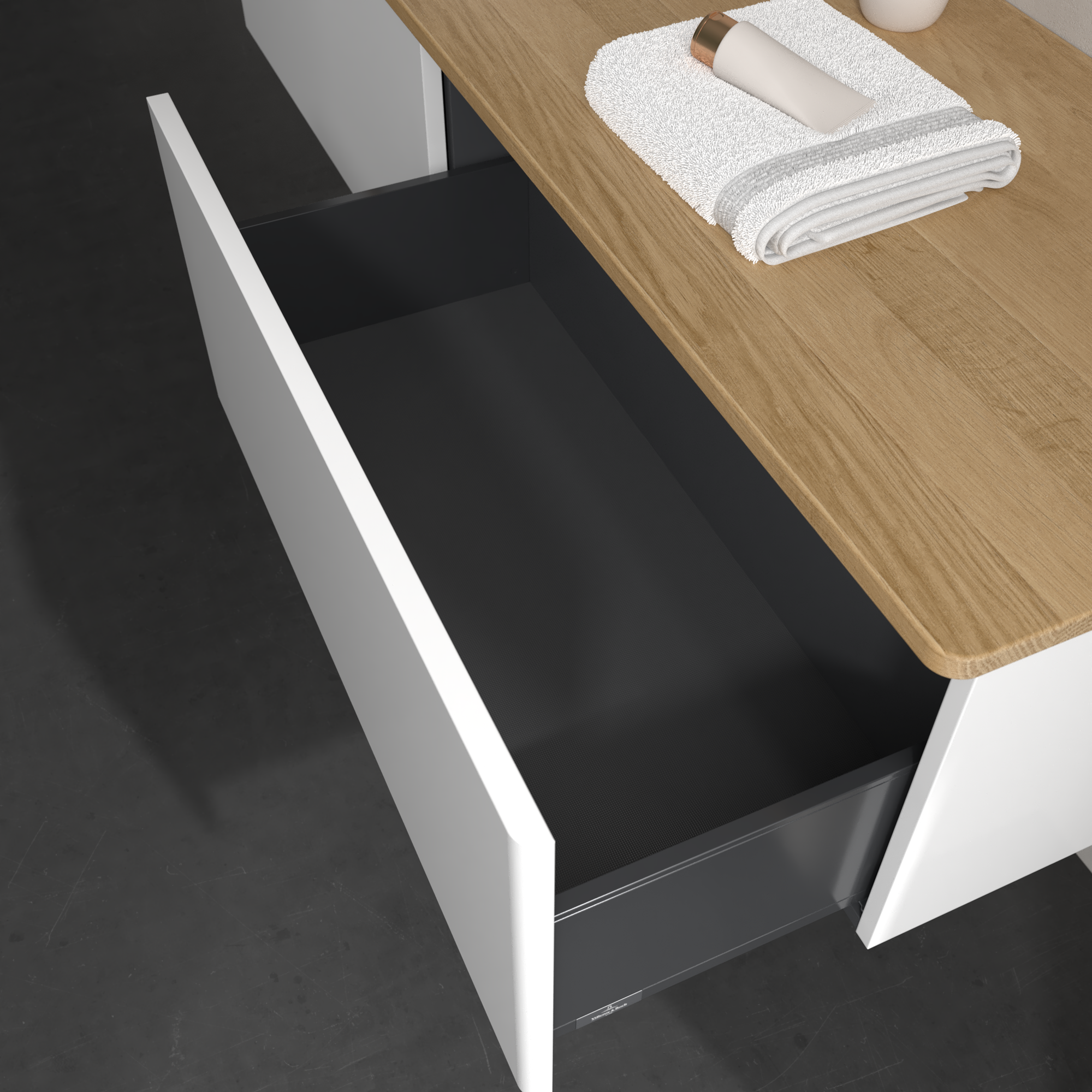 Antao Meuble sous plan, 2 tiroirs sur rails, 1600x360x500mm, Façade sans structure, Caisson: Glossy White Lacquer, Façade: Glossy White Lacquer, Plaque de recouvrement: Honey Oak