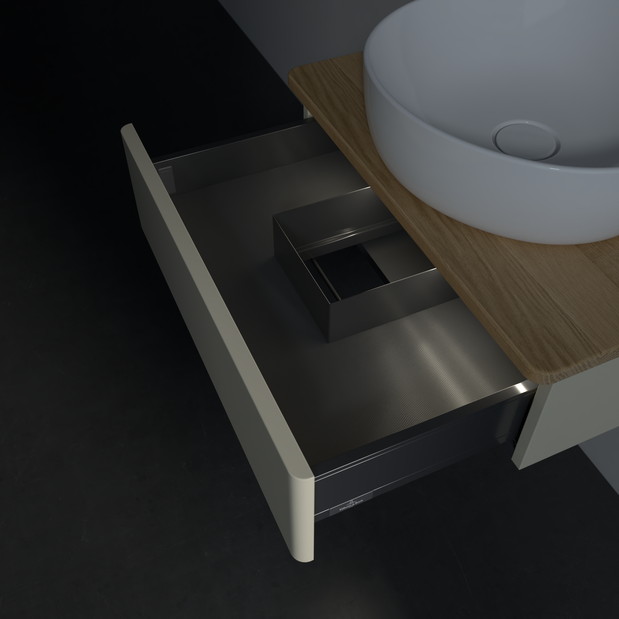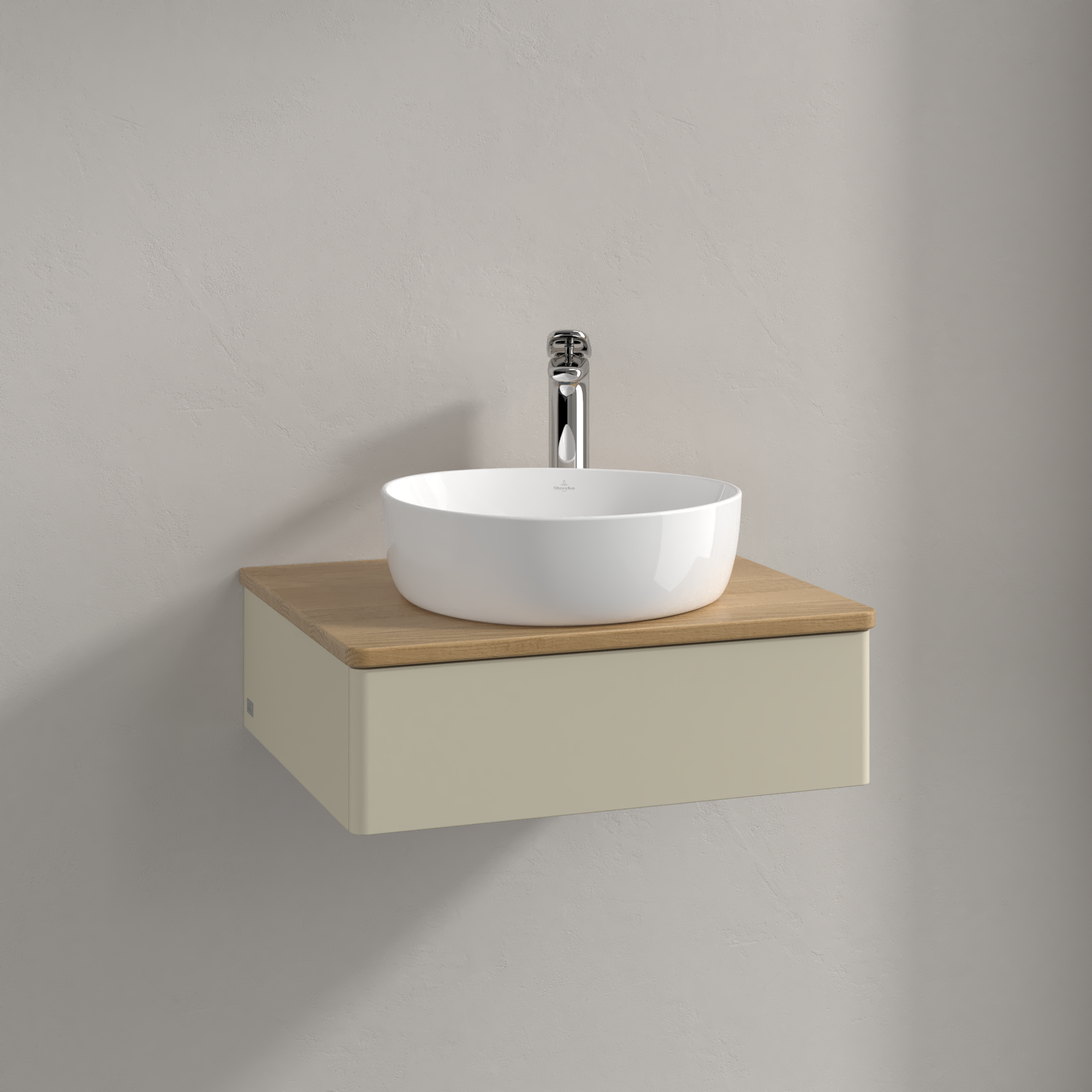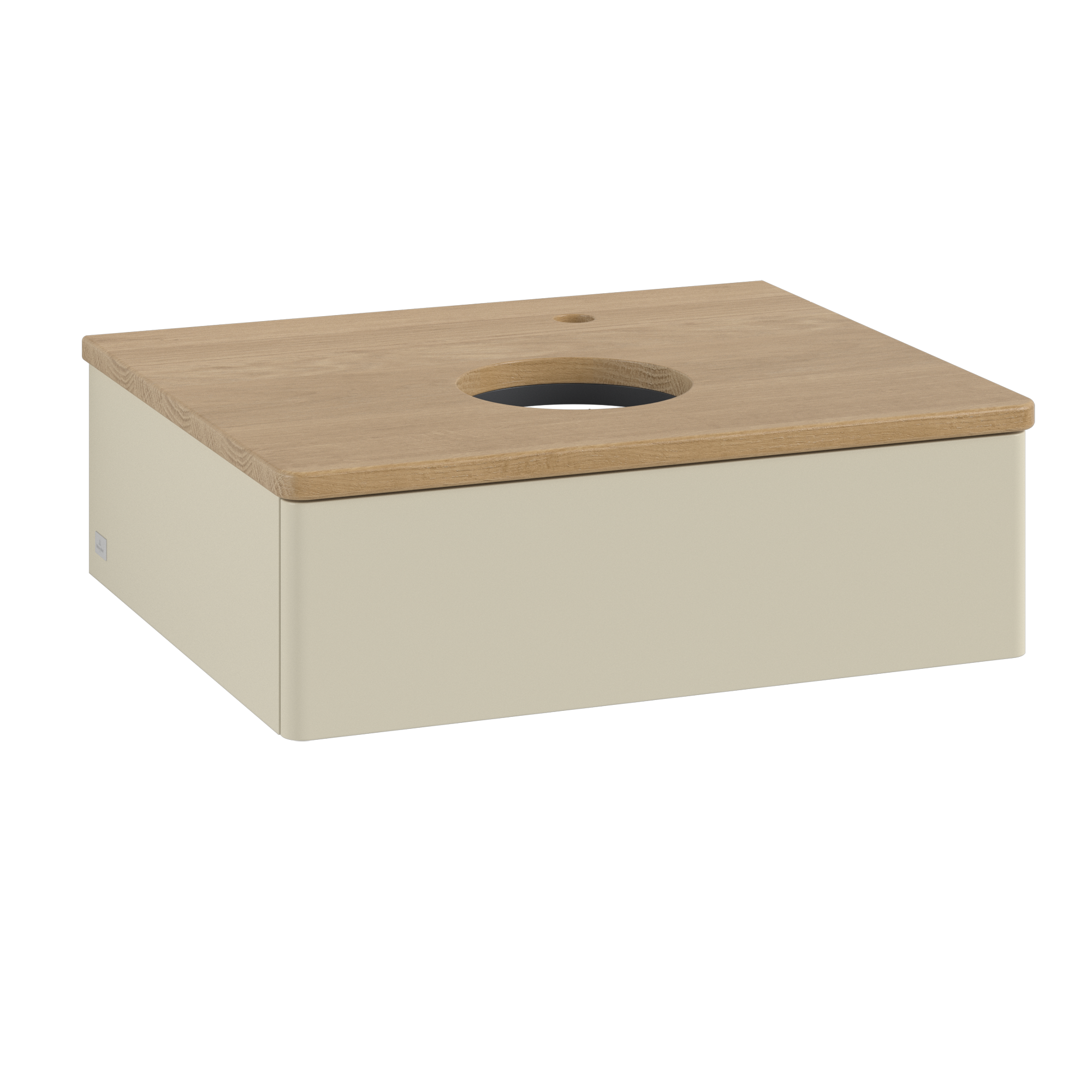 Antao Meuble sous plan, avec éclairage, 1 tiroir sur rails, 600x190x500mm, Façade sans structure, Caisson: Silk Grey Matt Lacquer, Façade: Silk Grey Matt Lacquer, Plaque de recouvrement: Honey Oak