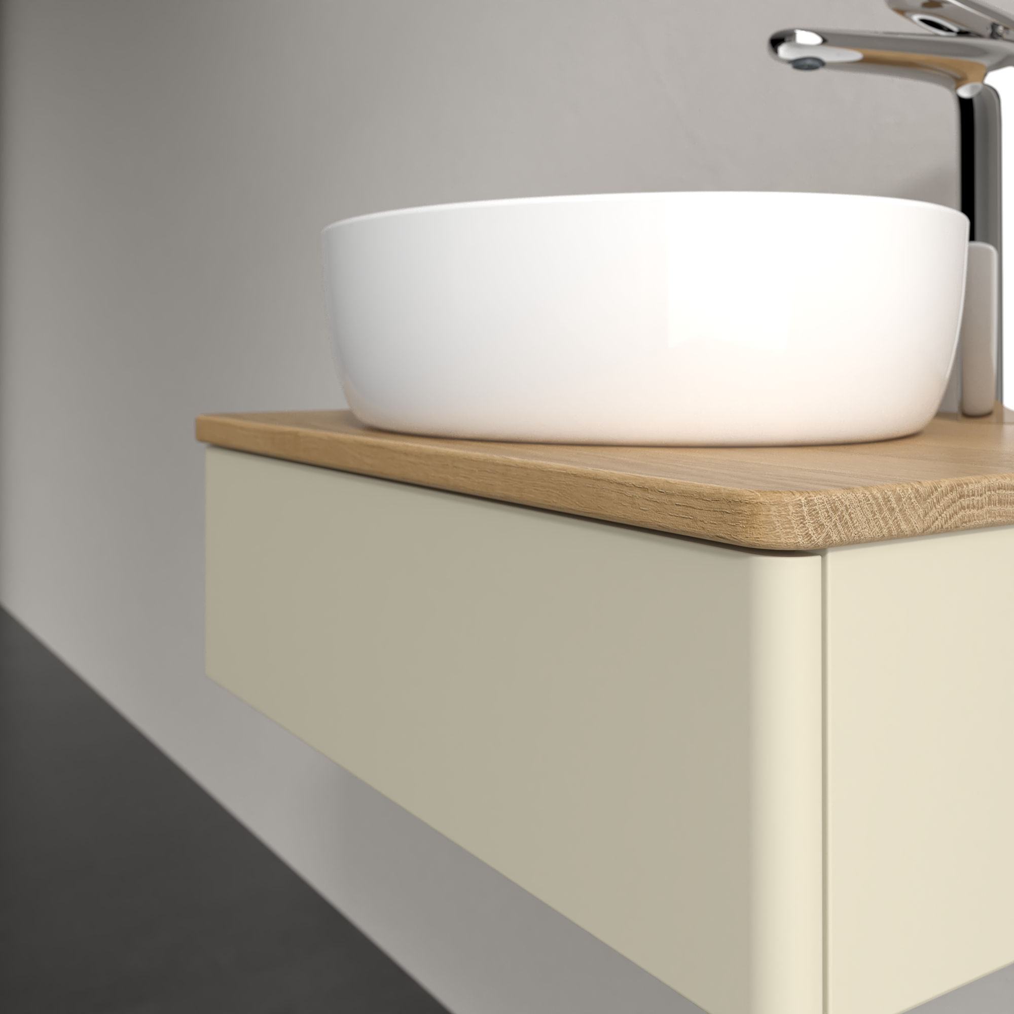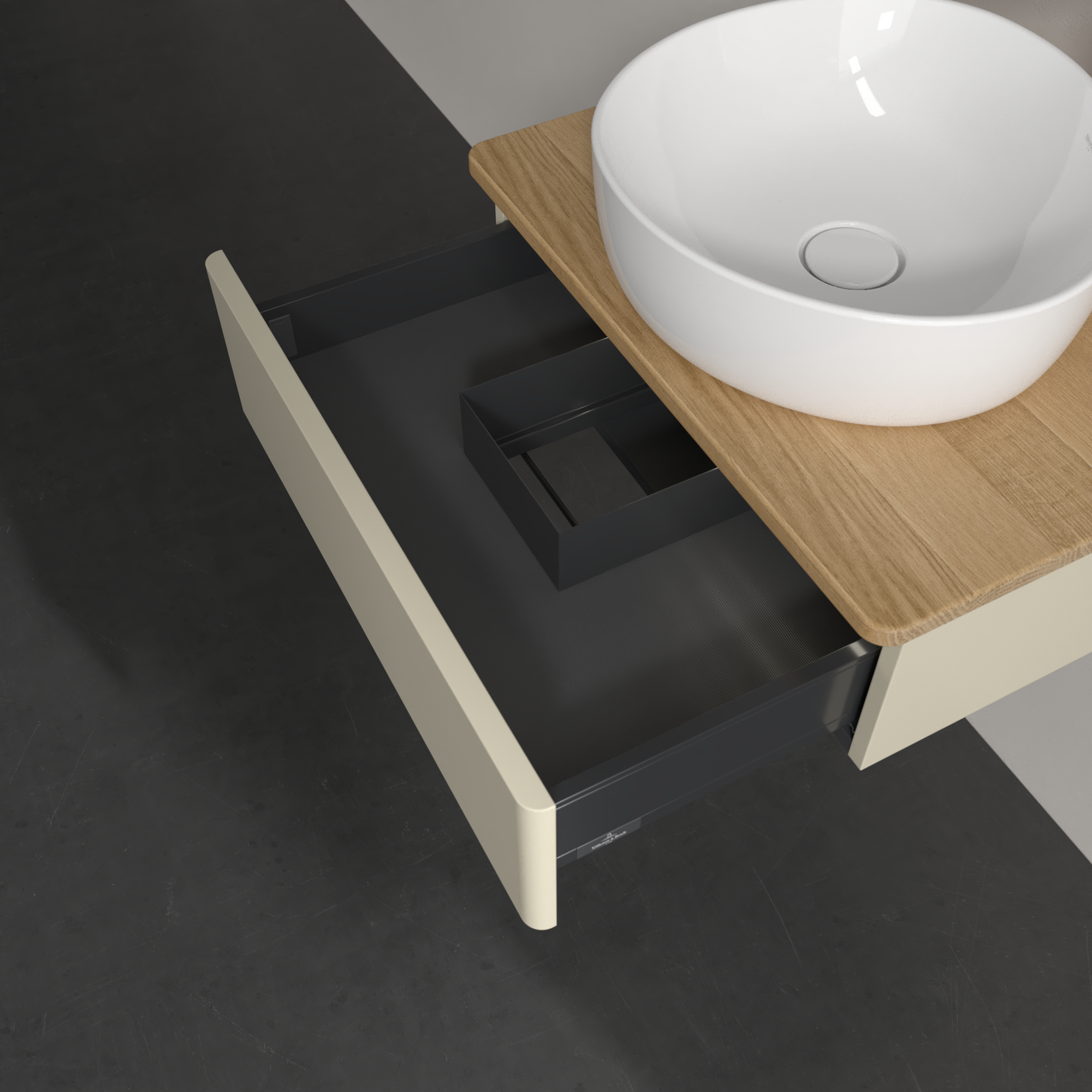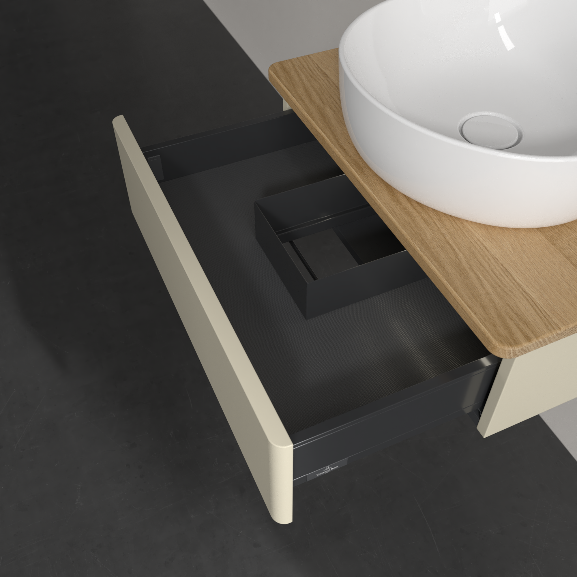 Antao Meuble sous plan, avec éclairage, 1 tiroir sur rails, 600x190x500mm, Façade sans structure, Caisson: Silk Grey Matt Lacquer, Façade: Silk Grey Matt Lacquer, Plaque de recouvrement: Honey Oak