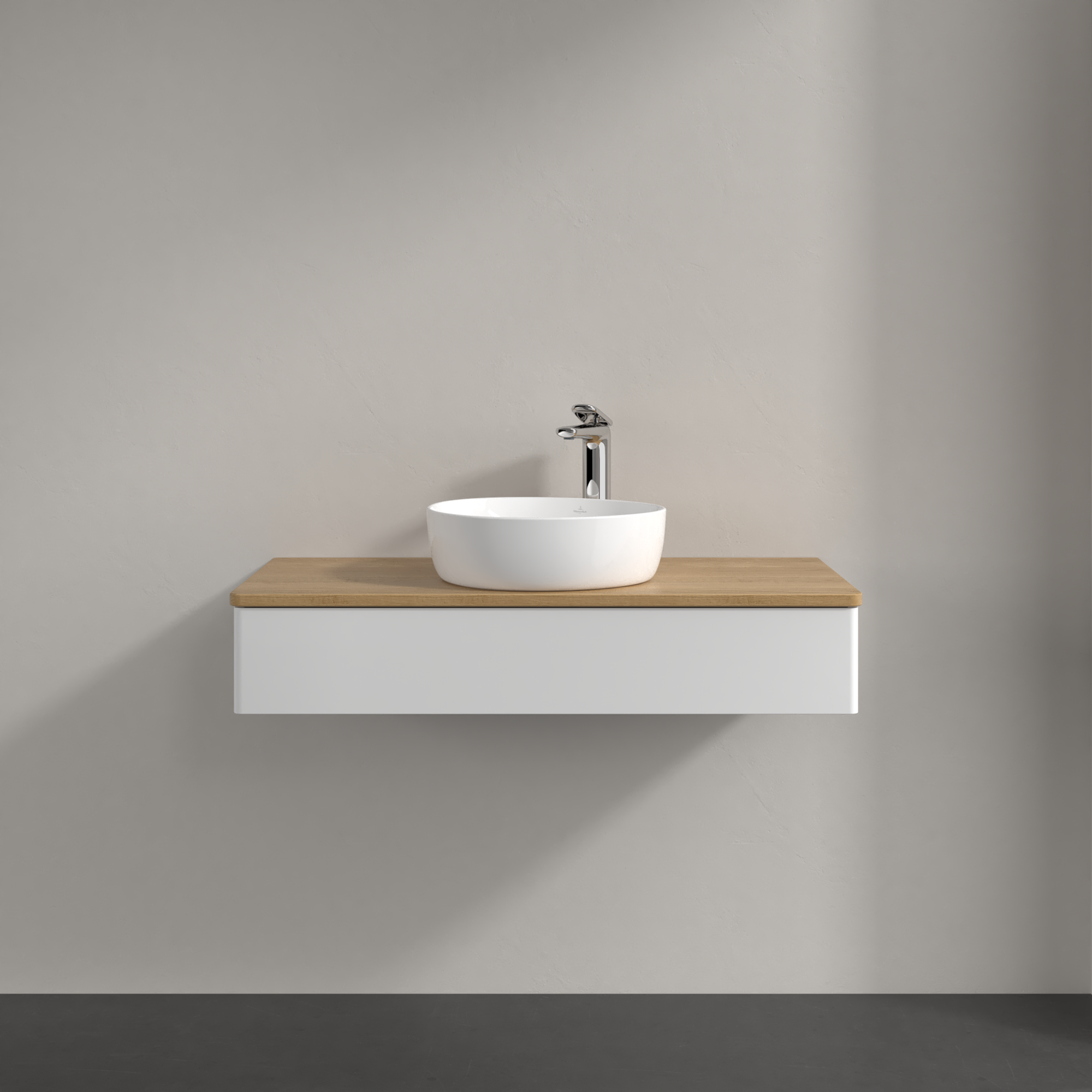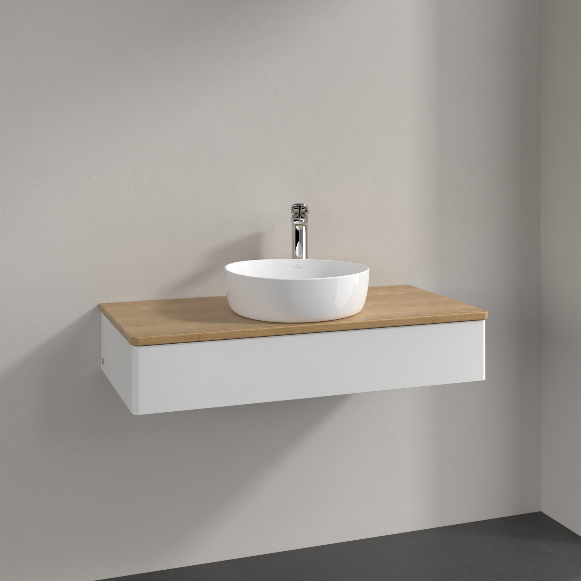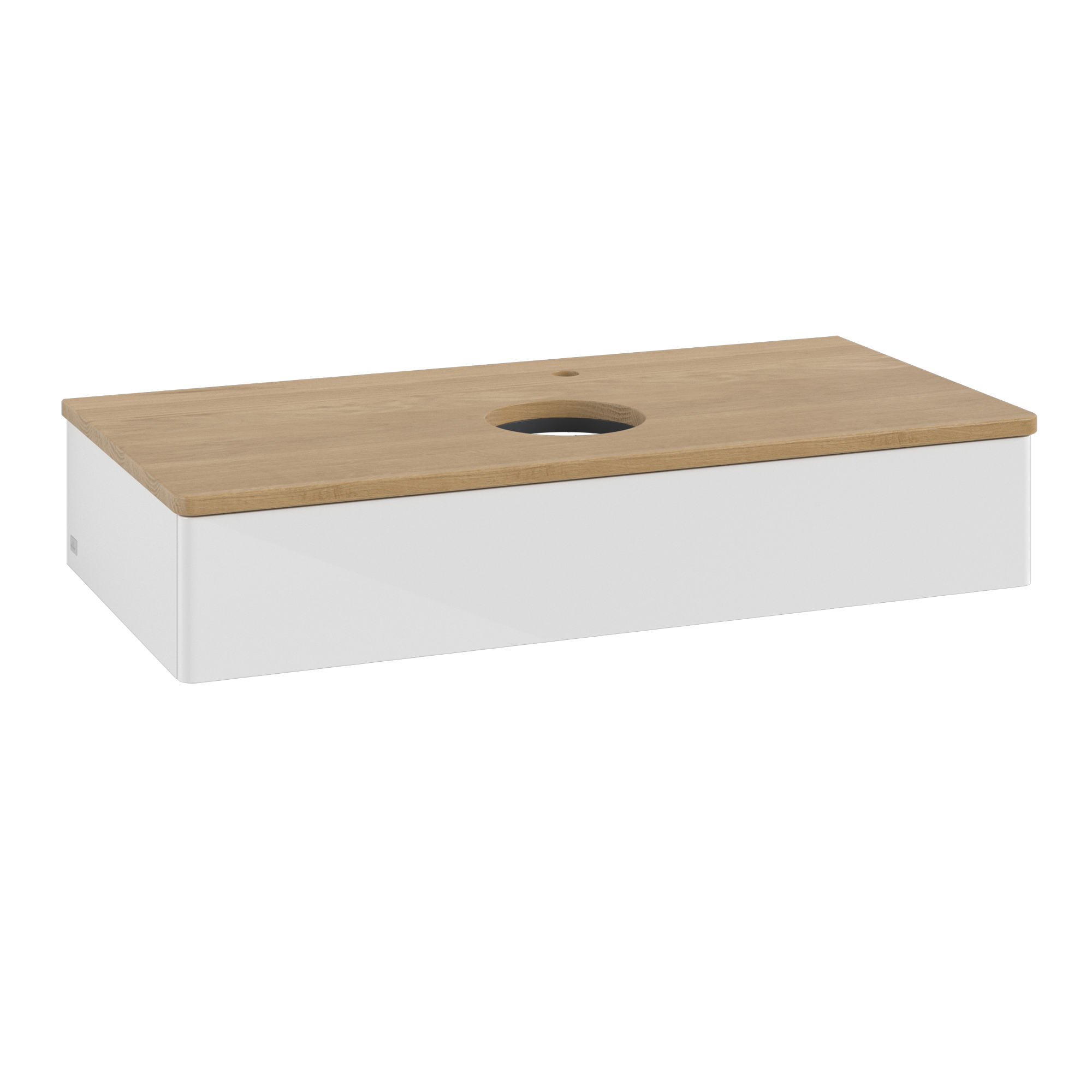 Antao Meuble sous plan, avec éclairage, 1 tiroir sur rails, 1000x190x500mm, Façade sans structure, Caisson: Glossy White Lacquer, Façade: Glossy White Lacquer, Plaque de recouvrement: Honey Oak