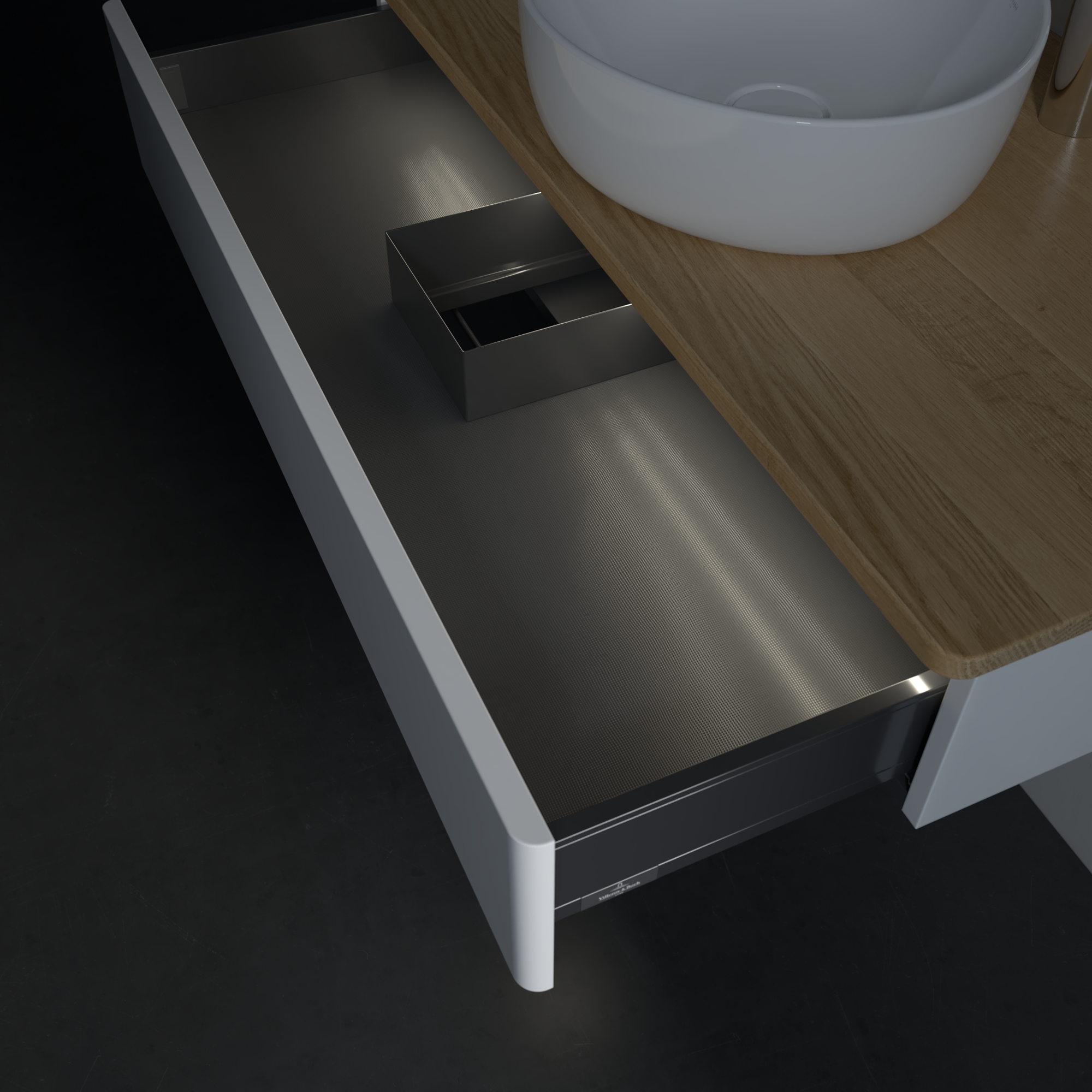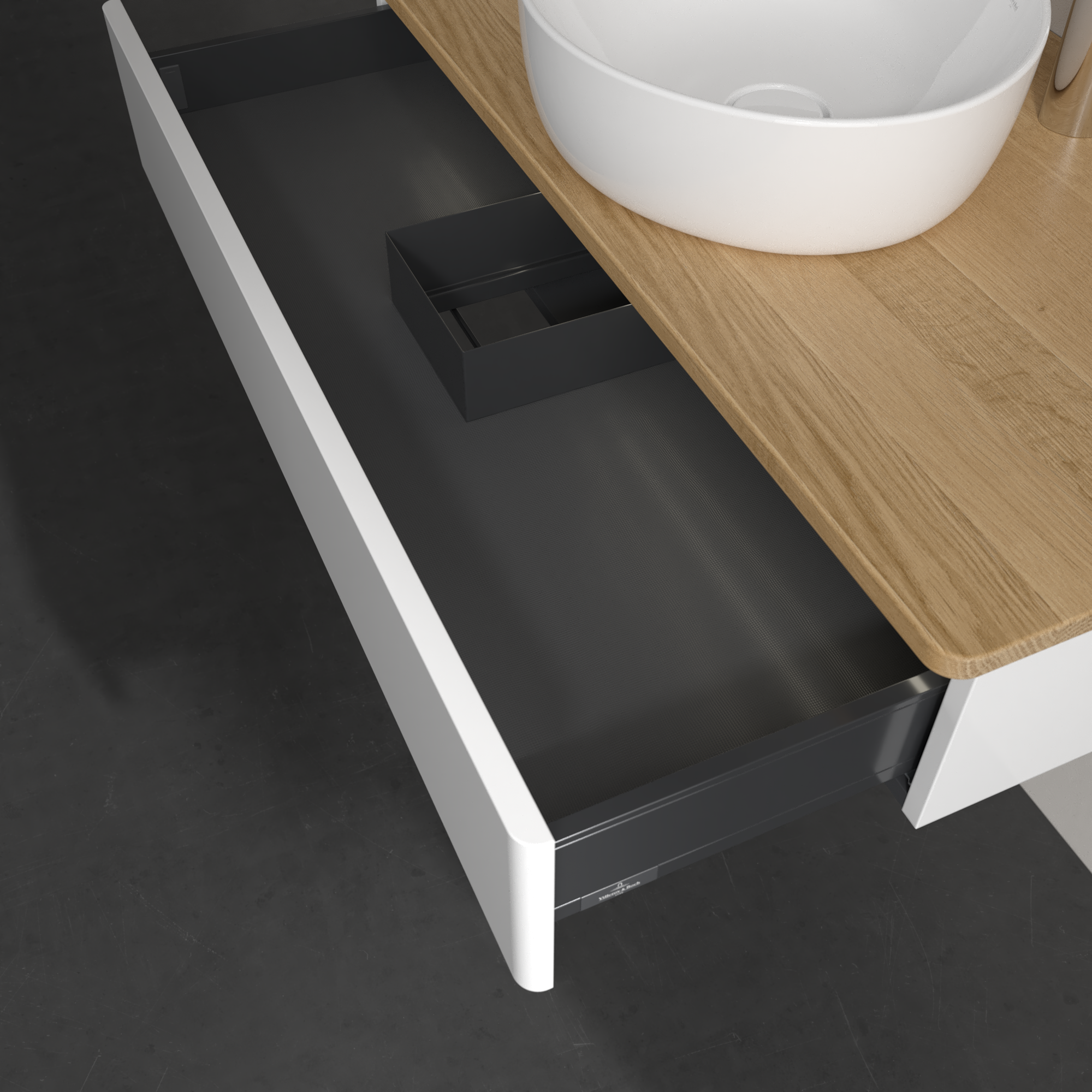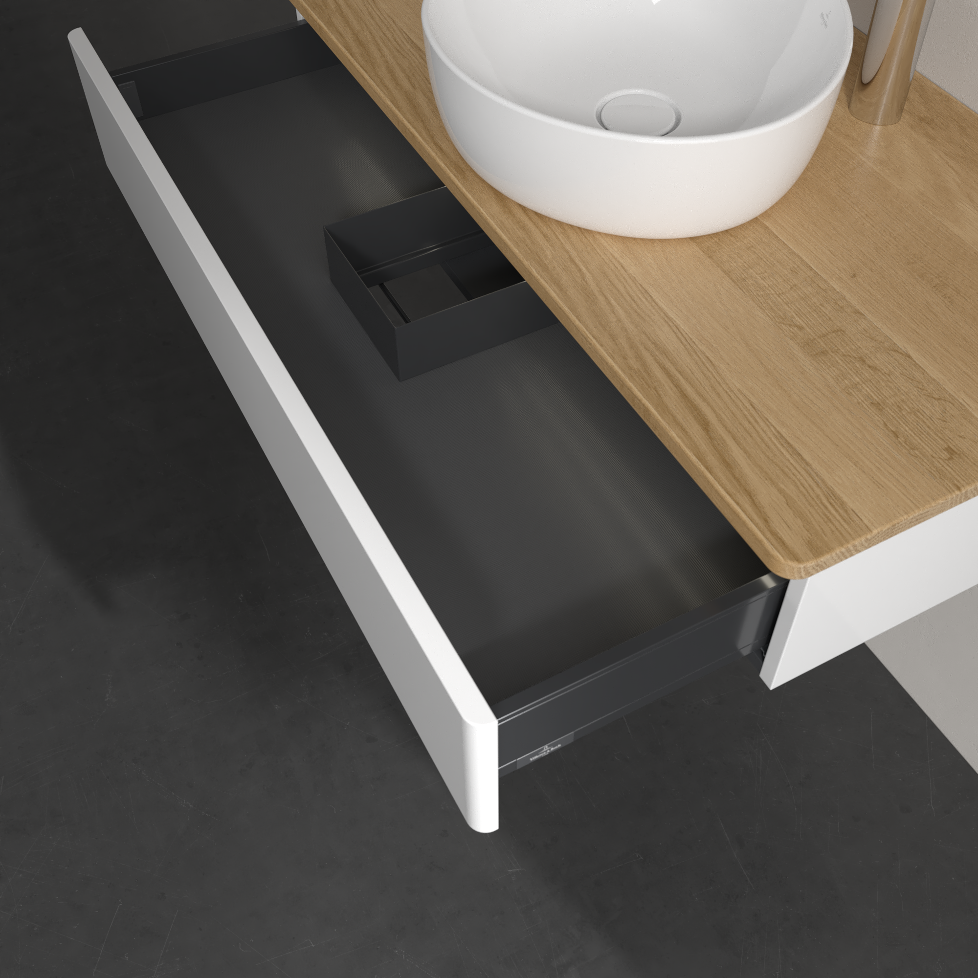 Antao Meuble sous plan, avec éclairage, 1 tiroir sur rails, 1000x190x500mm, Façade sans structure, Caisson: Glossy White Lacquer, Façade: Glossy White Lacquer, Plaque de recouvrement: Honey Oak
