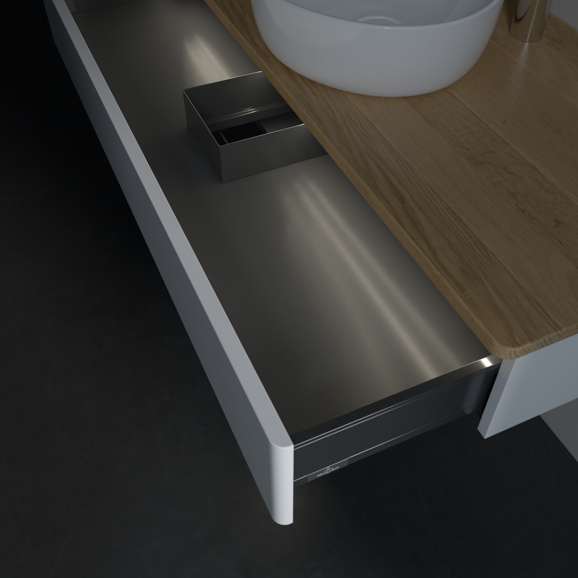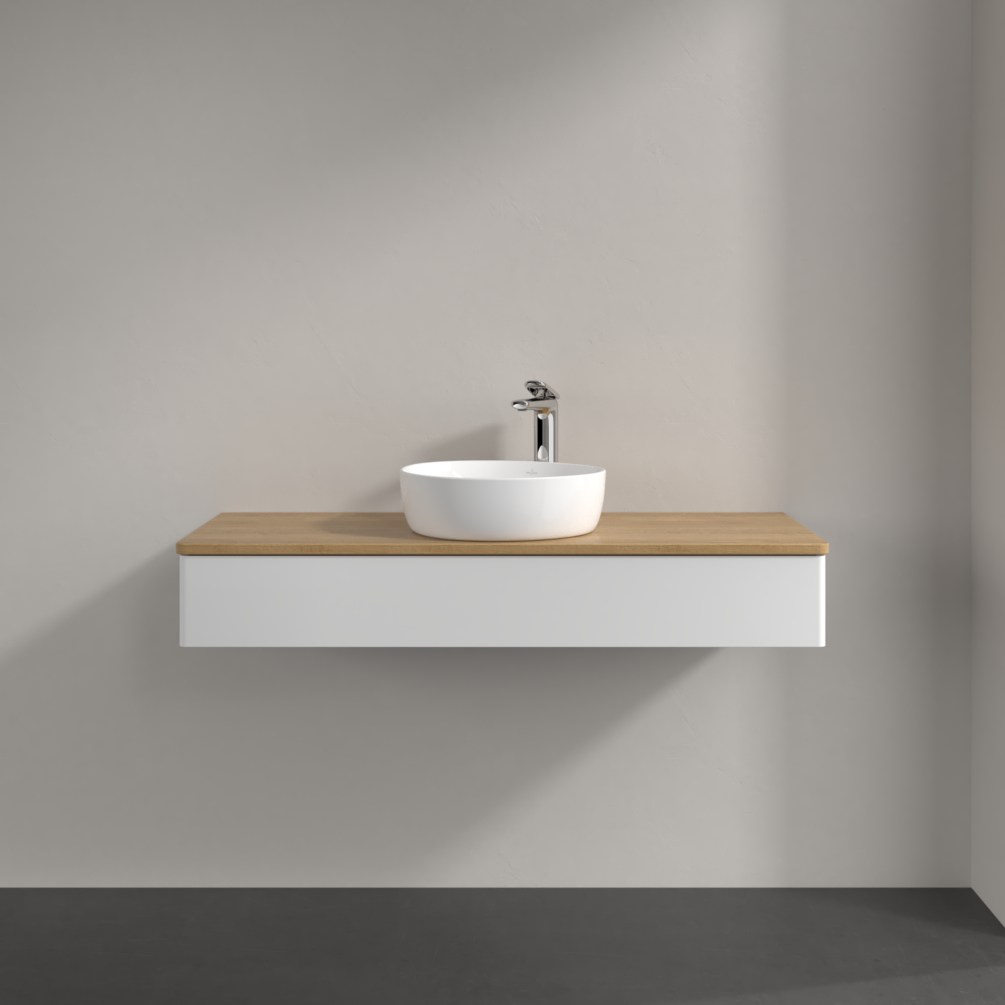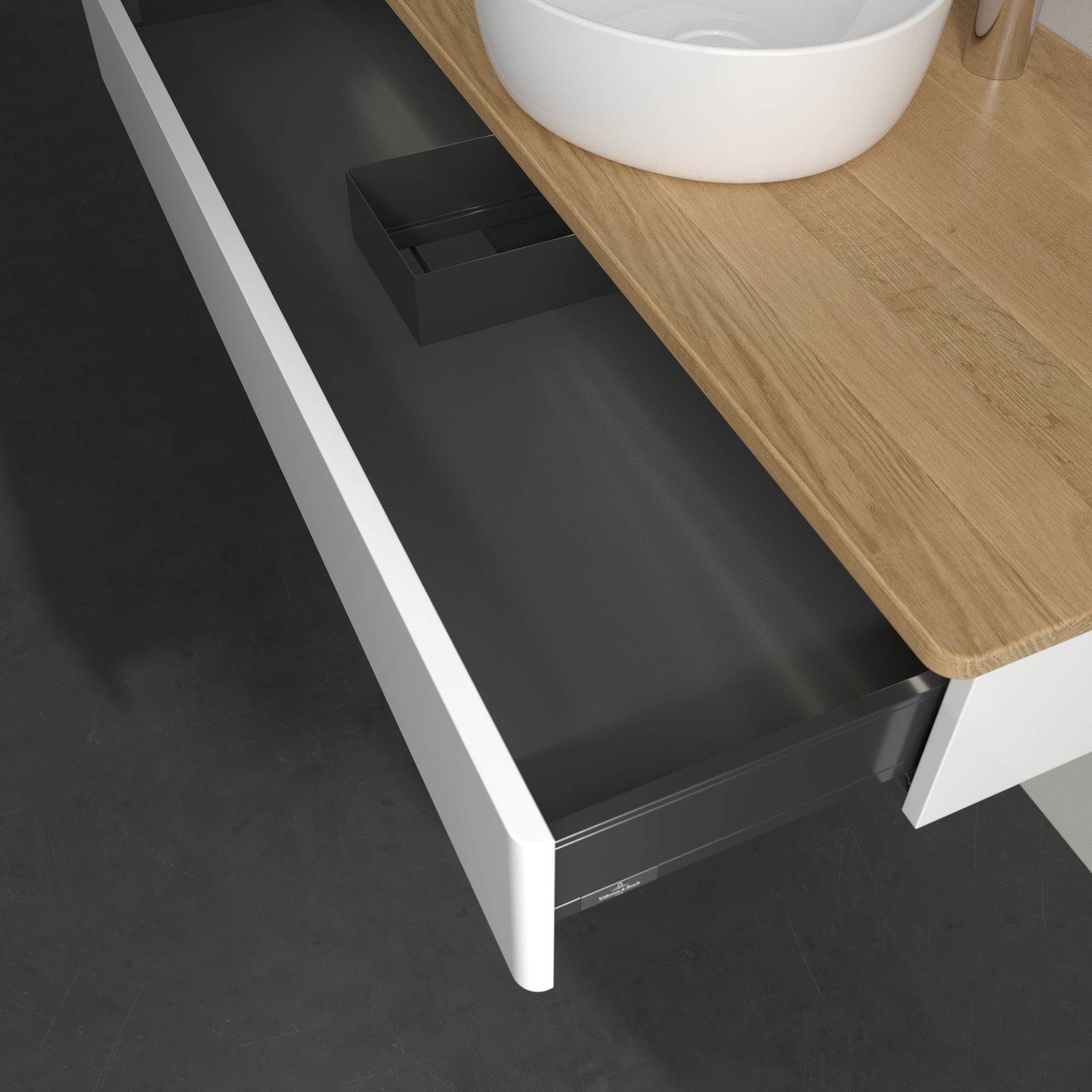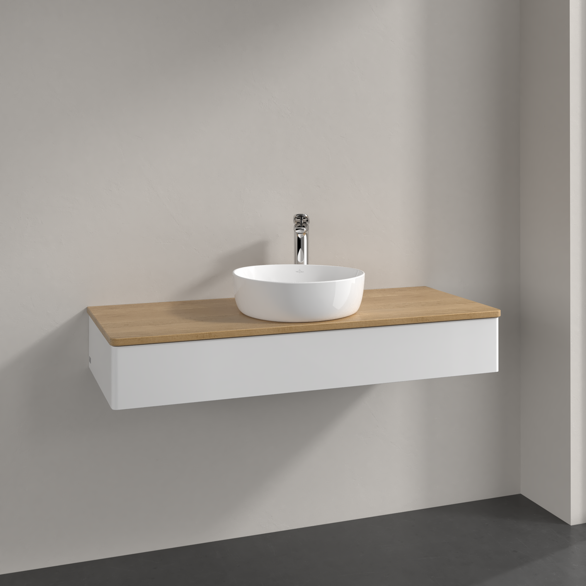 Antao Meuble sous plan, avec éclairage, 1 tiroir sur rails, 1200x190x500mm, Façade sans structure, Caisson: Glossy White Lacquer, Façade: Glossy White Lacquer, Plaque de recouvrement: Honey Oak