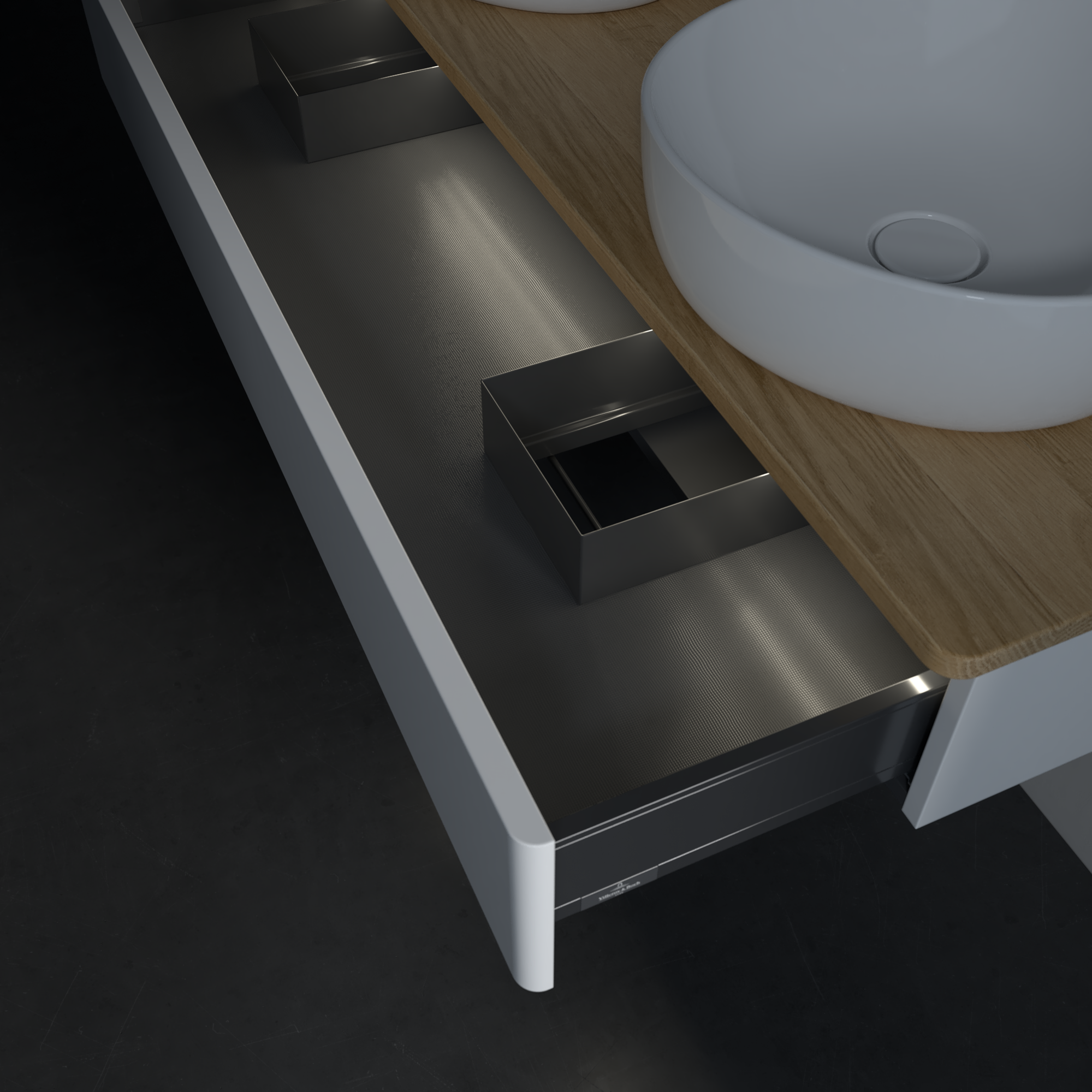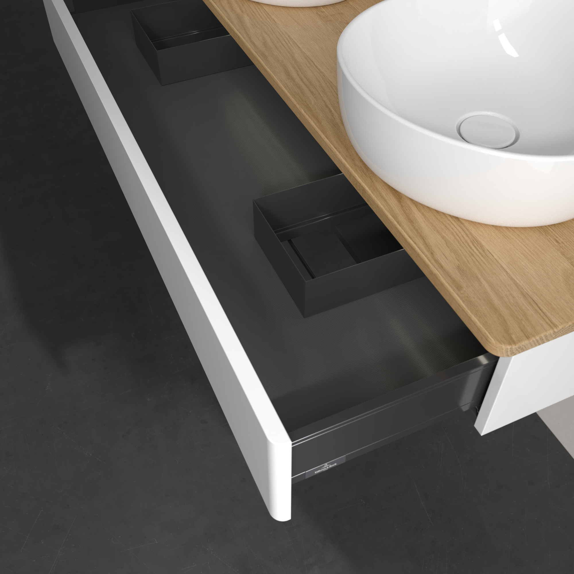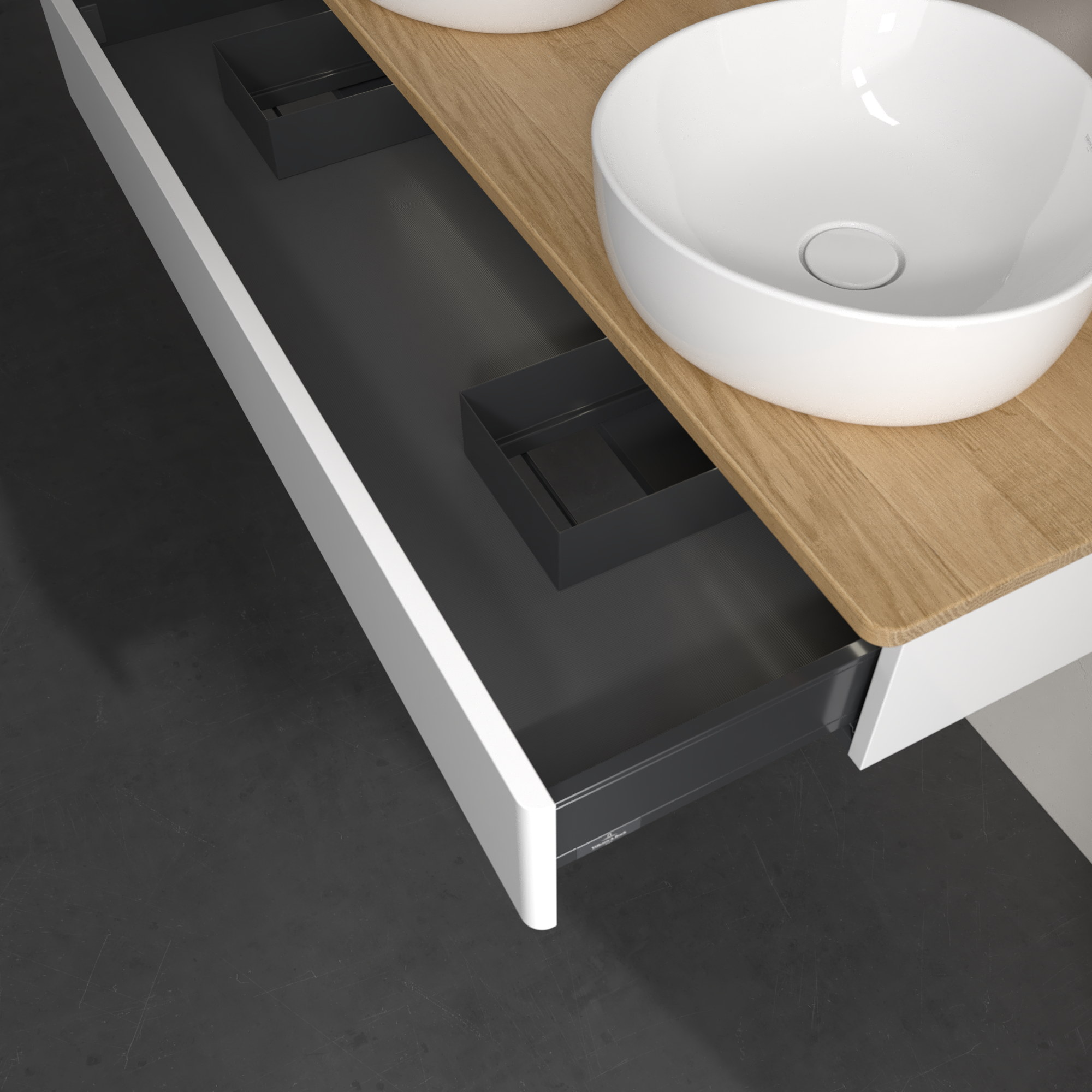 Antao Meuble sous plan, avec éclairage, 1 tiroir sur rails, 1200x190x500mm, Façade sans structure, Caisson: Glossy White Lacquer, Façade: Glossy White Lacquer, Plaque de recouvrement: Honey Oak