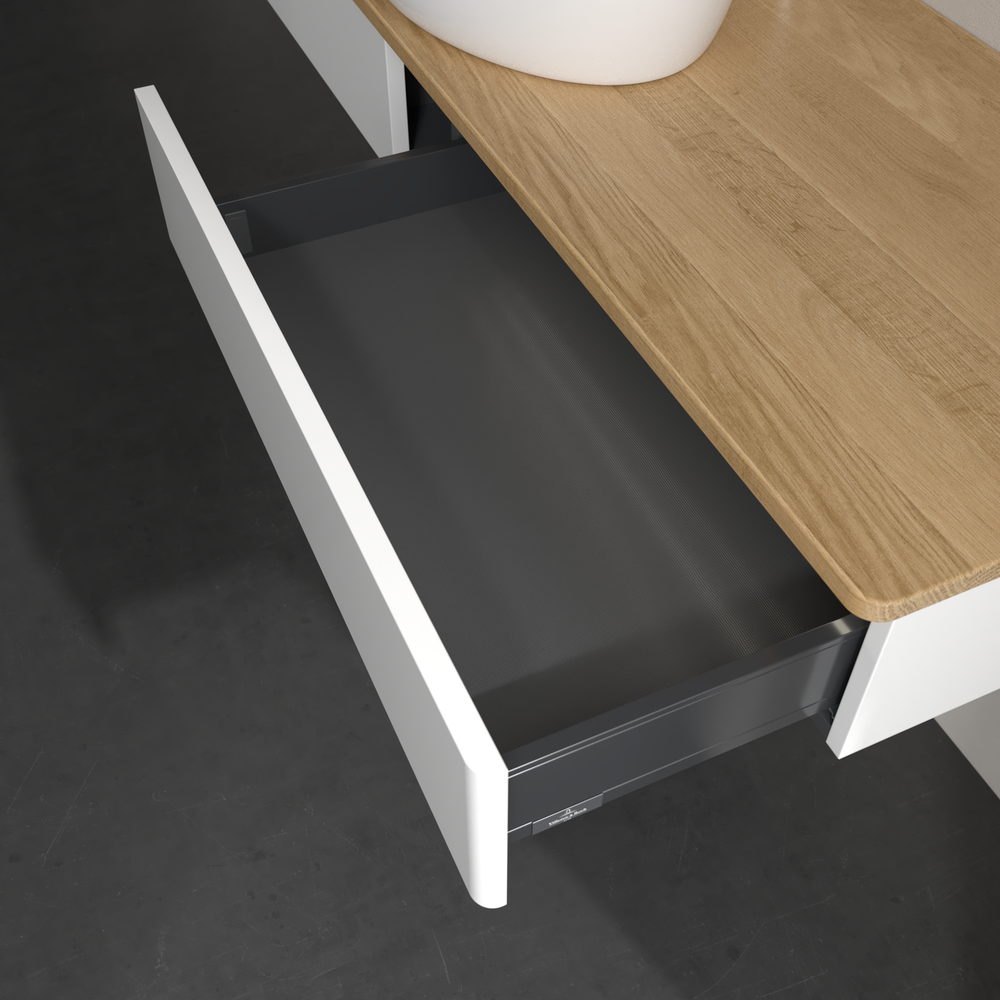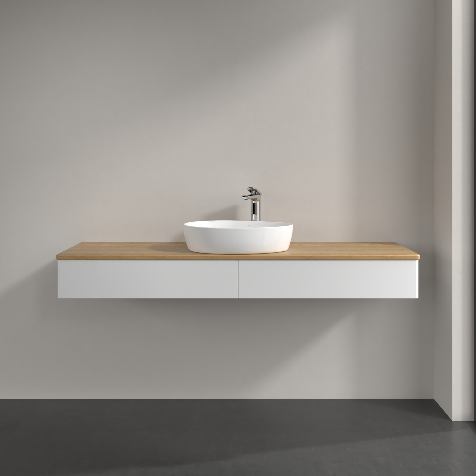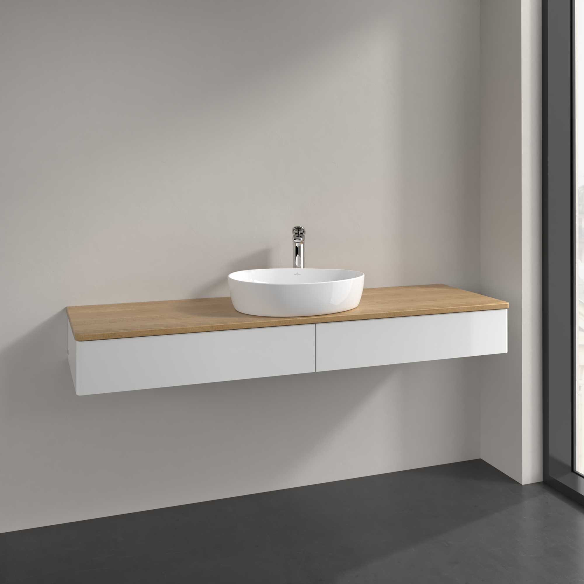 Antao Meuble sous plan, avec éclairage, 2 tiroirs sur rails, 1600x190x500mm, Façade sans structure, Caisson: Glossy White Lacquer, Façade: Glossy White Lacquer, Plaque de recouvrement: Honey Oak