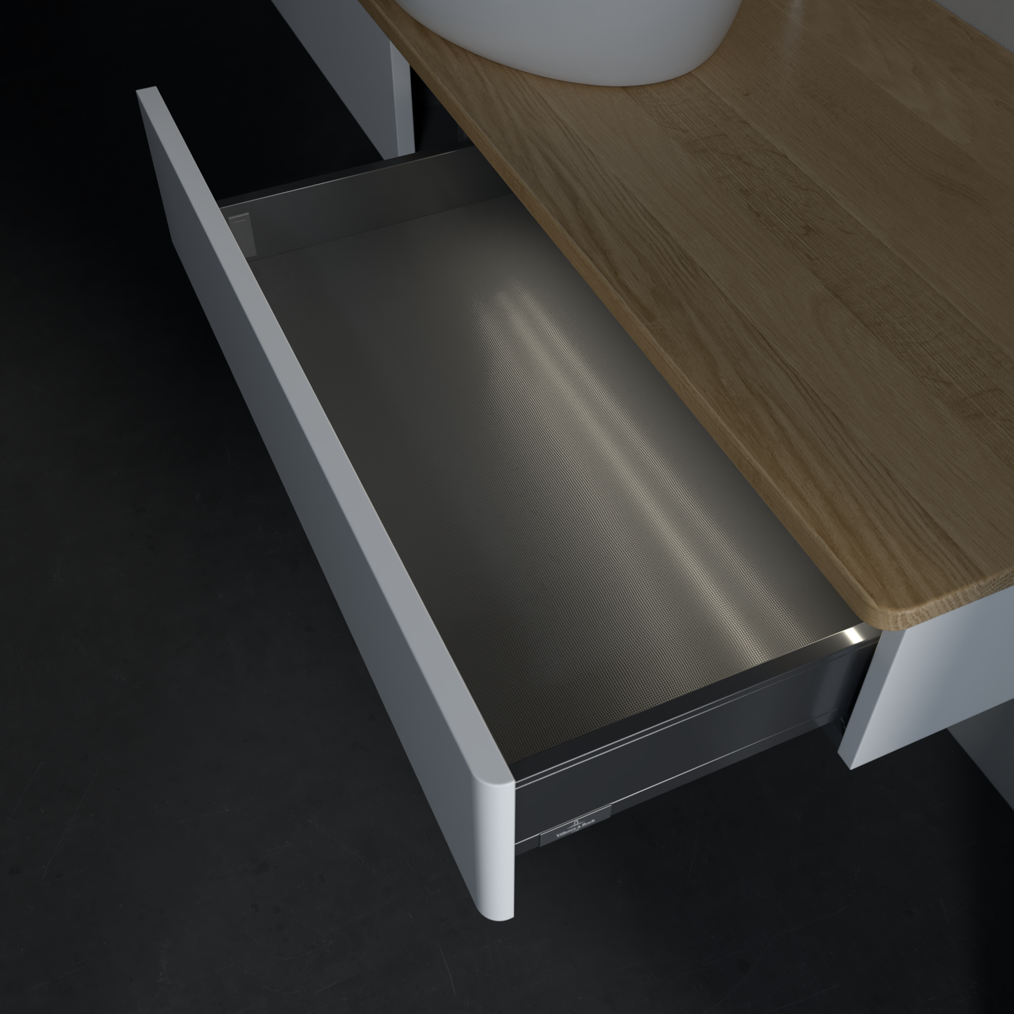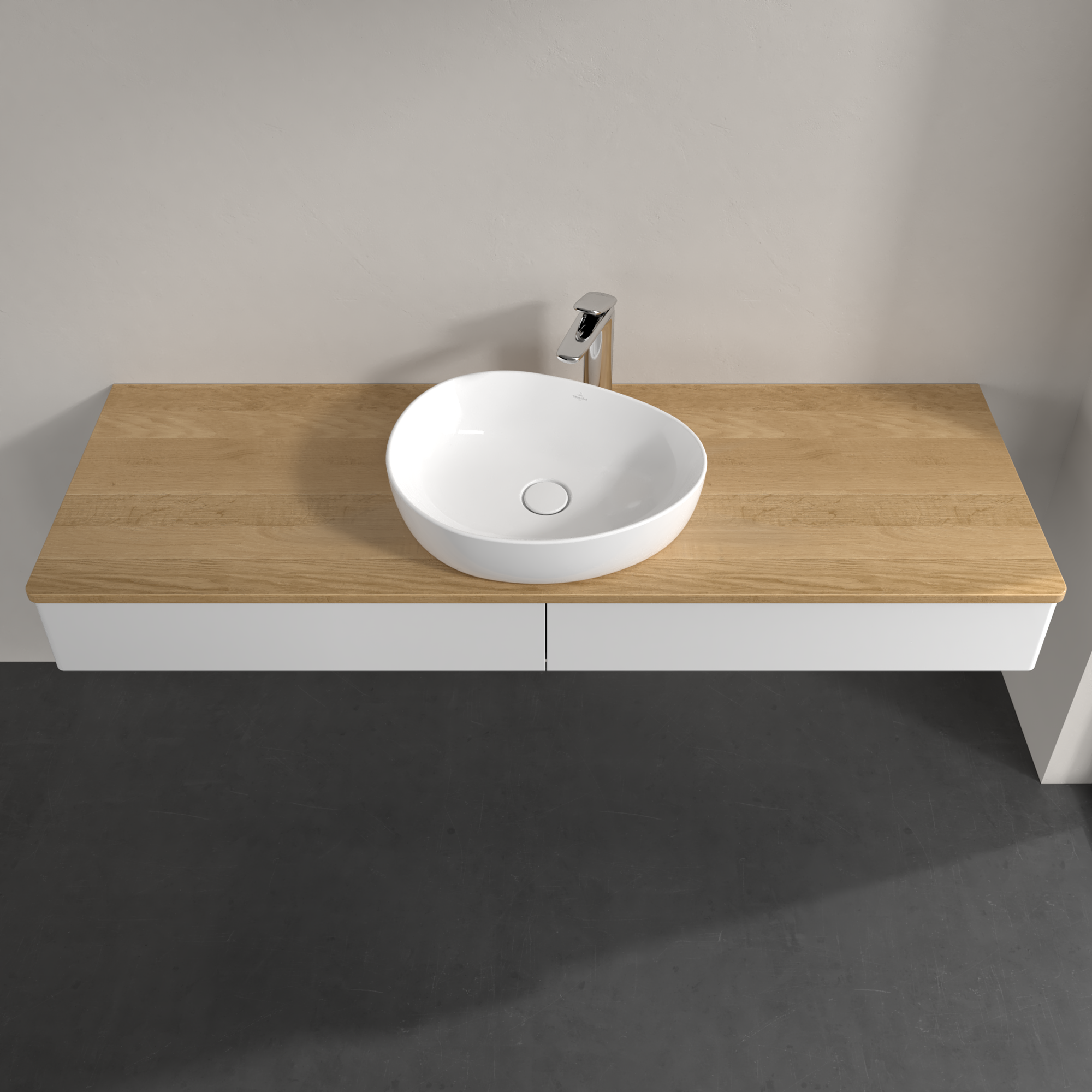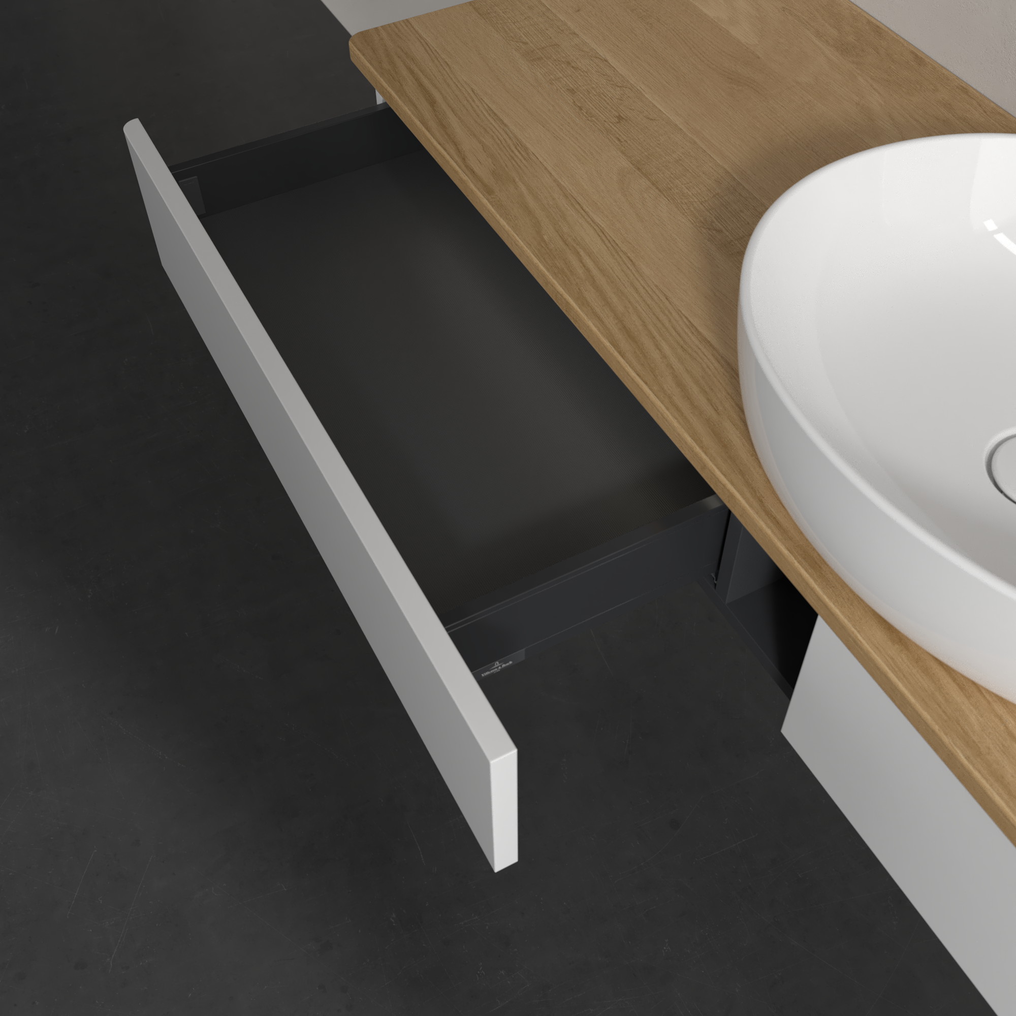 Antao Meuble sous plan, avec éclairage, 2 tiroirs sur rails, 1600x190x500mm, Façade sans structure, Caisson: Glossy White Lacquer, Façade: Glossy White Lacquer, Plaque de recouvrement: Honey Oak
