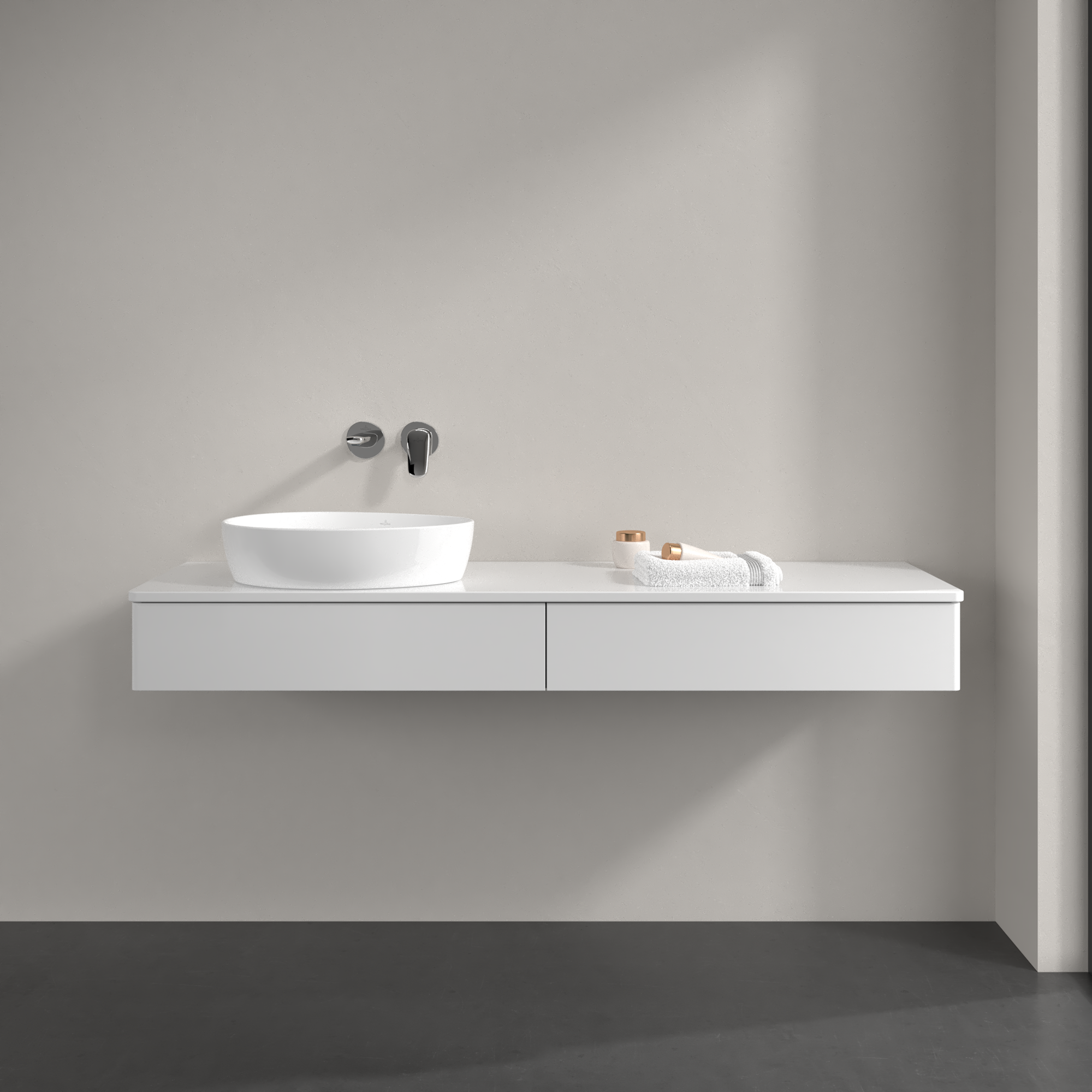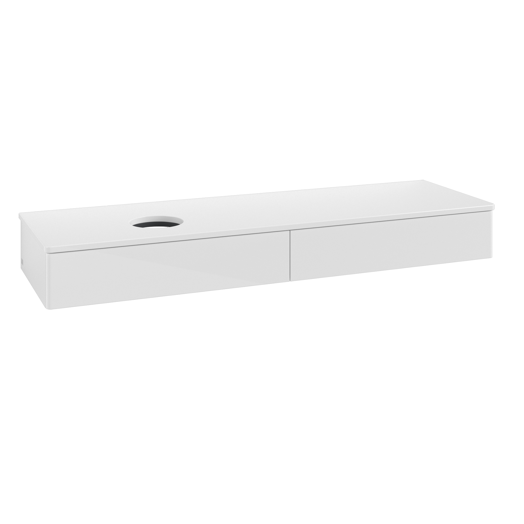 Antao Meuble sous plan, avec éclairage, 2 tiroirs sur rails, 1600x190x500mm, Façade sans structure, Caisson: Glossy White Lacquer, Façade: Glossy White Lacquer, Plaque de recouvrement: Glossy White Lacquer
