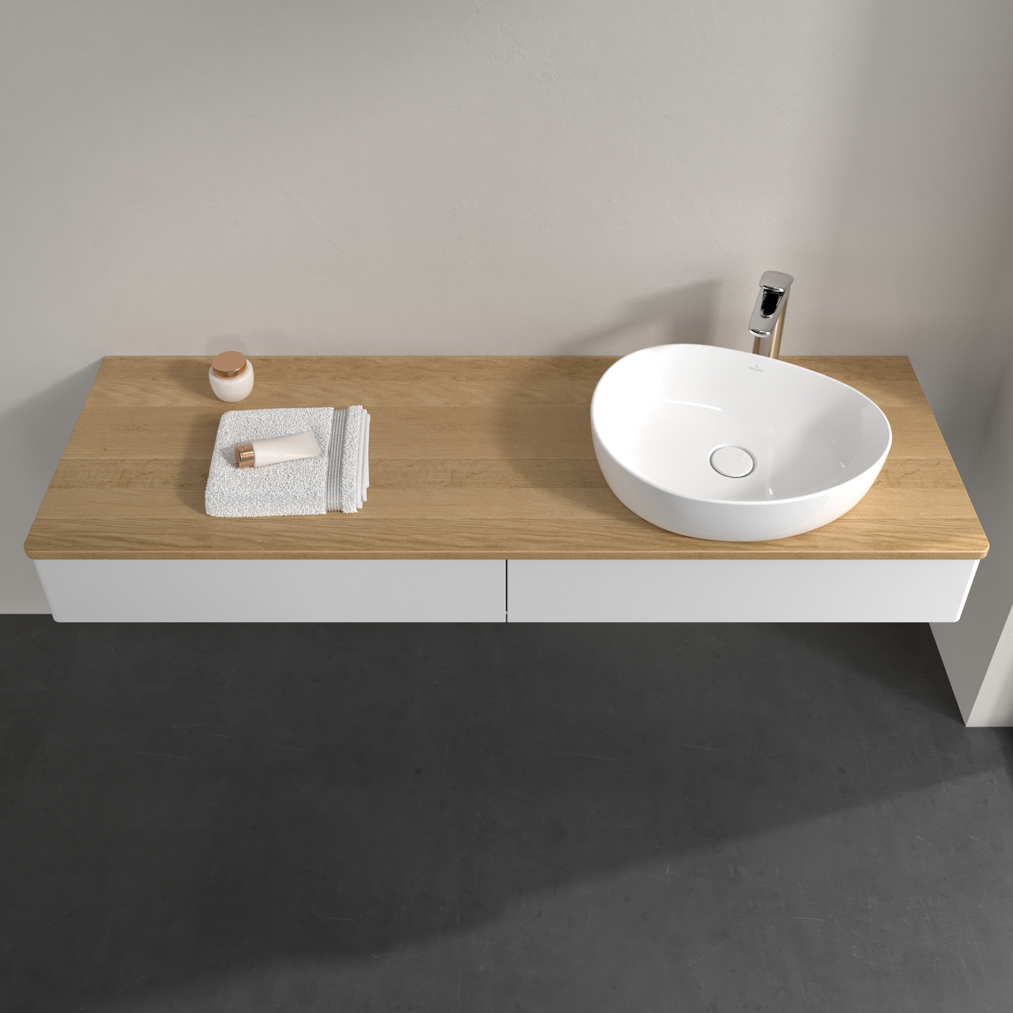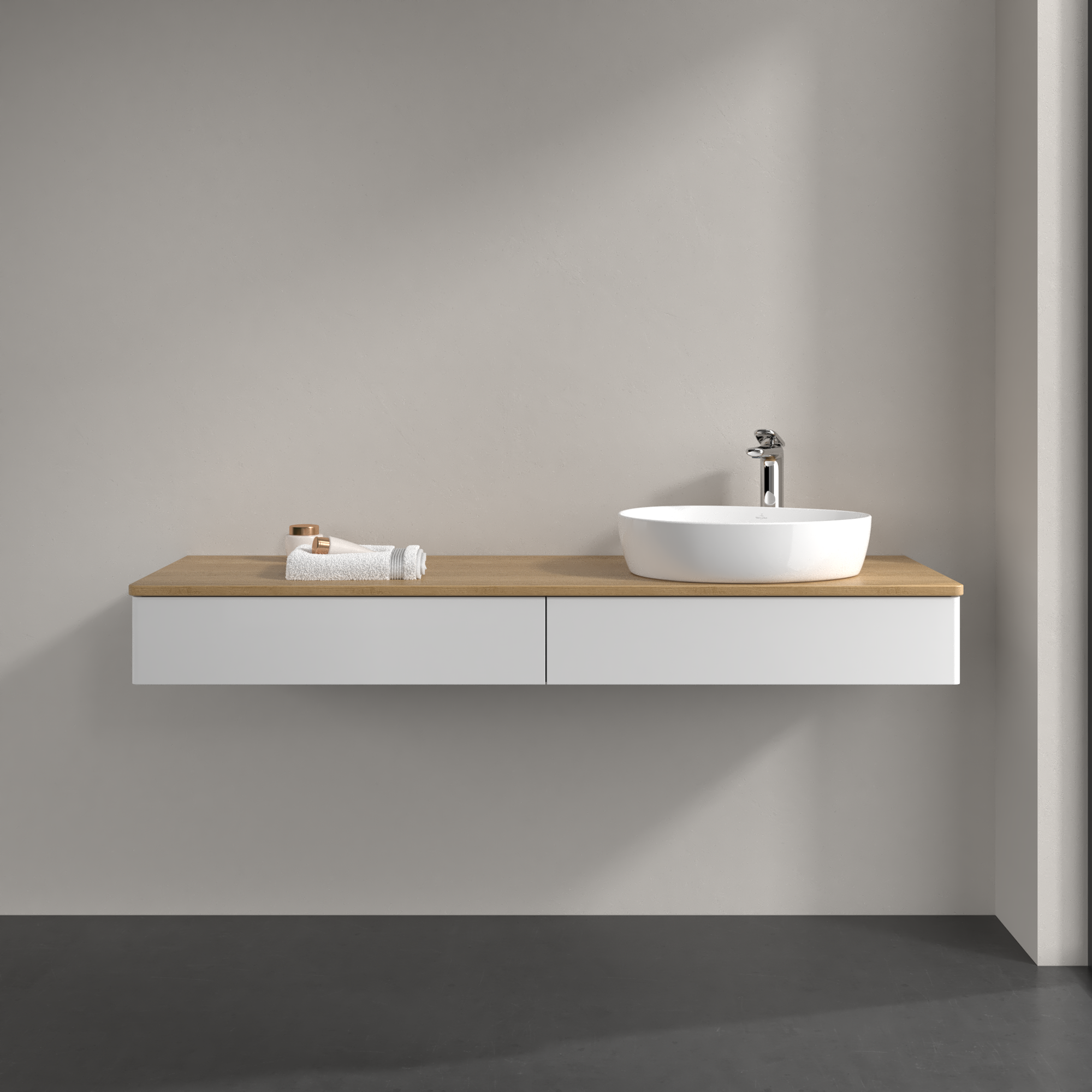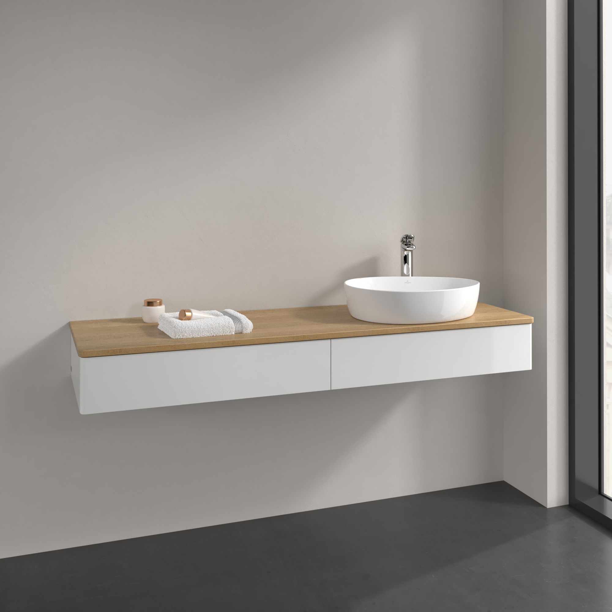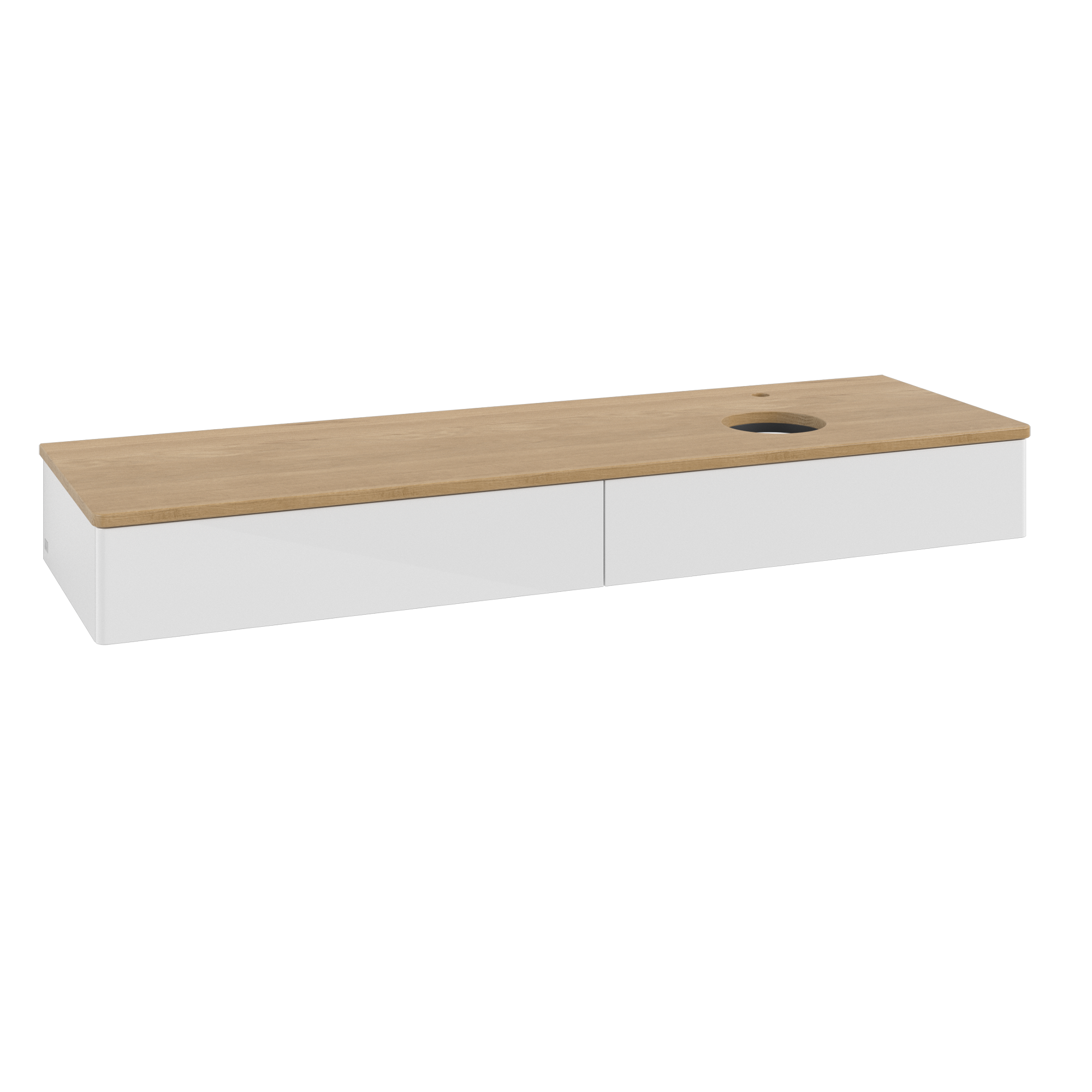Antao Meuble sous plan, avec éclairage, 2 tiroirs sur rails, 1600x190x500mm, Façade sans structure, Caisson: Glossy White Lacquer, Façade: Glossy White Lacquer, Plaque de recouvrement: Honey Oak
