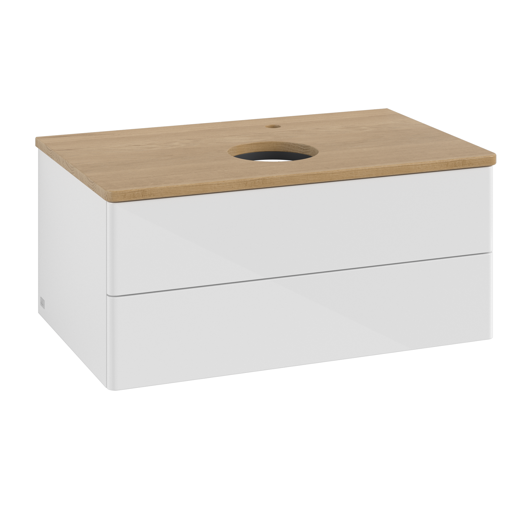 Antao Meuble sous plan, avec éclairage, 2 tiroirs sur rails, 800x360x500mm, Façade sans structure, Caisson: Glossy White Lacquer, Façade: Glossy White Lacquer, Plaque de recouvrement: Honey Oak