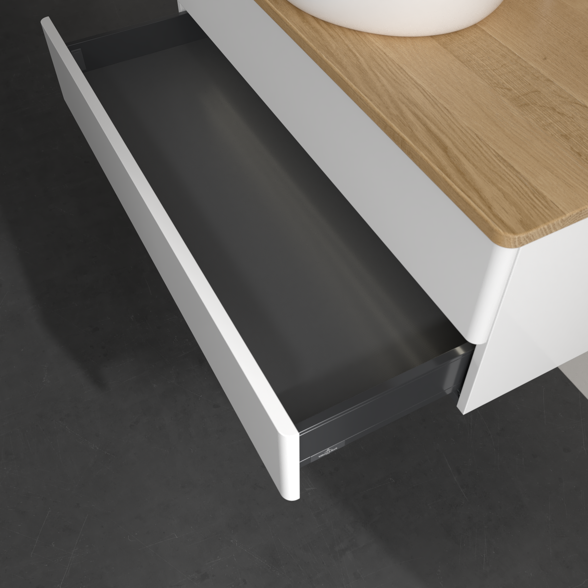 Antao Meuble sous plan, avec éclairage, 2 tiroirs sur rails, 1000x360x500mm, Façade sans structure, Caisson: Glossy White Lacquer, Façade: Glossy White Lacquer, Plaque de recouvrement: Honey Oak