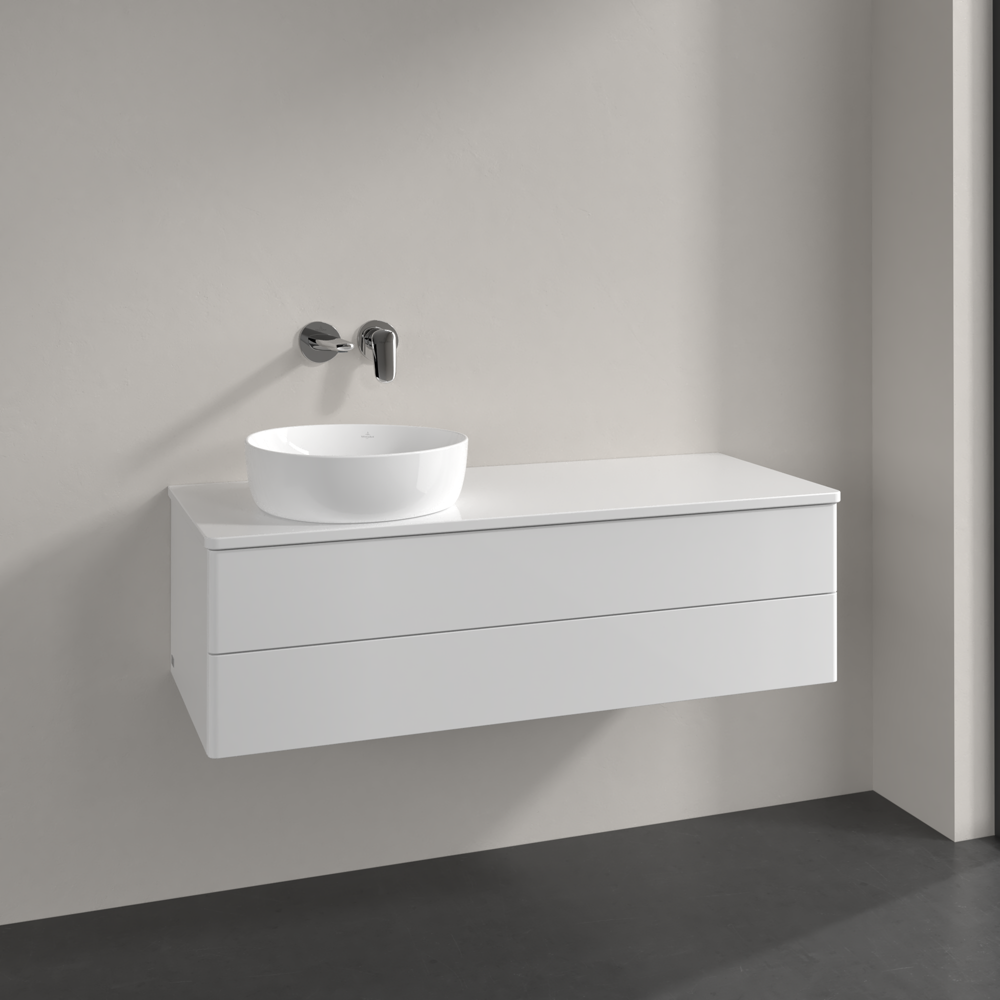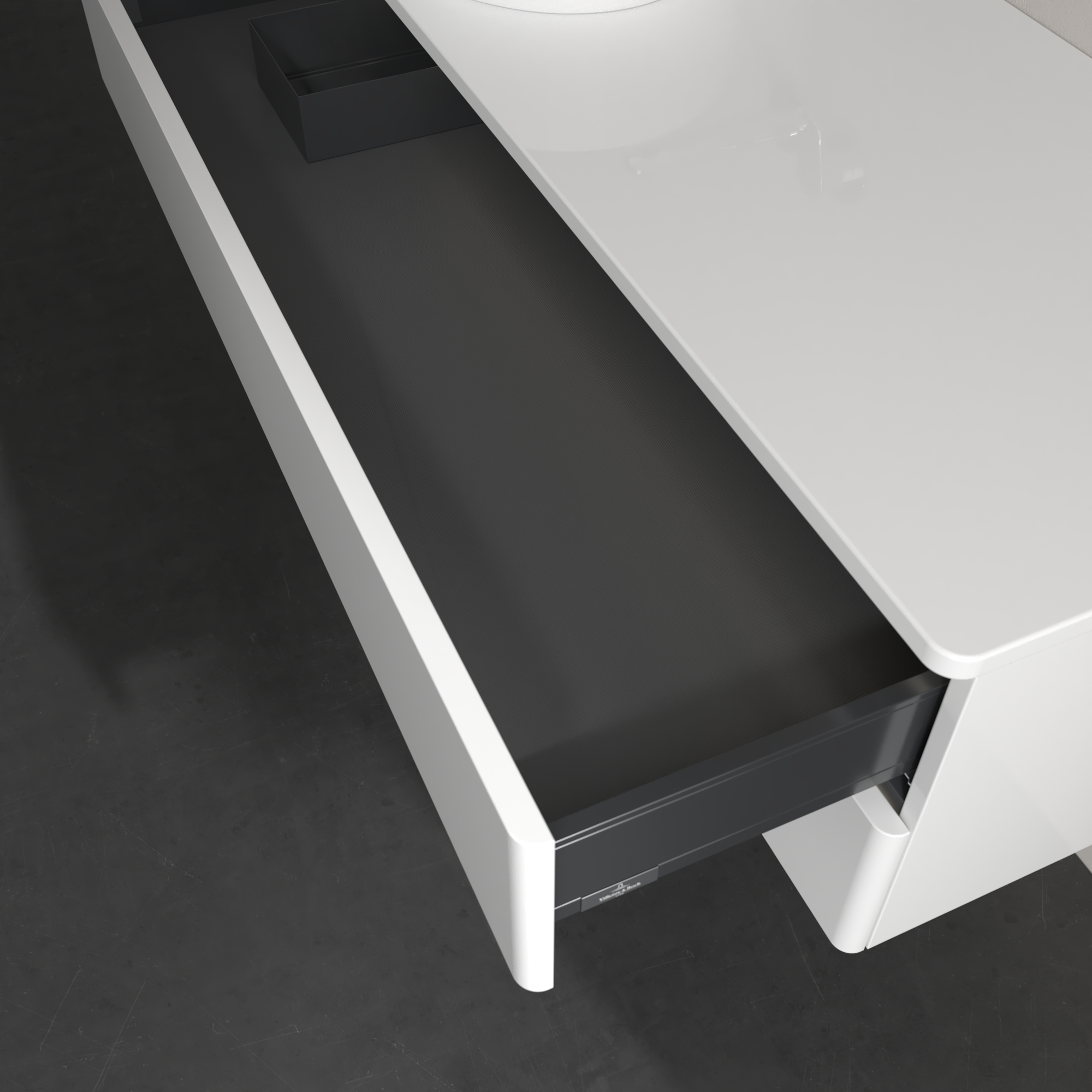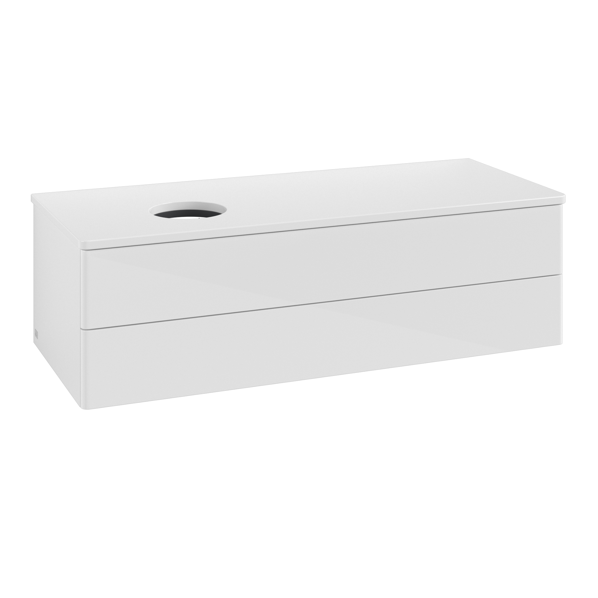 Antao Meuble sous plan, avec éclairage, 2 tiroirs sur rails, 1200x360x500mm, Façade sans structure, Caisson: Glossy White Lacquer, Façade: Glossy White Lacquer, Plaque de recouvrement: Glossy White Lacquer